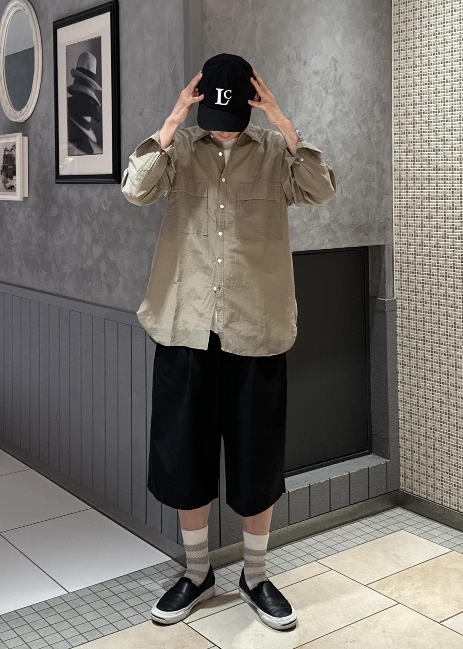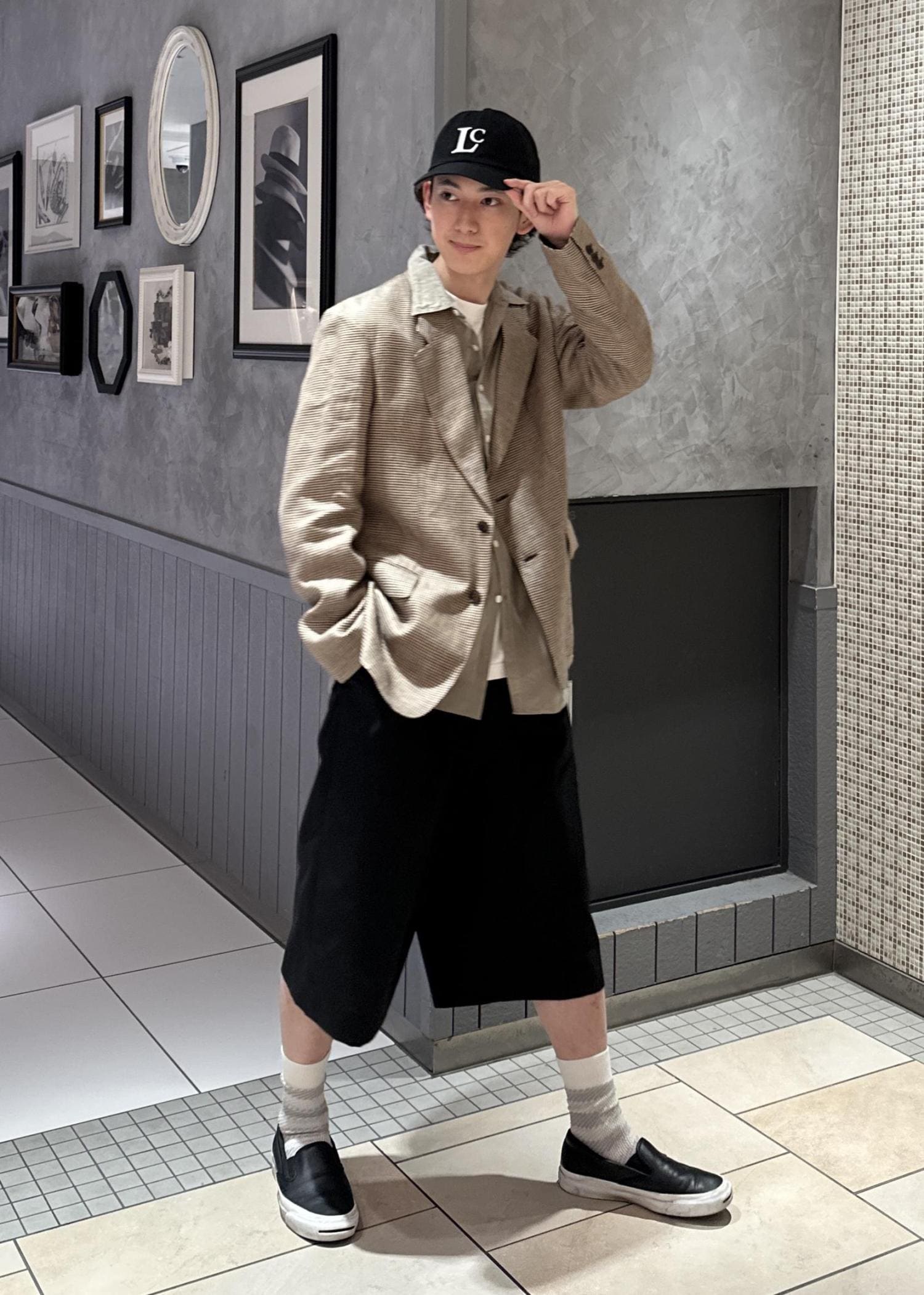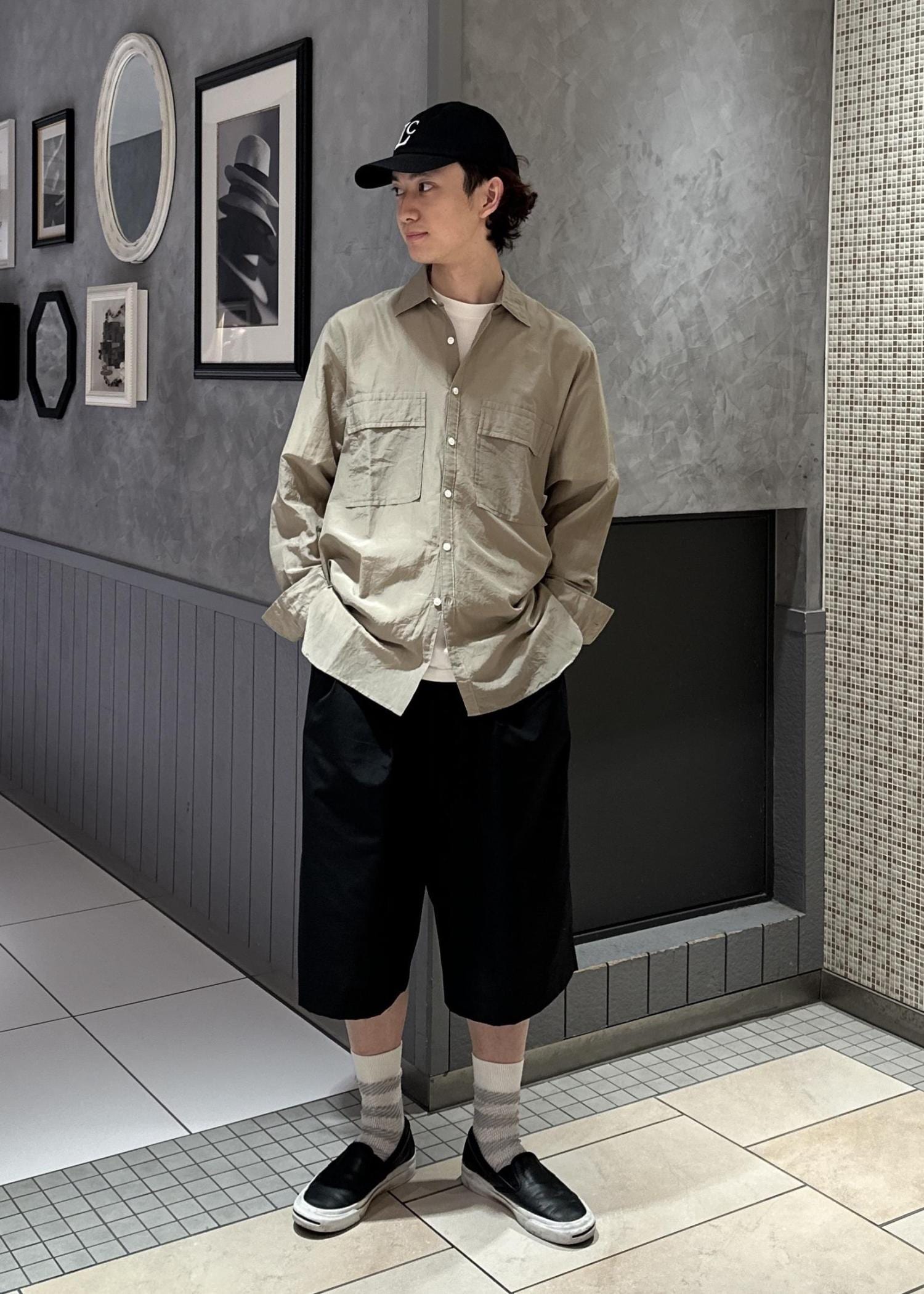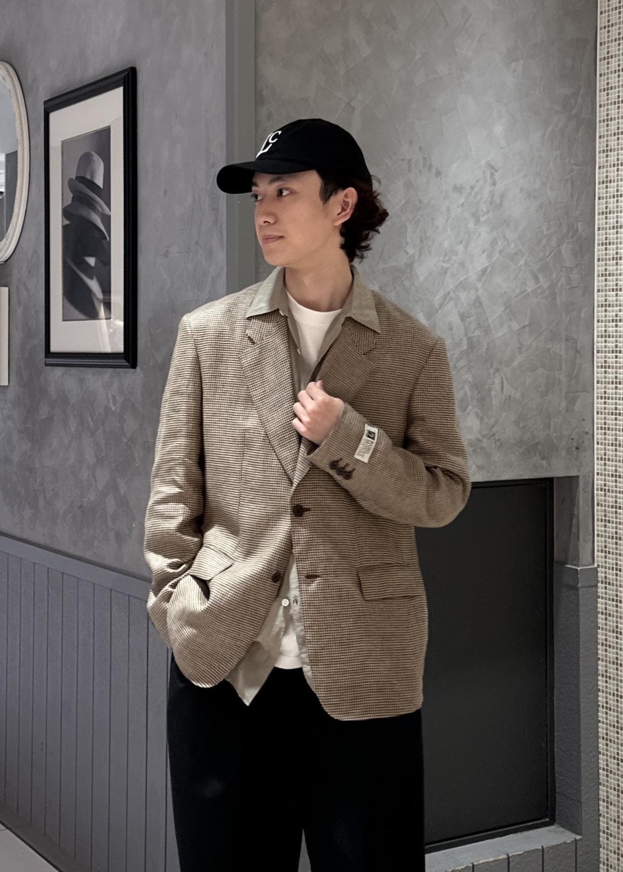 テーラードジャケットにショーツを合わせてラフな印象にしてみました。キャップで更にカジュアルな見え方にし、シャツをインナーに着ることでバランスをとりました。似た色を組み合わせて、少しレトロな感じにしてみました。