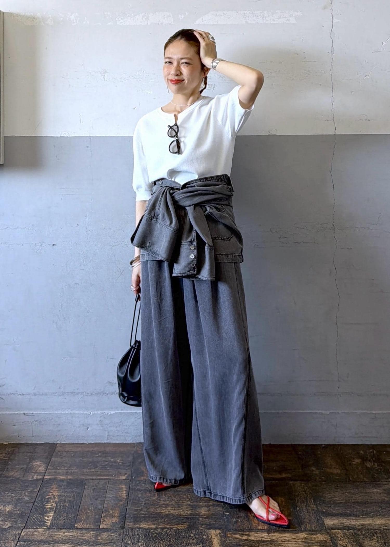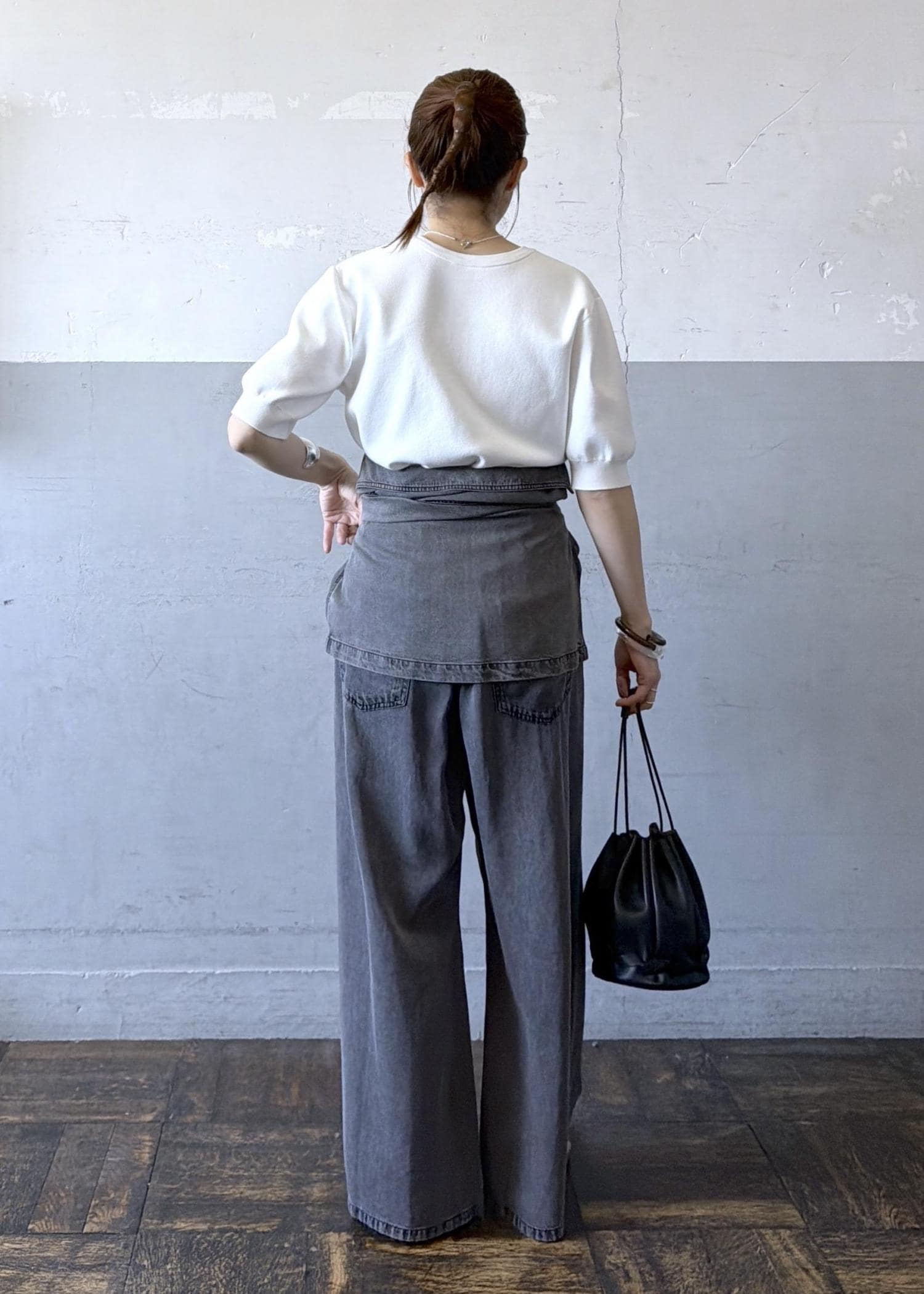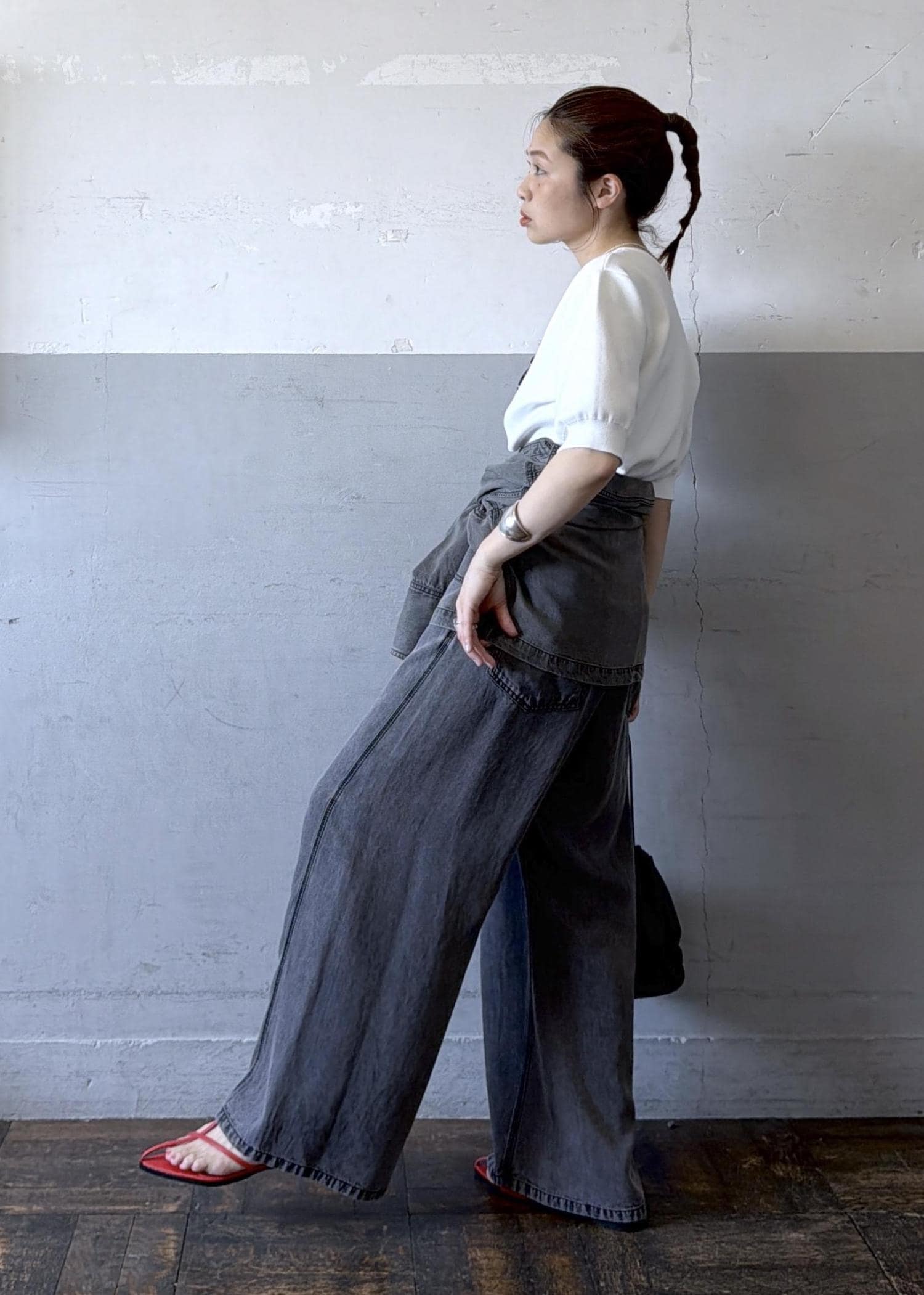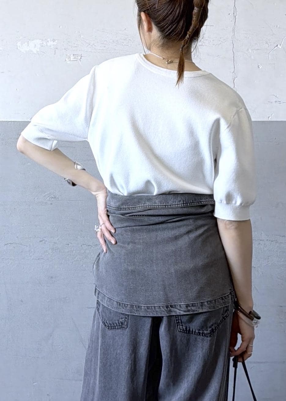 シンプル過ぎたのでセットアップでご用意のあるシャツをスカート風に腰に巻いてポイントに。