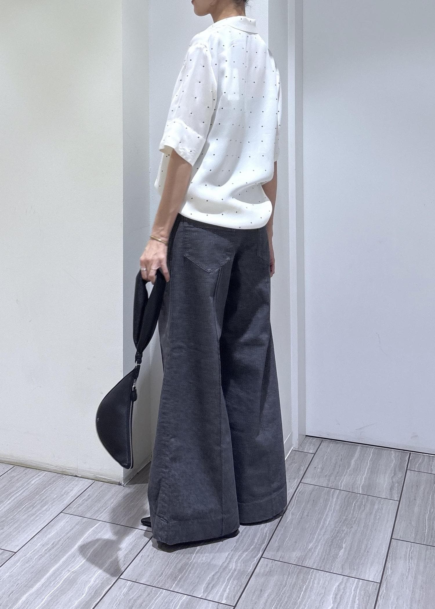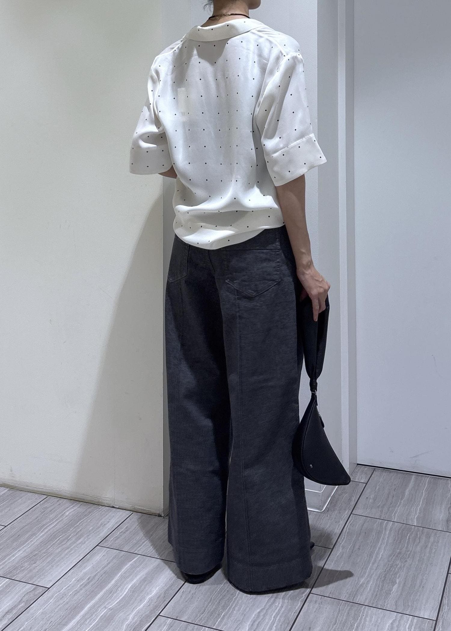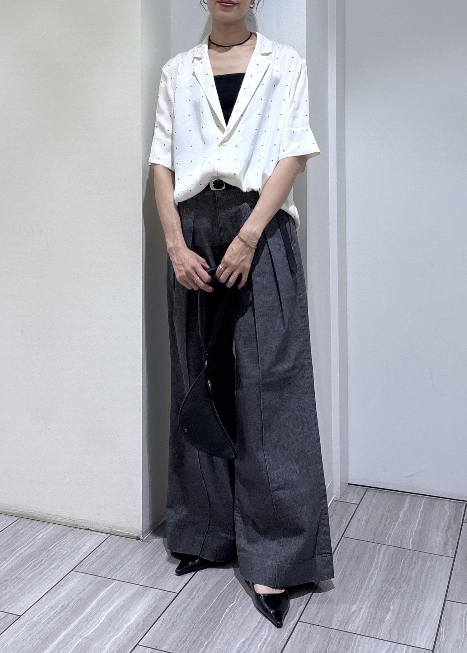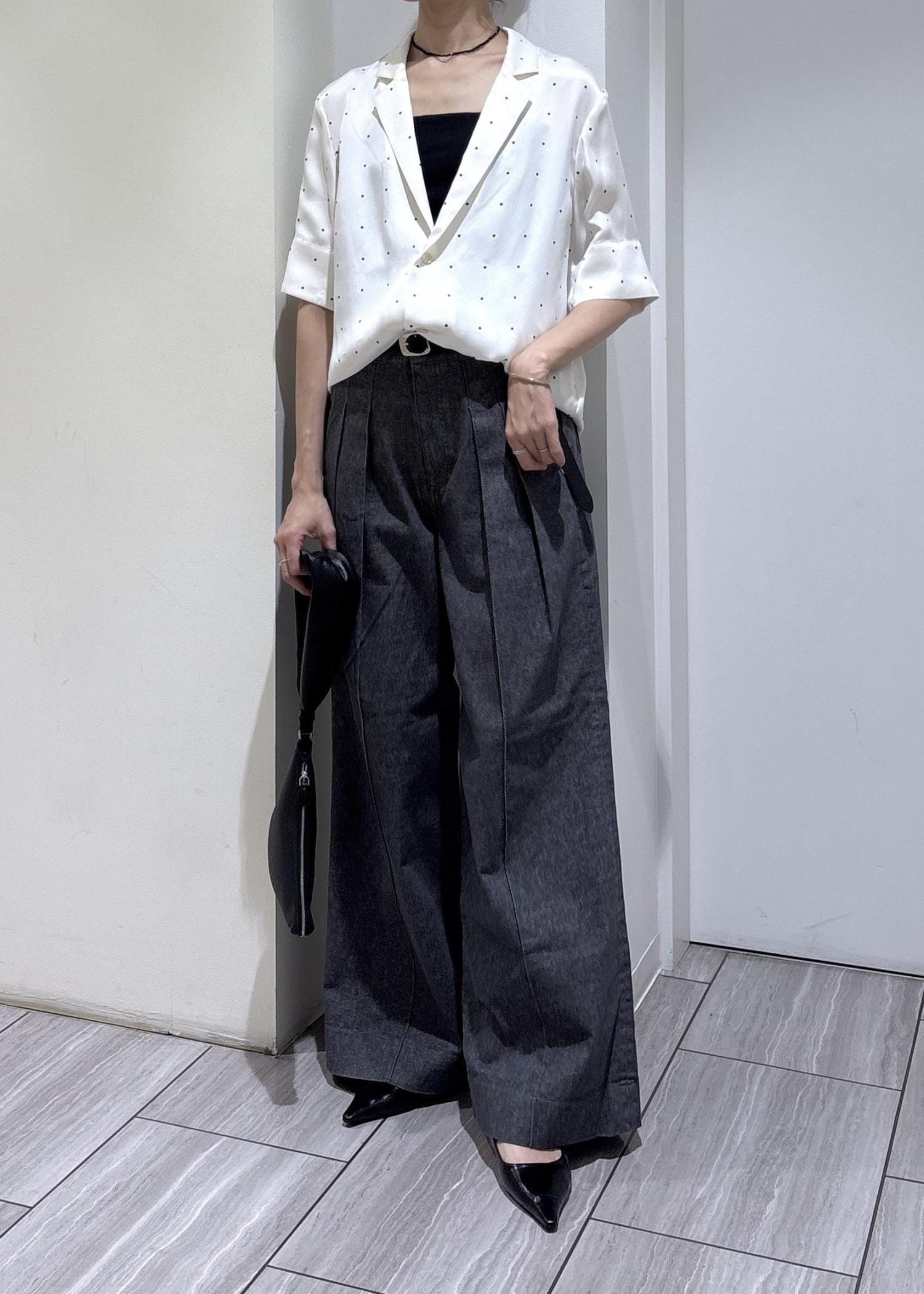 本日はEMOELLEの新作ドットシャツとデニムでスタイリングしました。