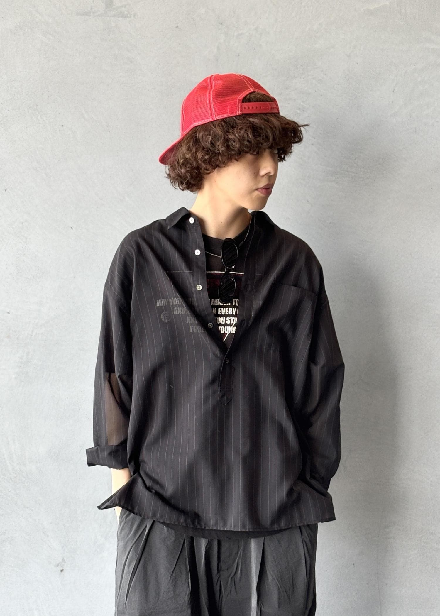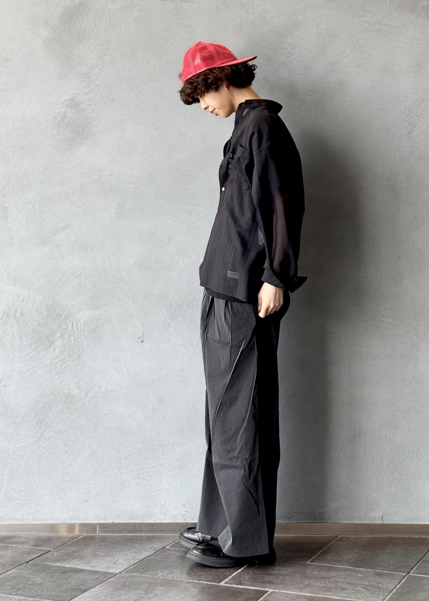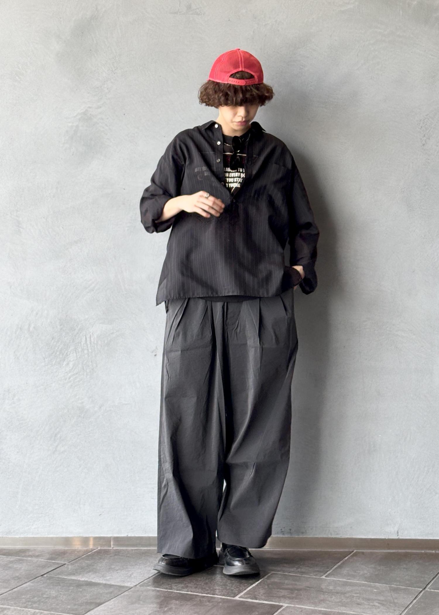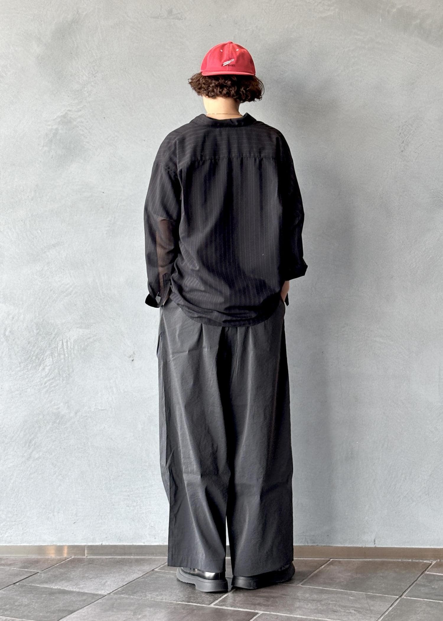 ADAMETROPÈのシアー素材のシャツを取り入れることで、黒特有の重たさを抑えつつ、抜け感と爽やかさをプラスしています。