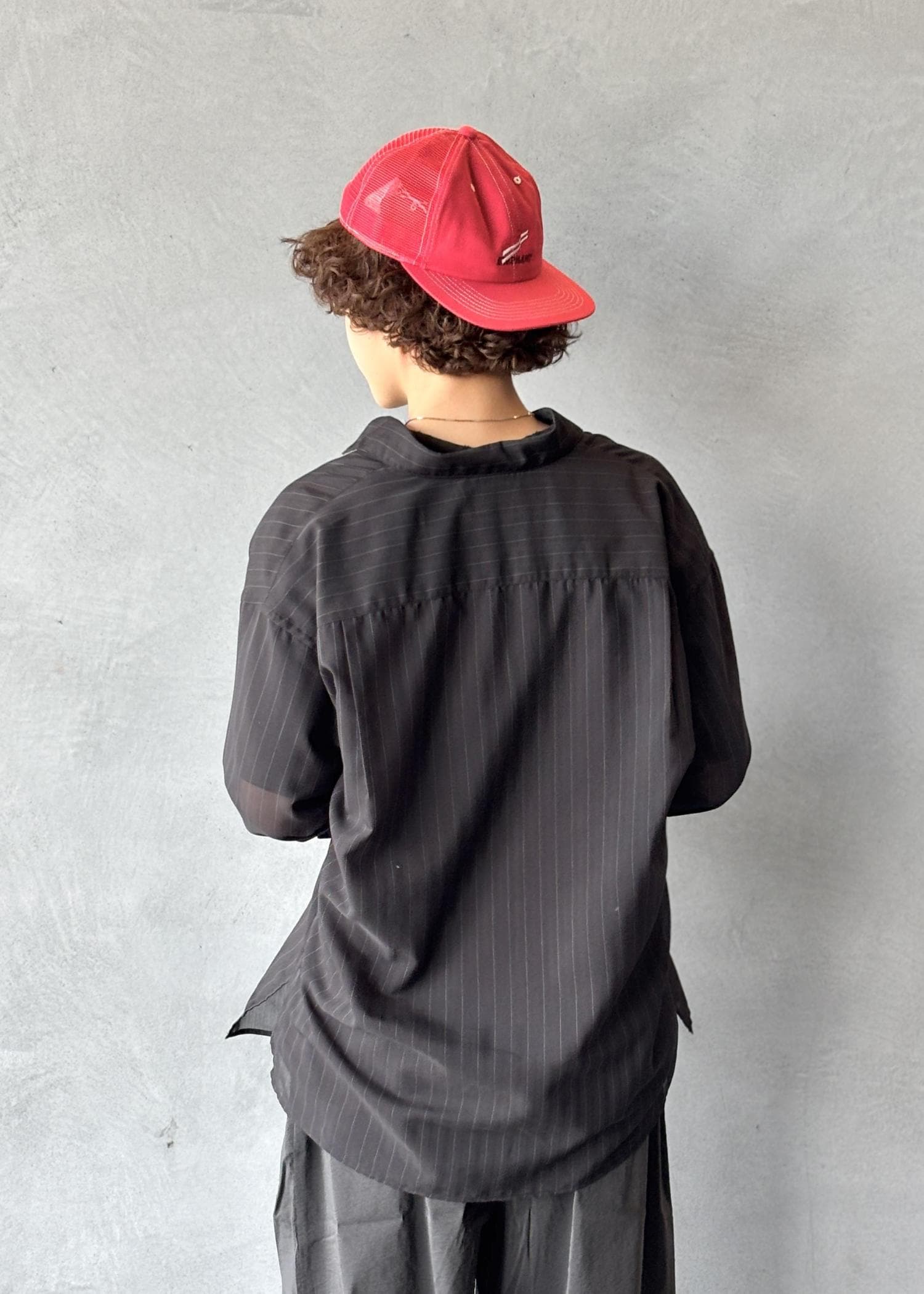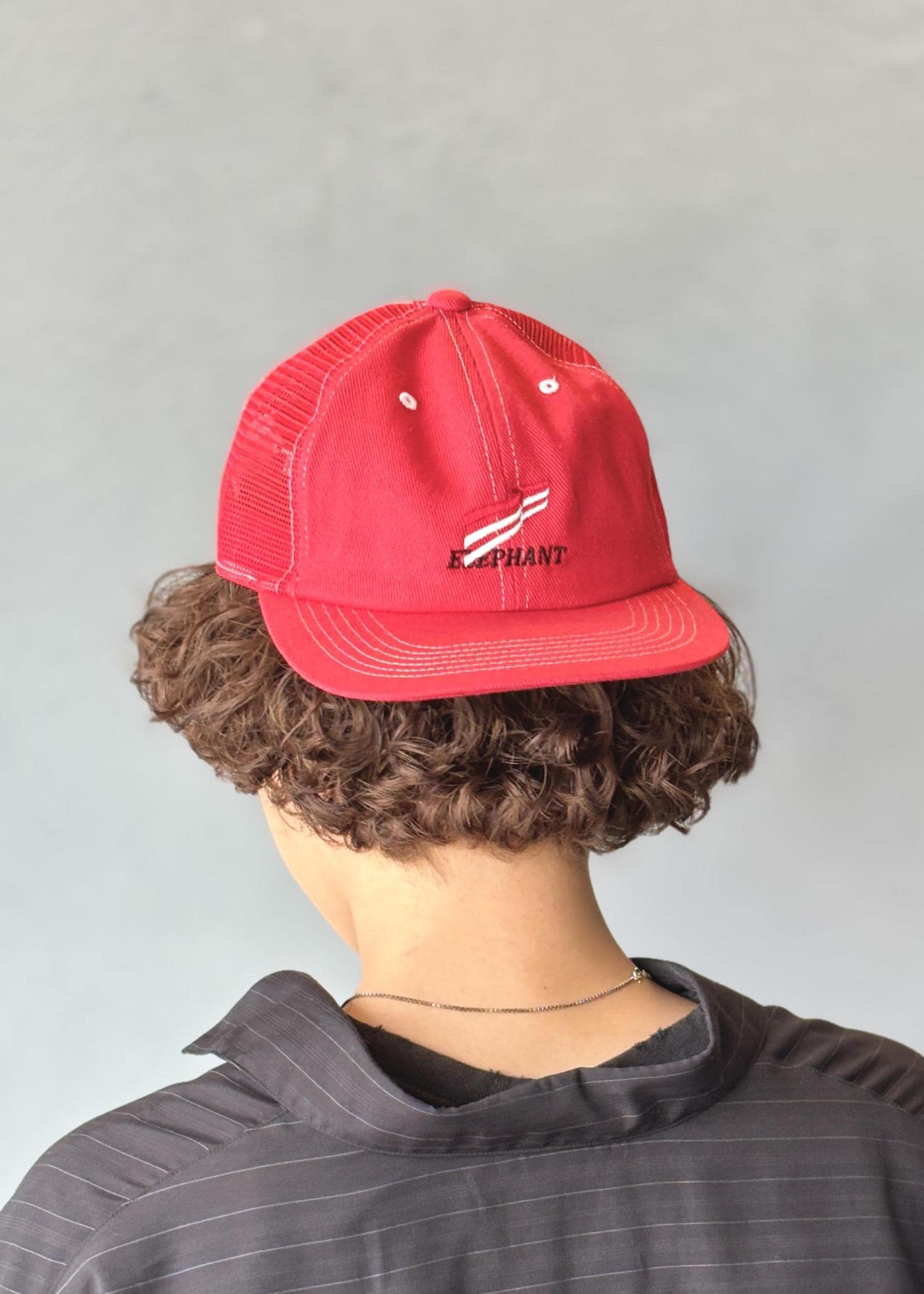 全体が落ち着いたトーンだからこそ、elephantTRIBALfabricsのメッシュキャップの赤を差し色に。シンプルながらも印象に残るバランスを意識しています。
