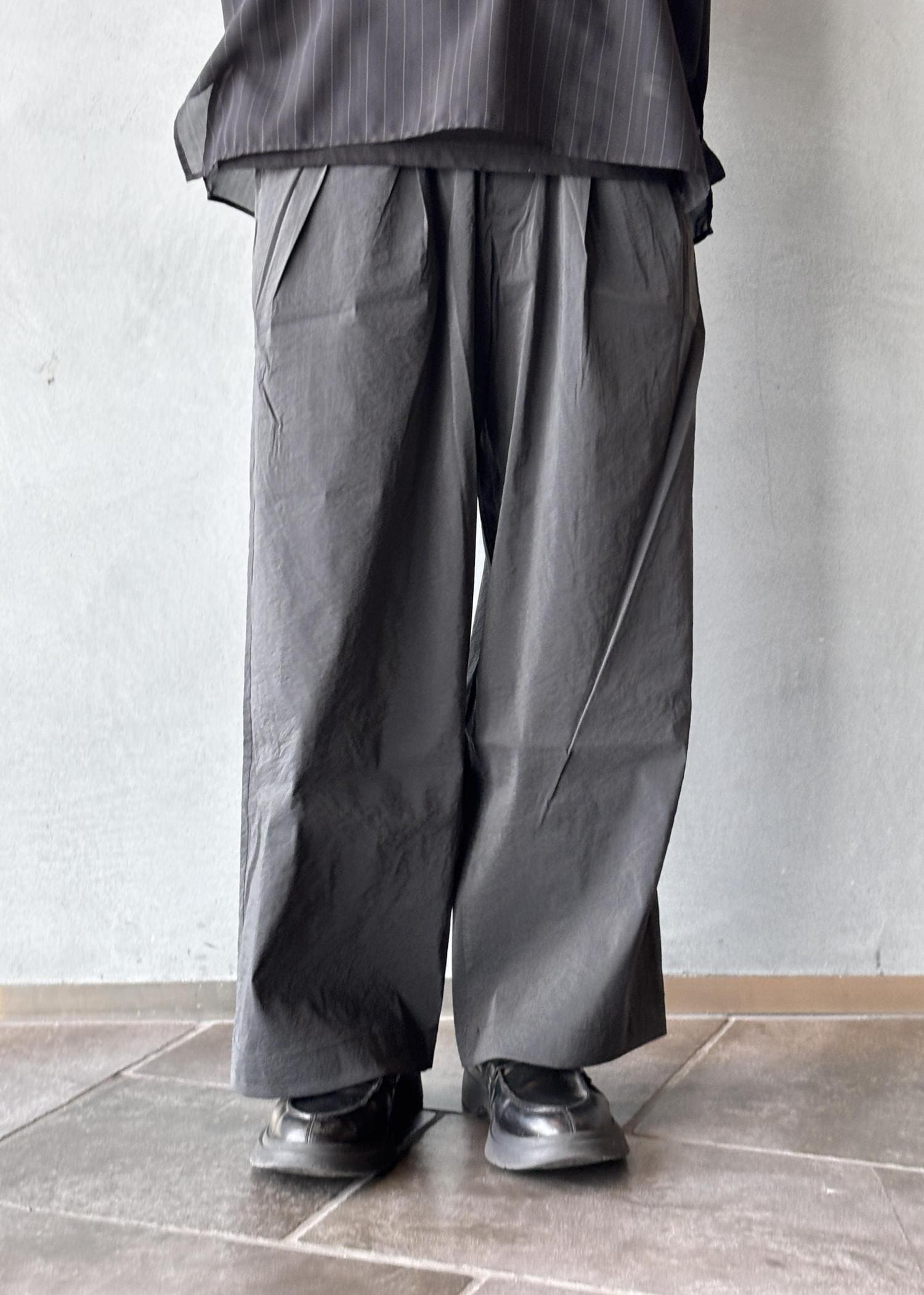 インナーにはFACCIESのフェード感のあるTシャツを合わせ、さりげないヴィンテージライクな雰囲気を演出。ボトムスは軽量なナイロンパンツを選ぶことで、機能性とリラックス感を両立しました。
