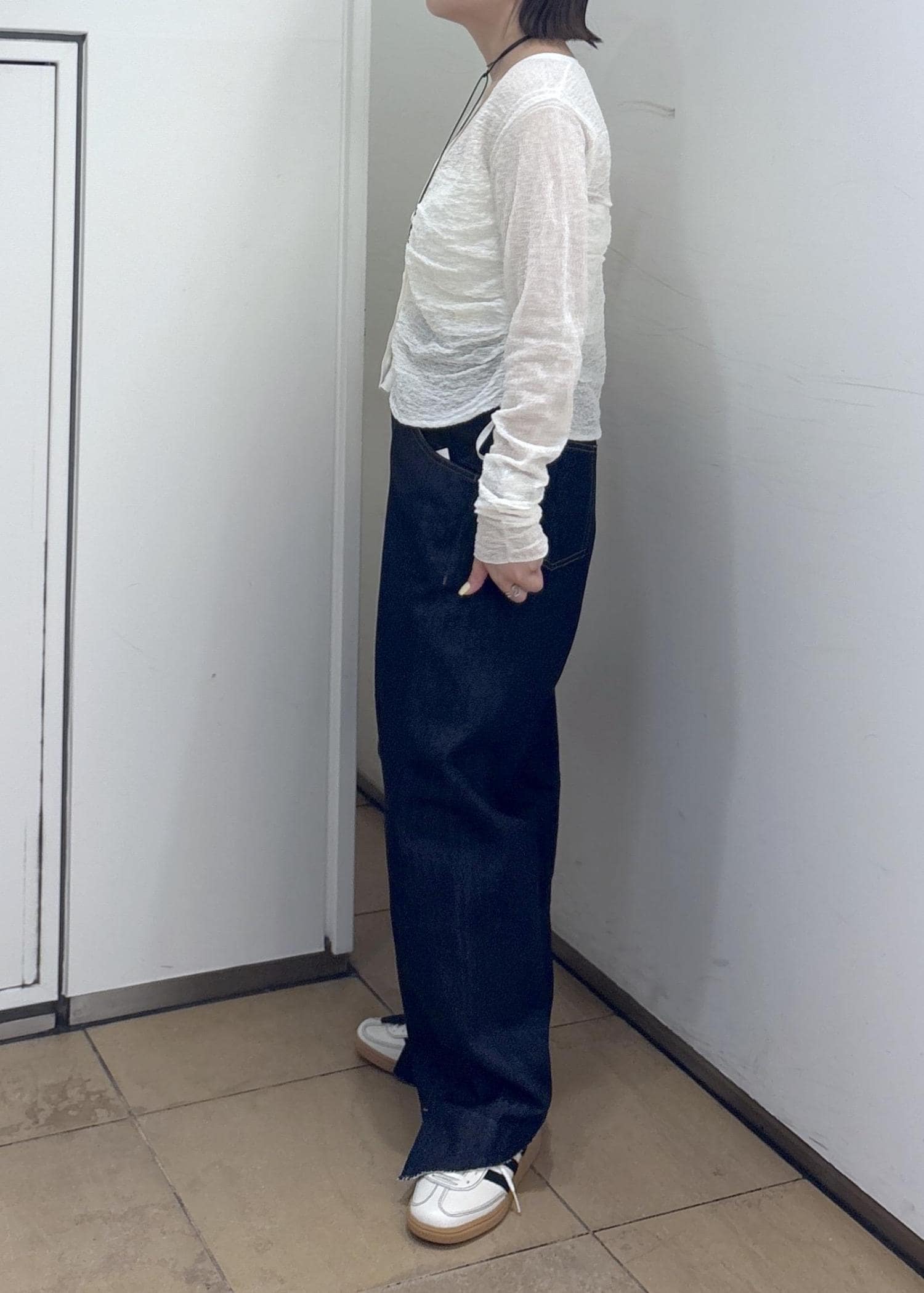 ややピタッとするサイズ感ですが、丈が短めなのでボトムスとのバランスが取りやすいです。 -