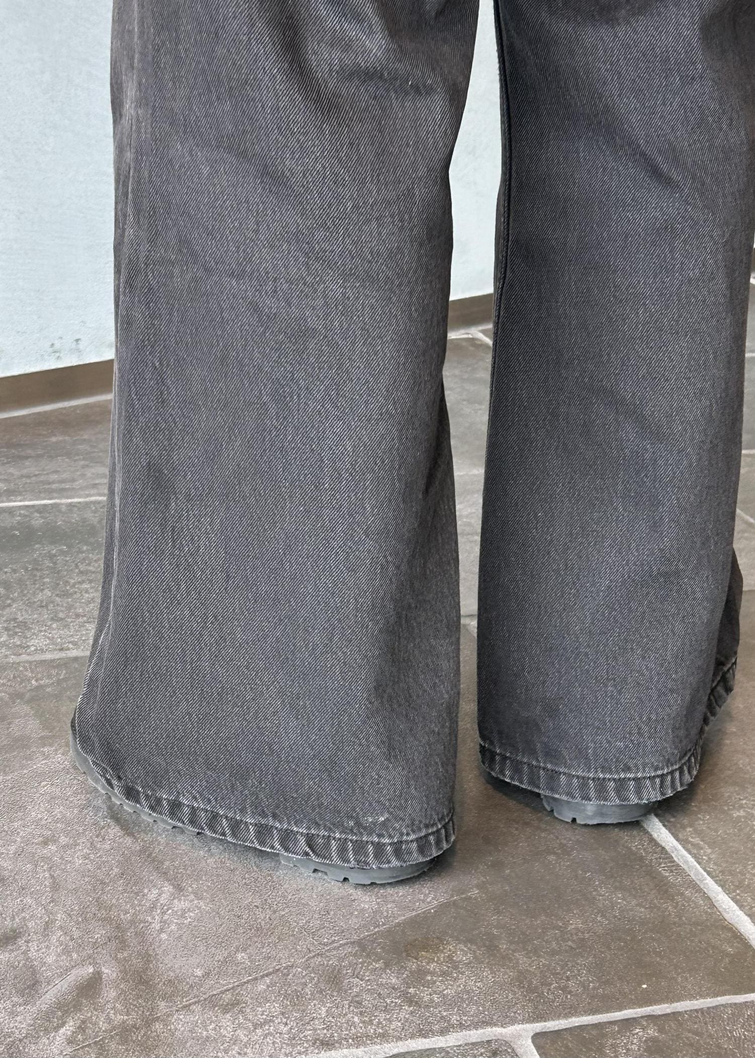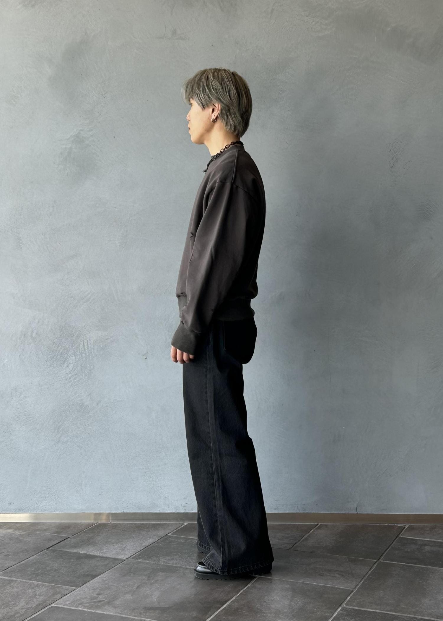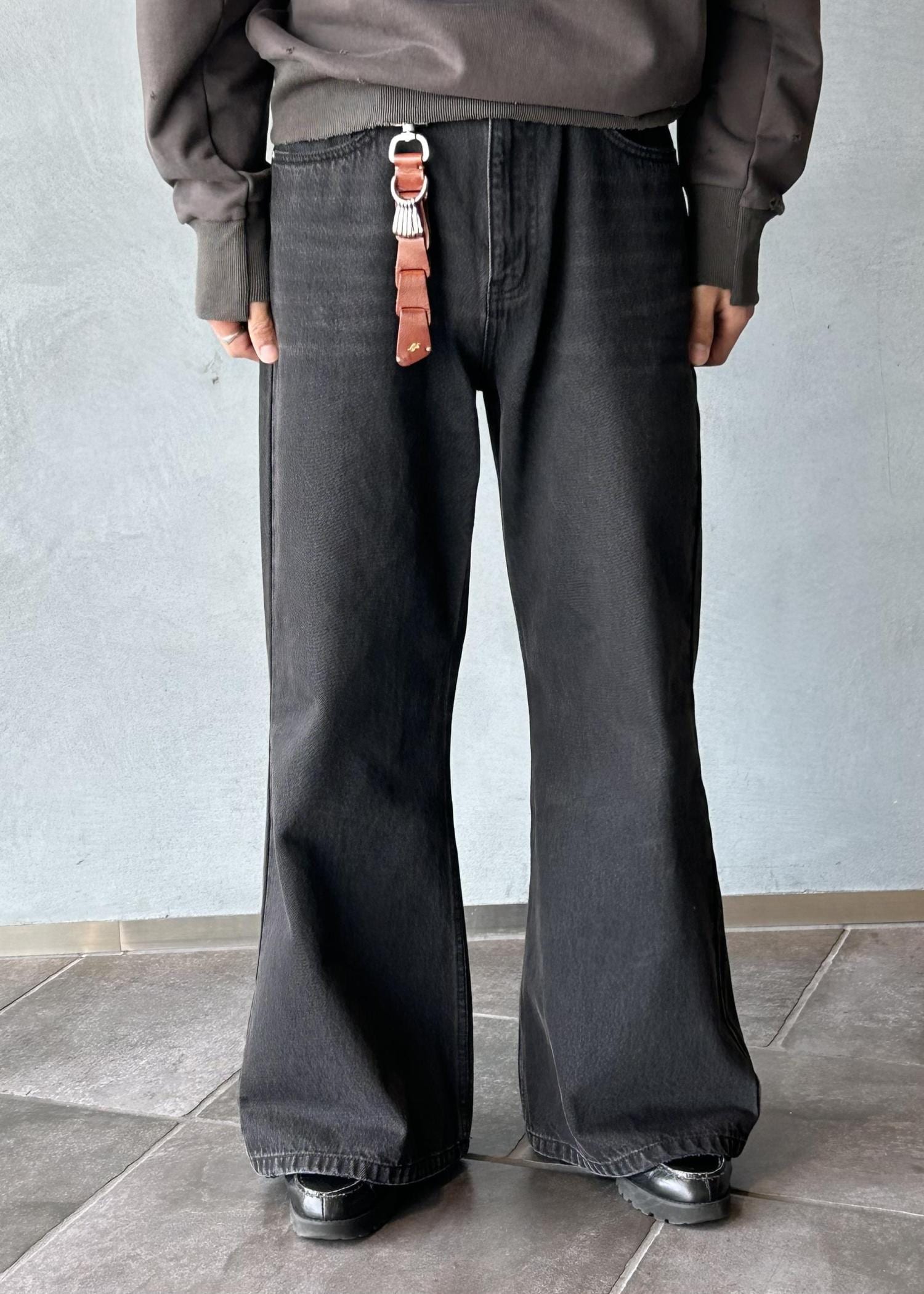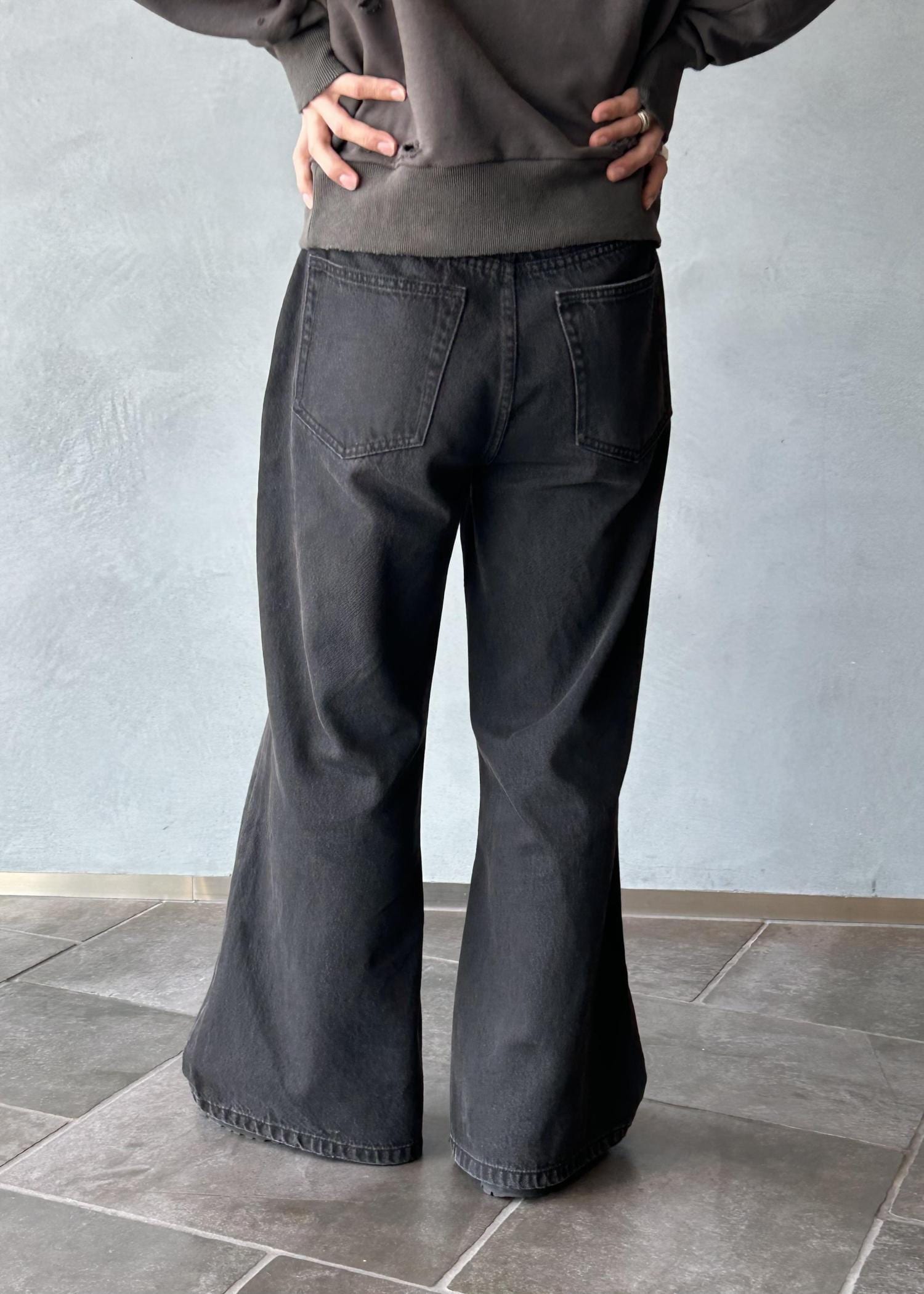 ワイドフレアのシルエットがうまくバランスを整えてくれるので、さらに緩いロンTやスウェットでも綺麗なスタイリングに仕上げてくれます。