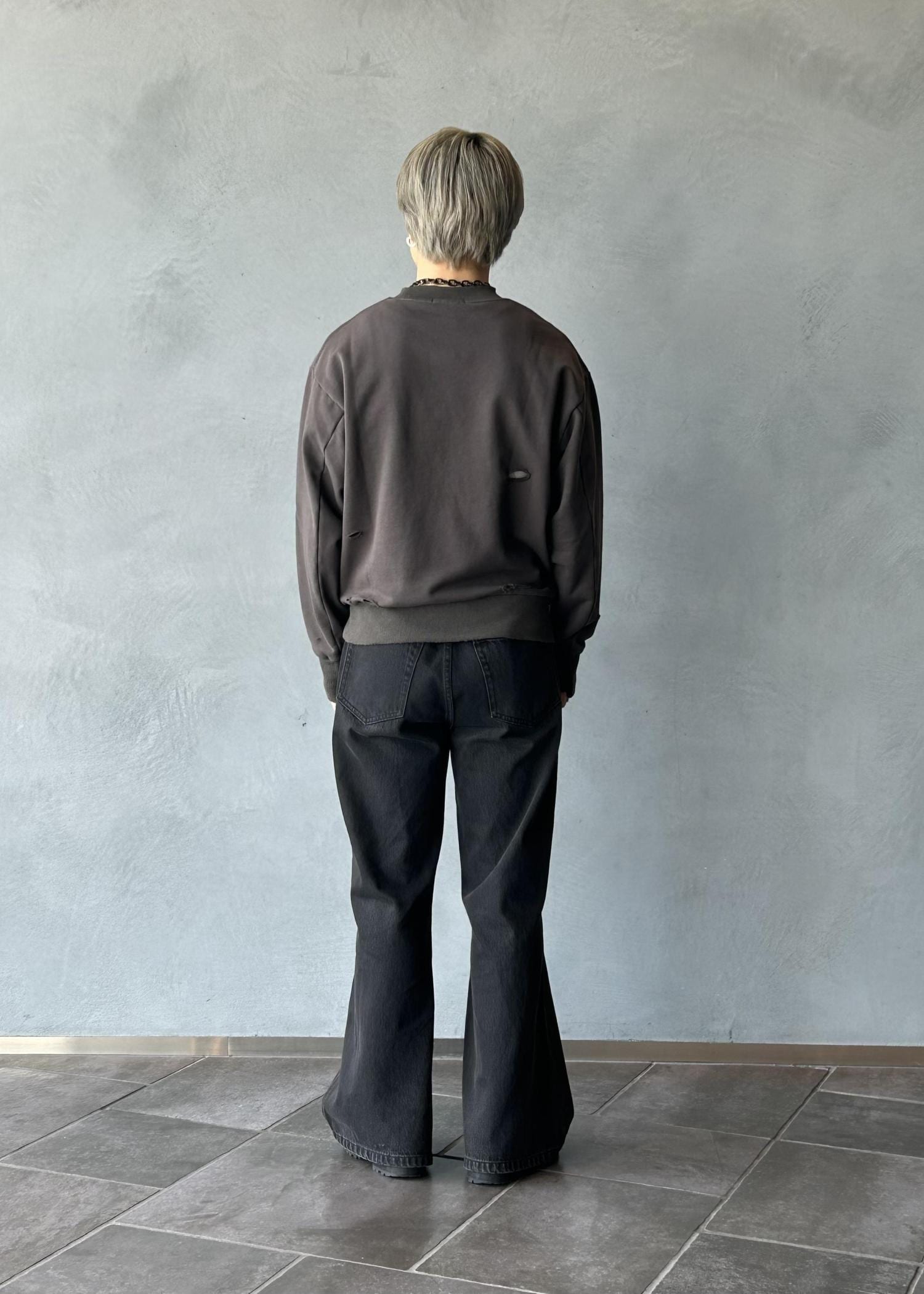 短丈の少し緩いシルエットのダメージスウェットと裾がかなり広いワイドフレアパンツを組み合わせたAラインシルエットを存分に楽しめるスタイリングです。