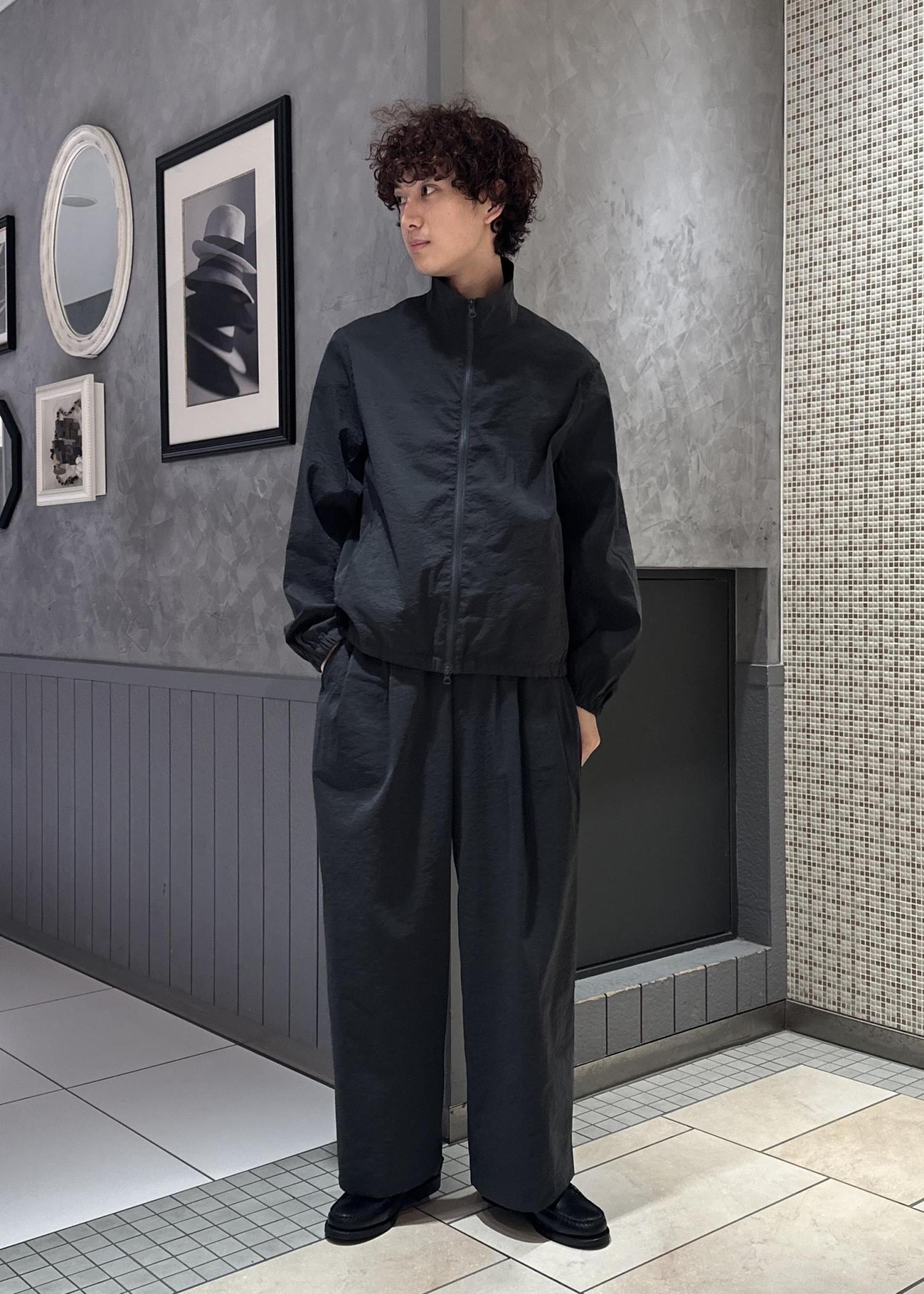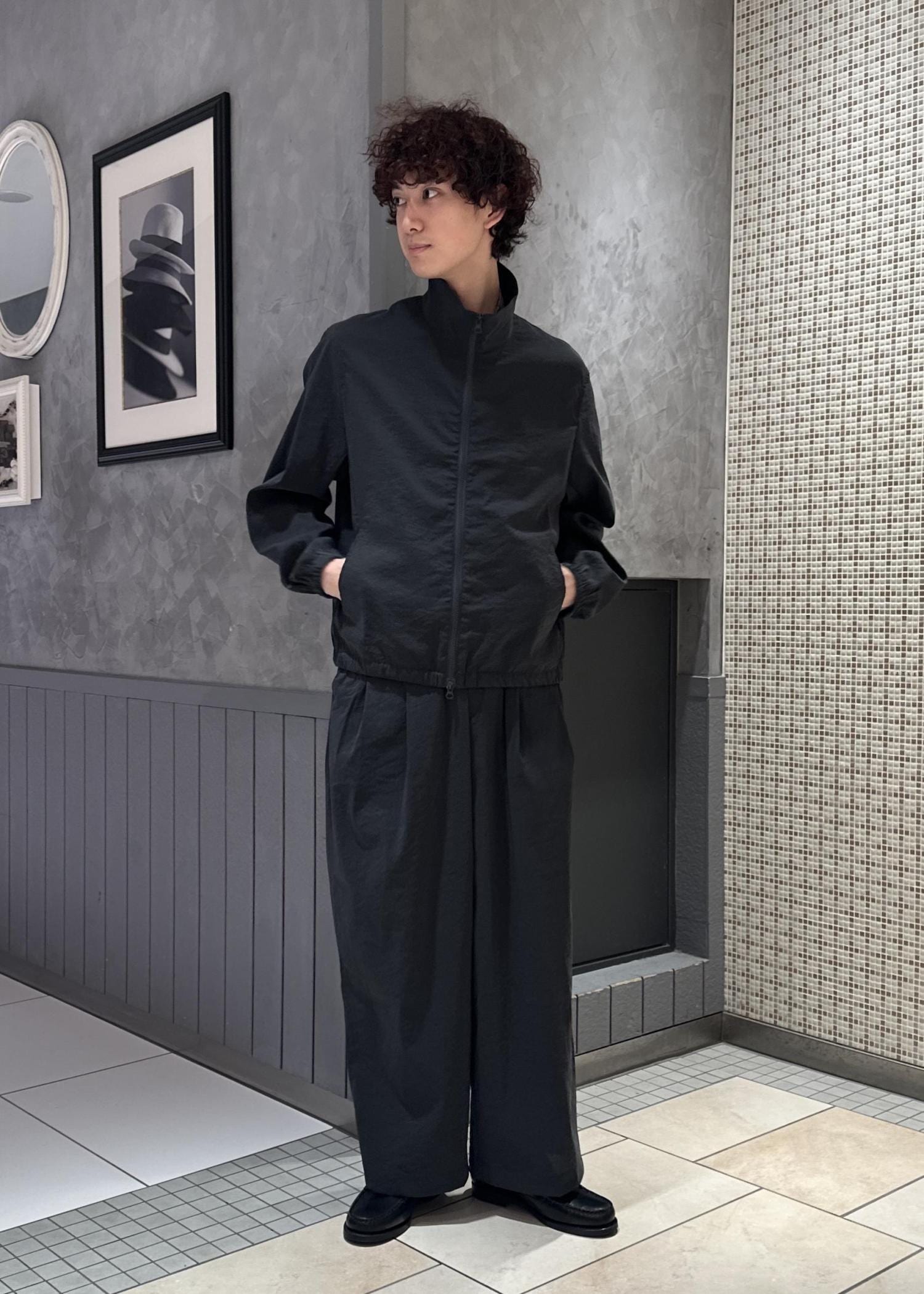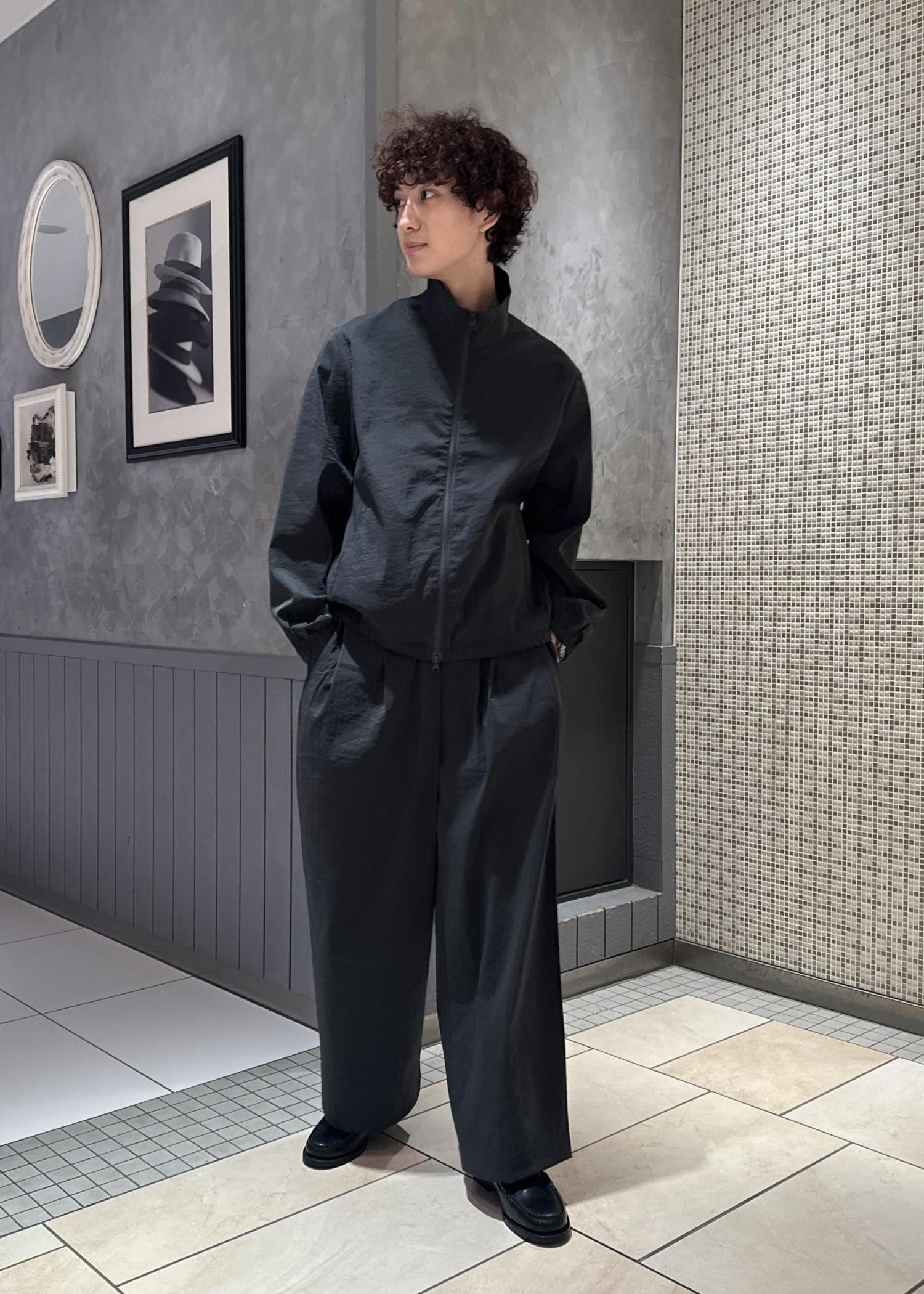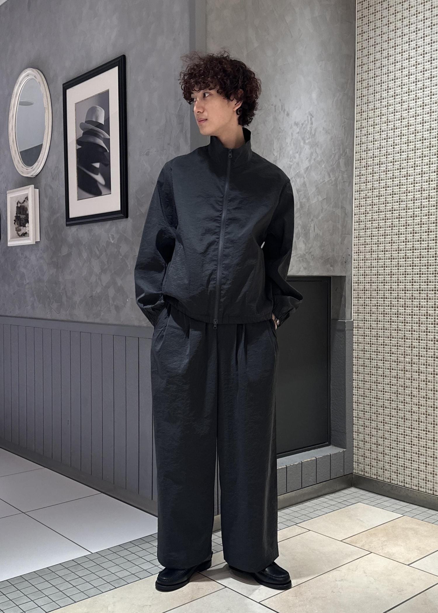 ナイロンのパンツ、ジップブルゾンのセットアップ。スポーティすぎないデザインで、クリーンな仕上がりなので、ローファーと合わせてキレイめに少し寄せてみました。とても軽やかな着心地でラフさも兼ね備えてます。暗めのモノトーンで統一し、ラフすぎず程よいカジュアルを意識しました。