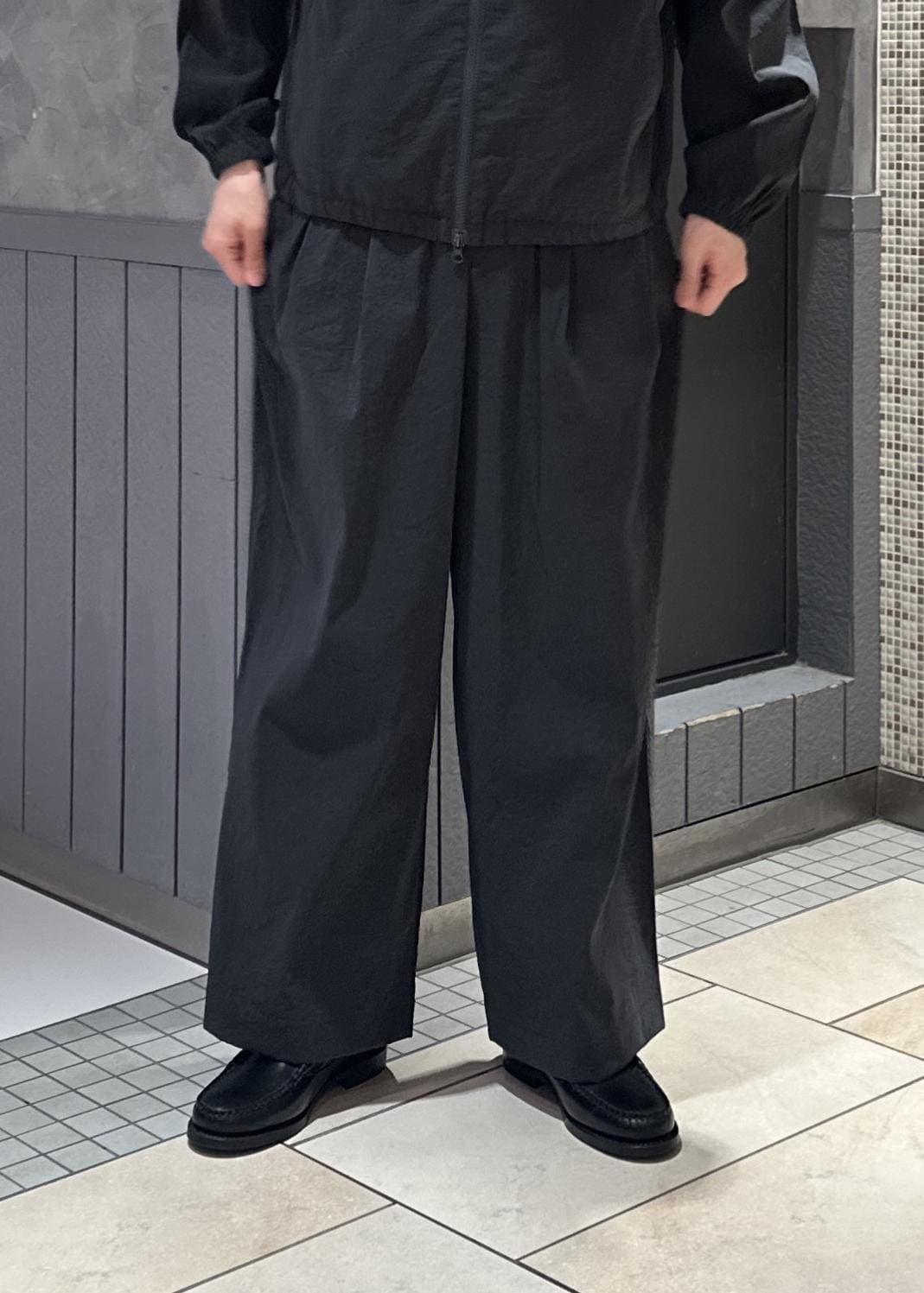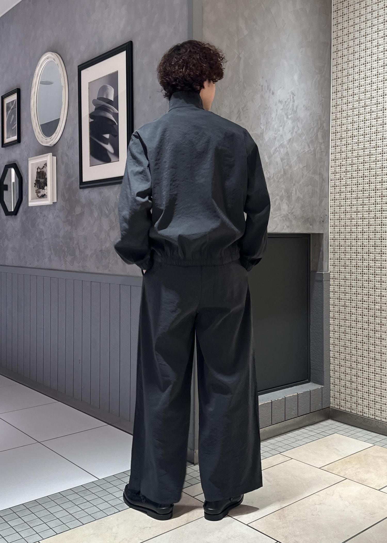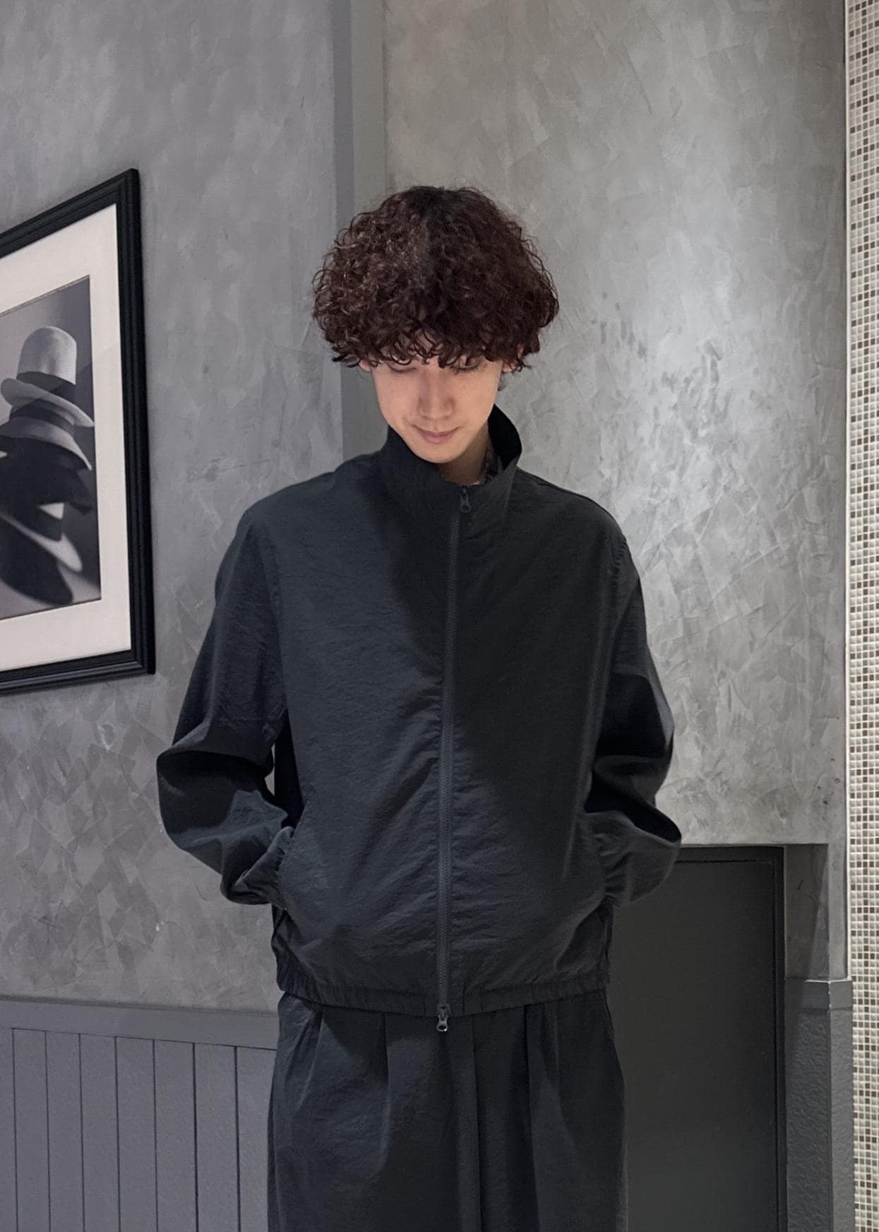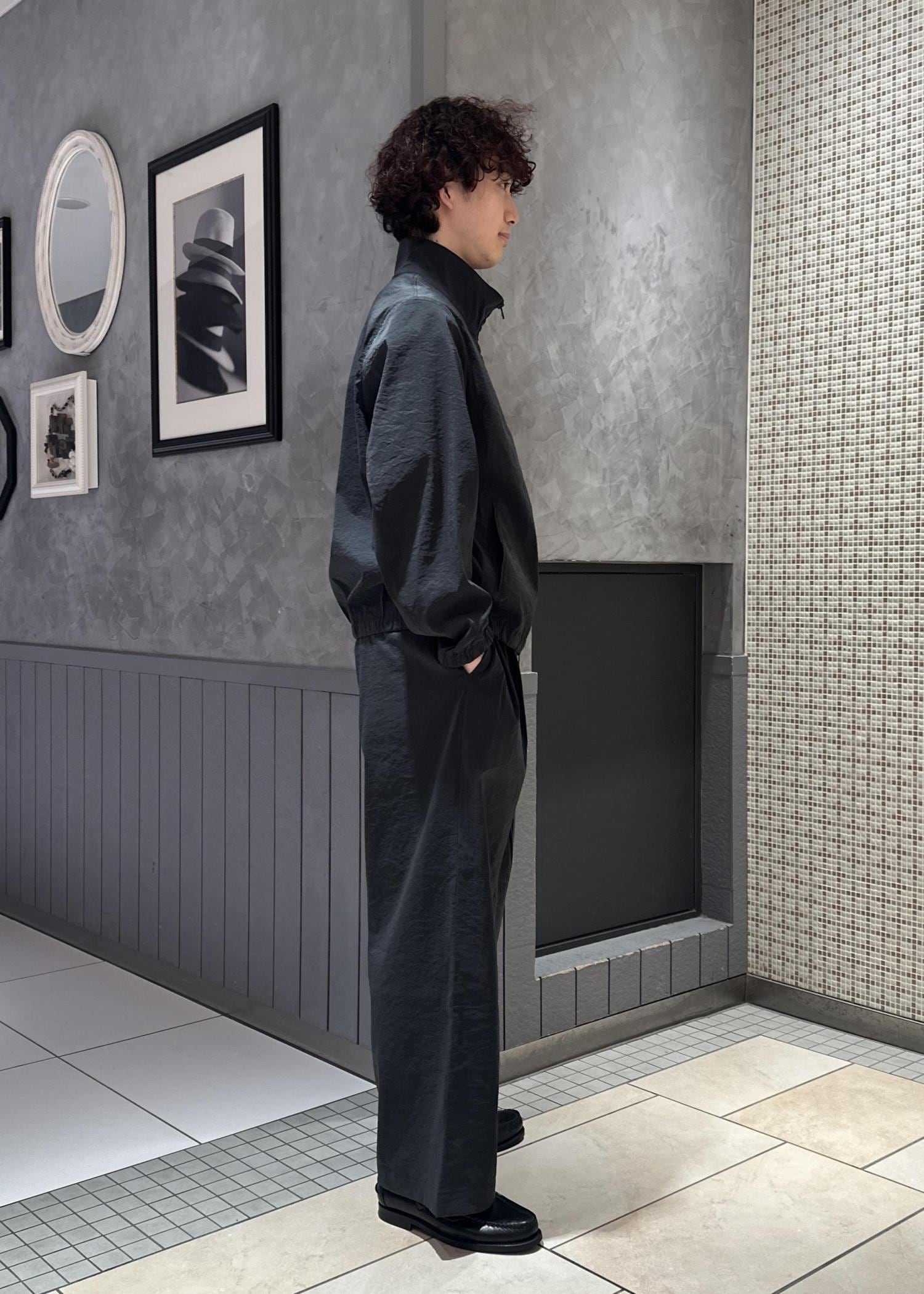 ナイロンのパンツ、ジップブルゾンのセットアップ。スポーティすぎないデザインで、クリーンな仕上がりなので、ローファーと合わせてキレイめに少し寄せてみました。とても軽やかな着心地でラフさも兼ね備えてます。暗めのモノトーンで統一し、ラフすぎず程よいカジュアルを意識しました。