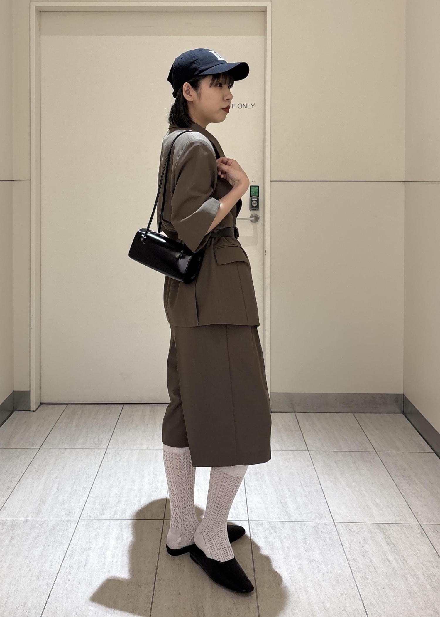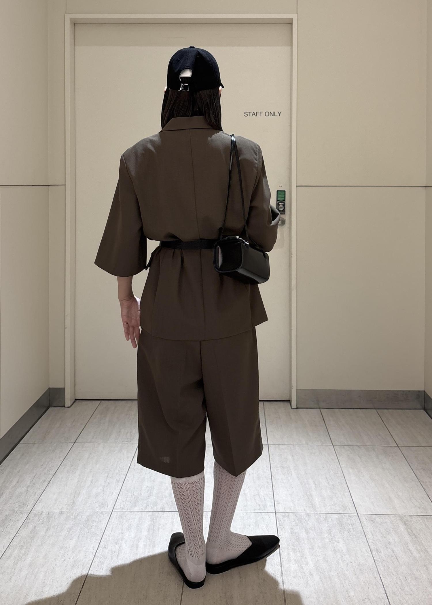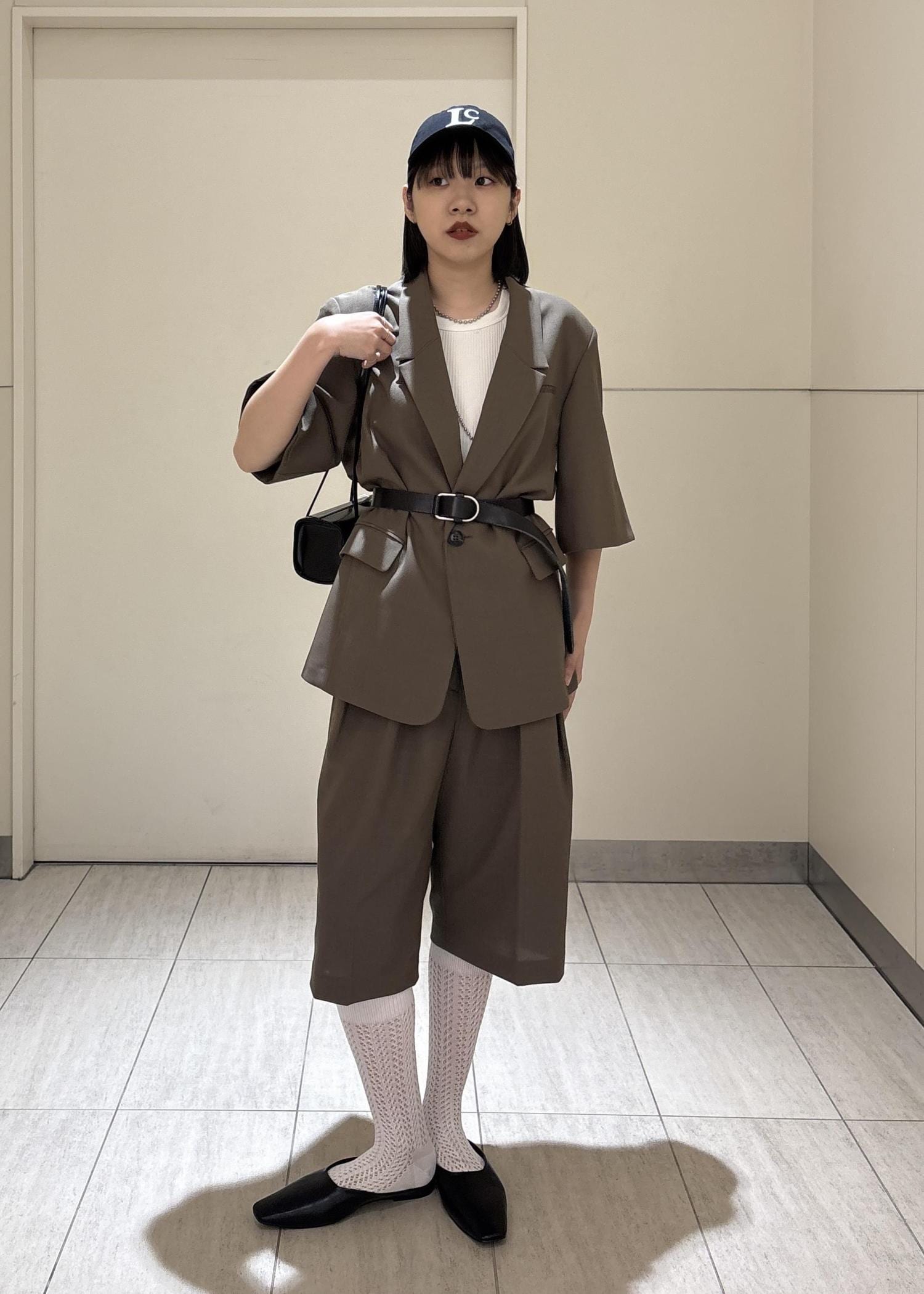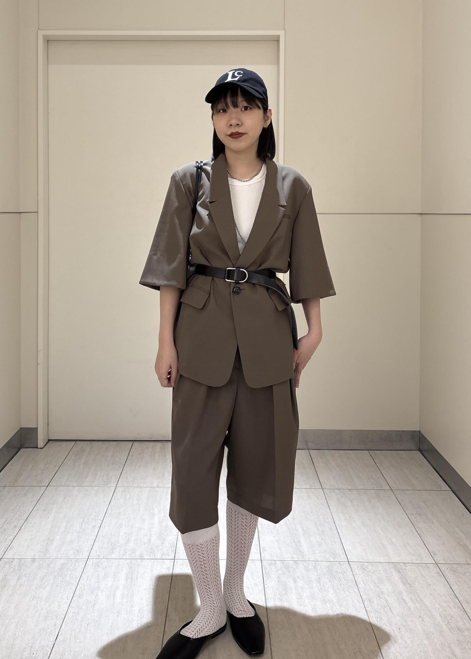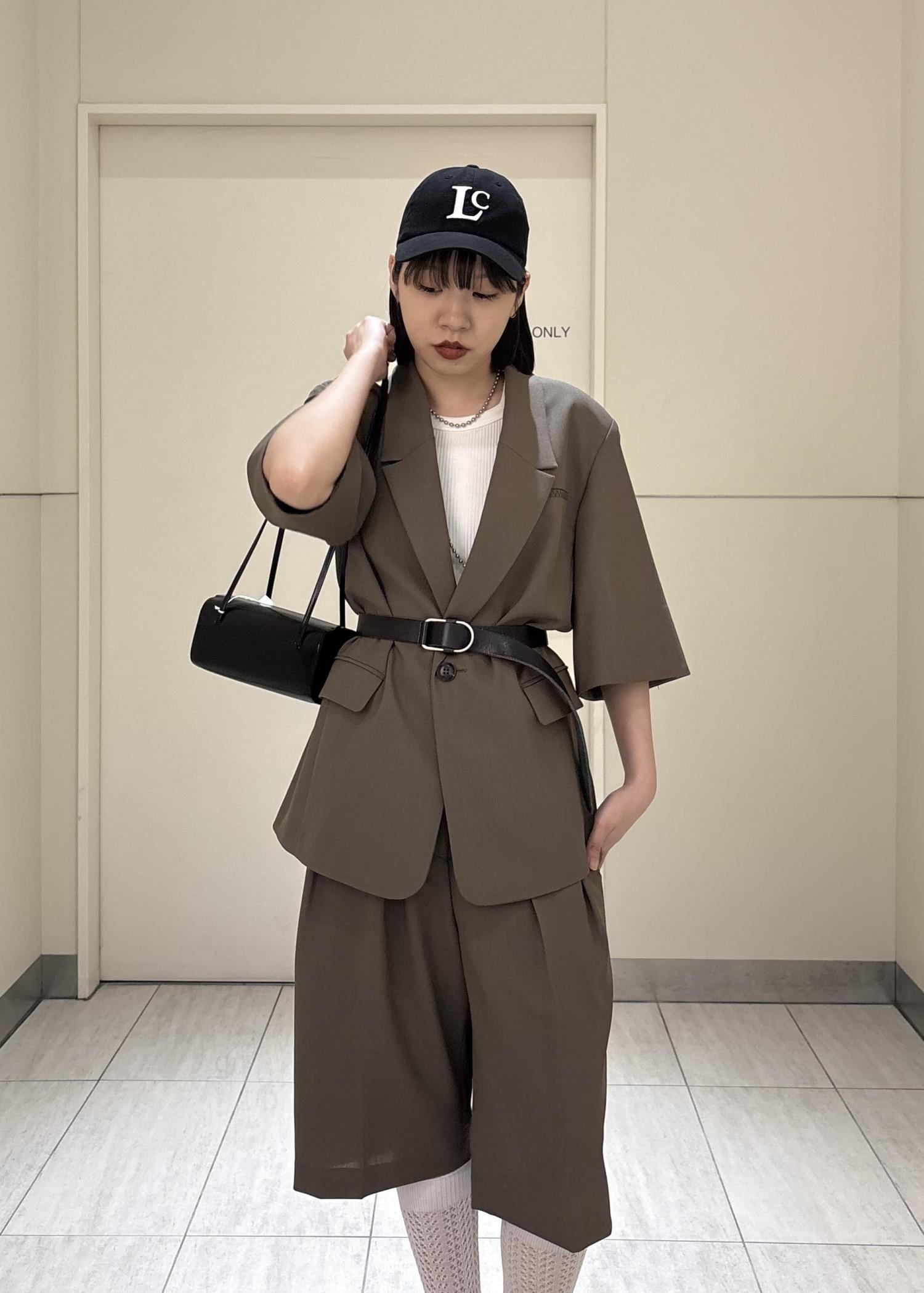 ゆったりとしたハーフスリーブジャケットに、同素材のワイドハーフパンツを合わせて、ラフさときちんと感を両立。ウエストはベルトでマークすることでシルエットにメリハリをつけ、スタイルアップも◎
