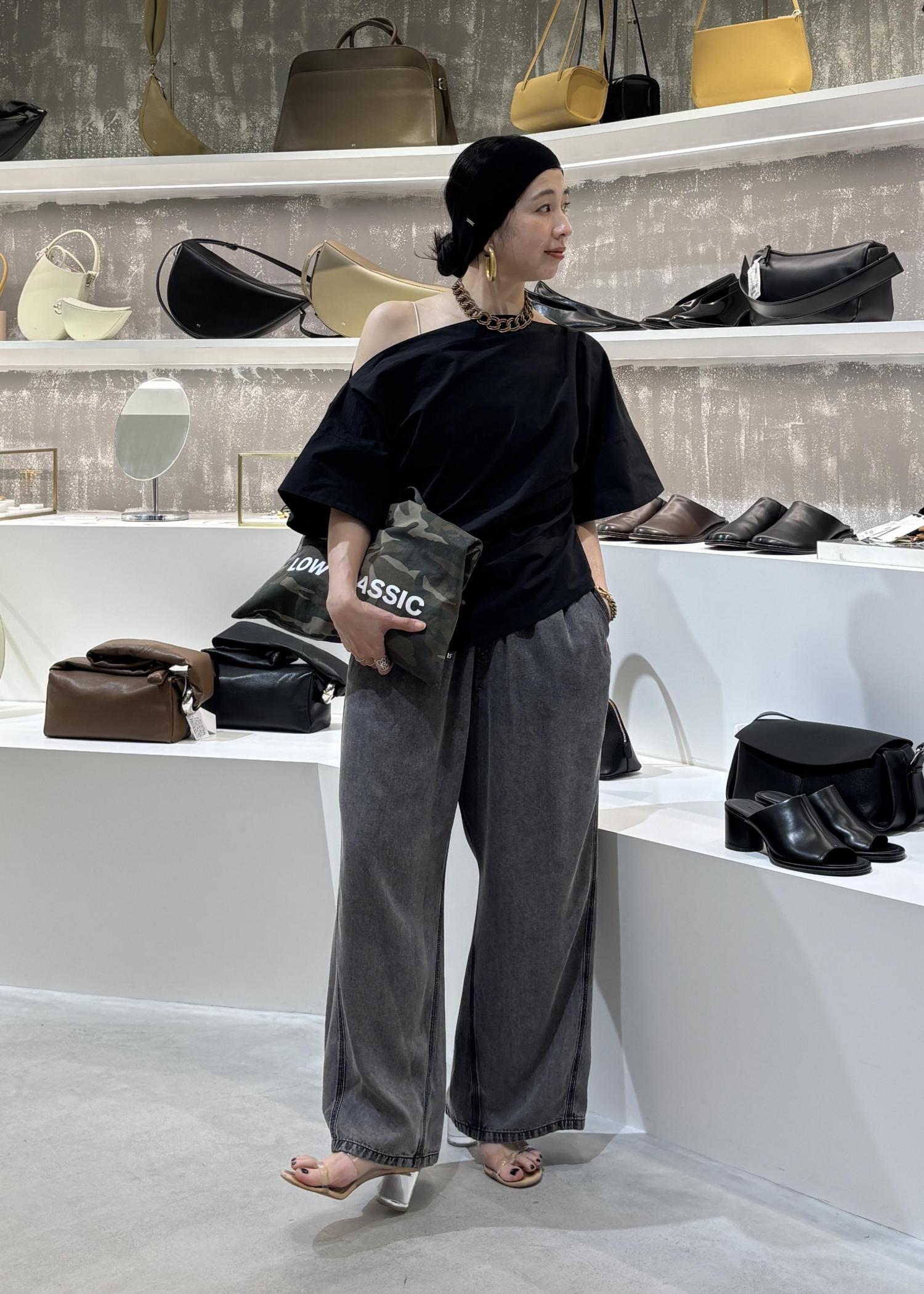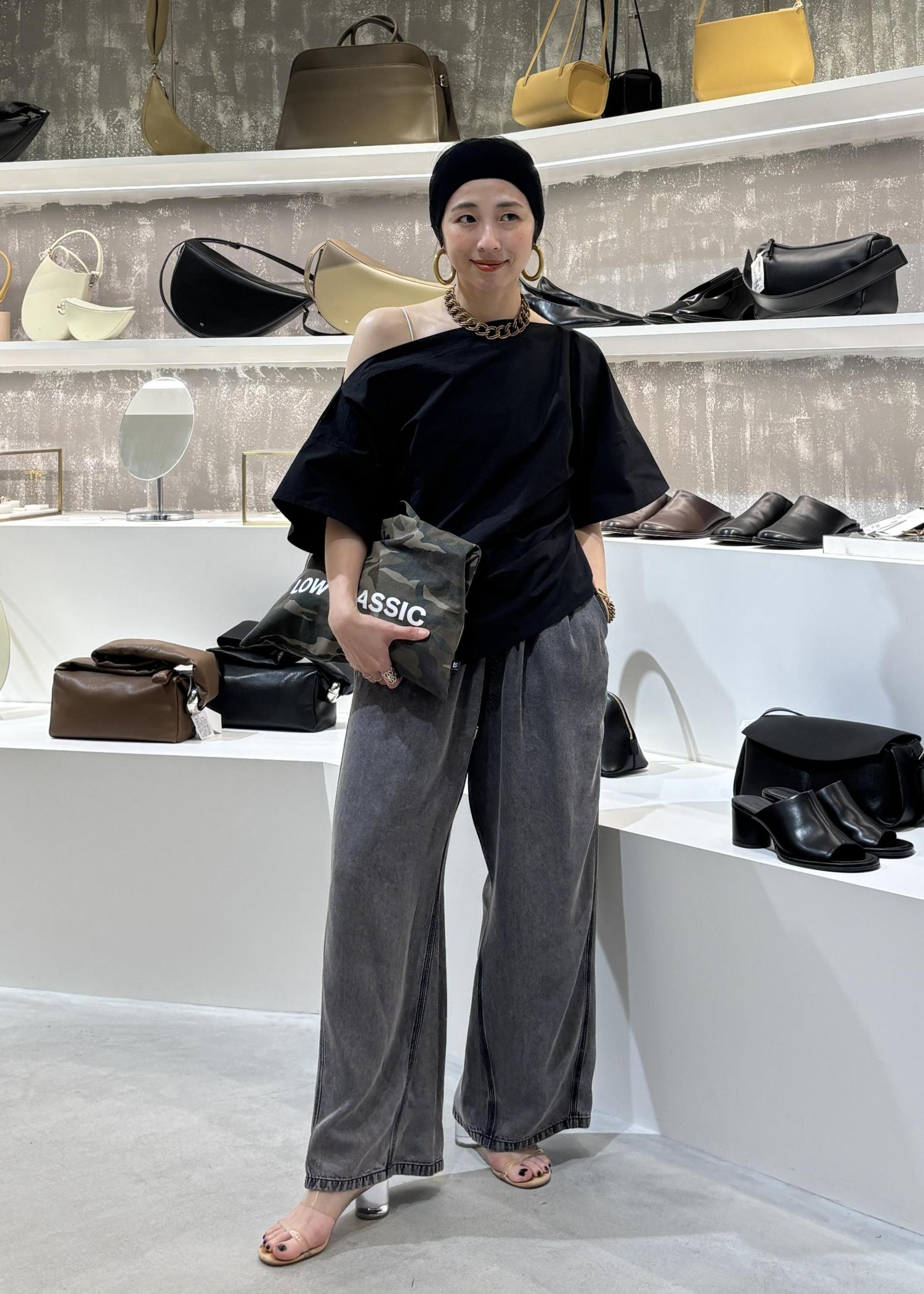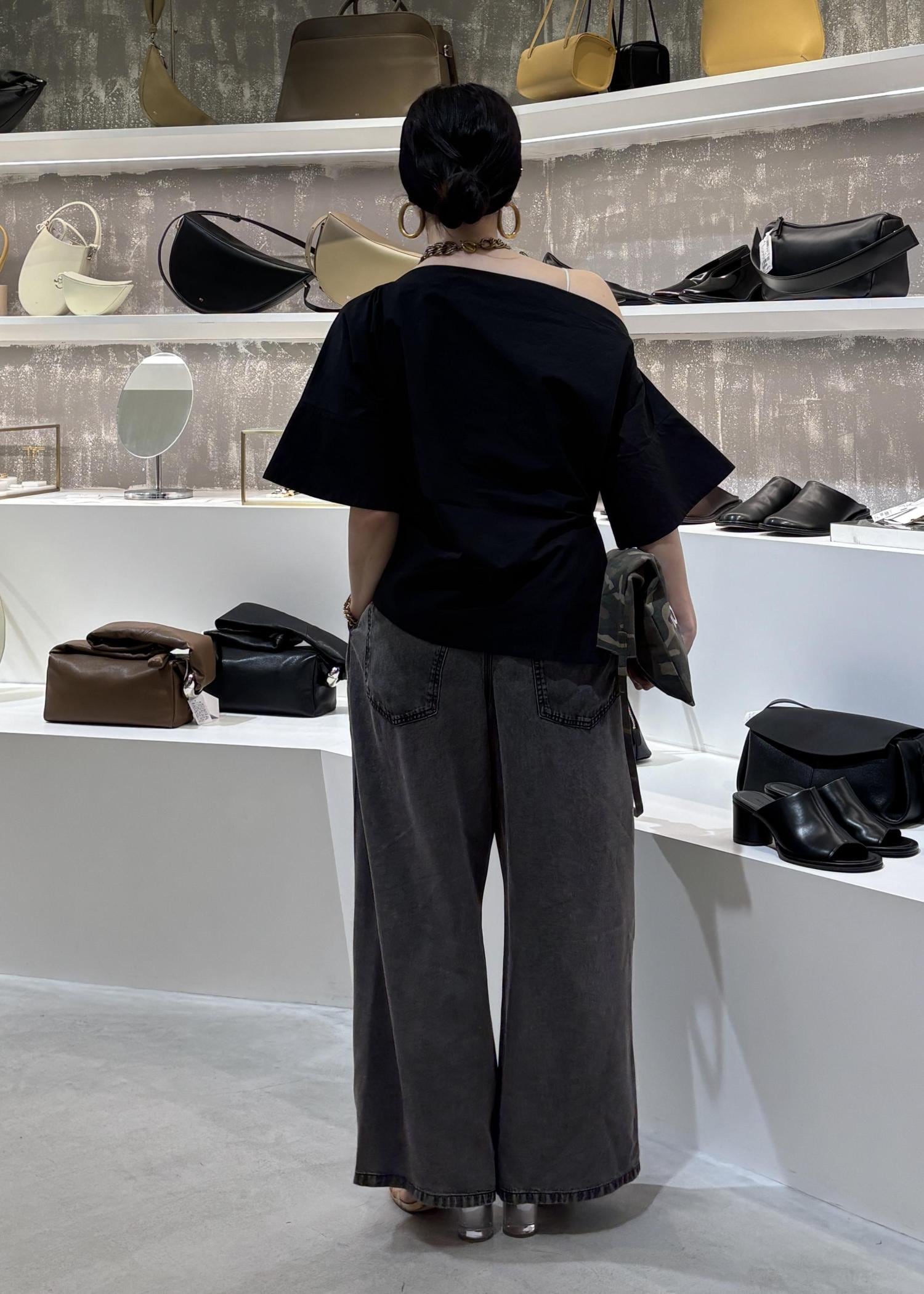 オフショルになるブラウスをさらっとした落ち感のあるデニムでカジュアルダウンして、リラックスカジュアルスタイルに。