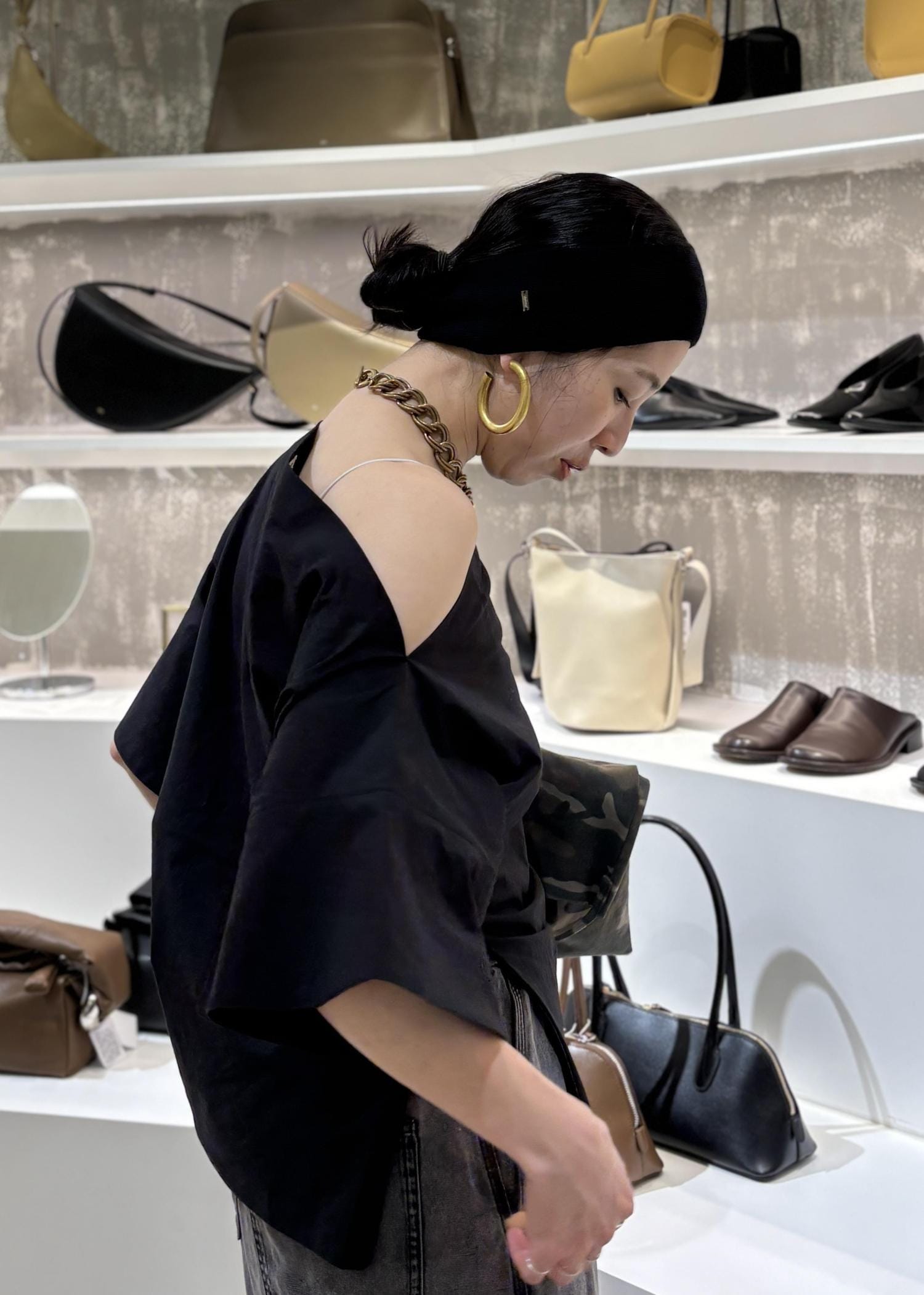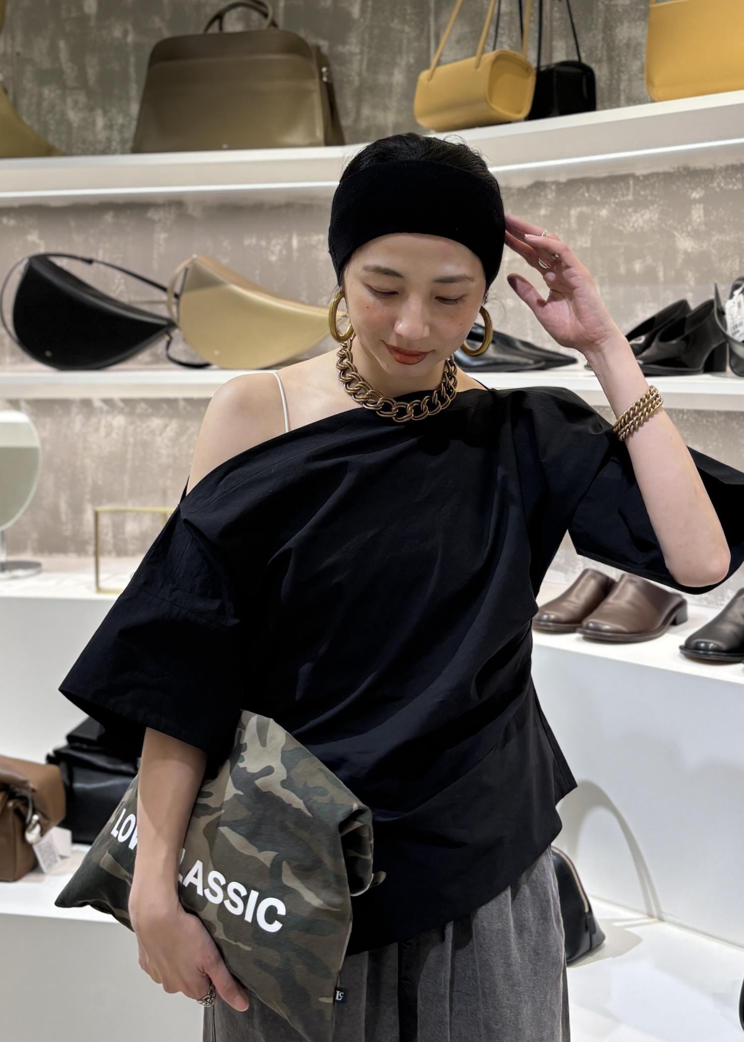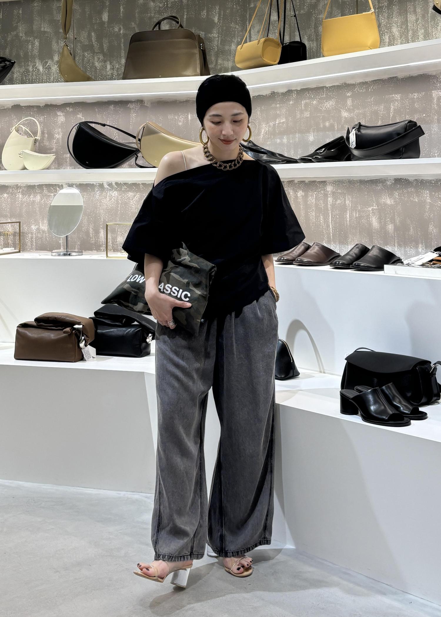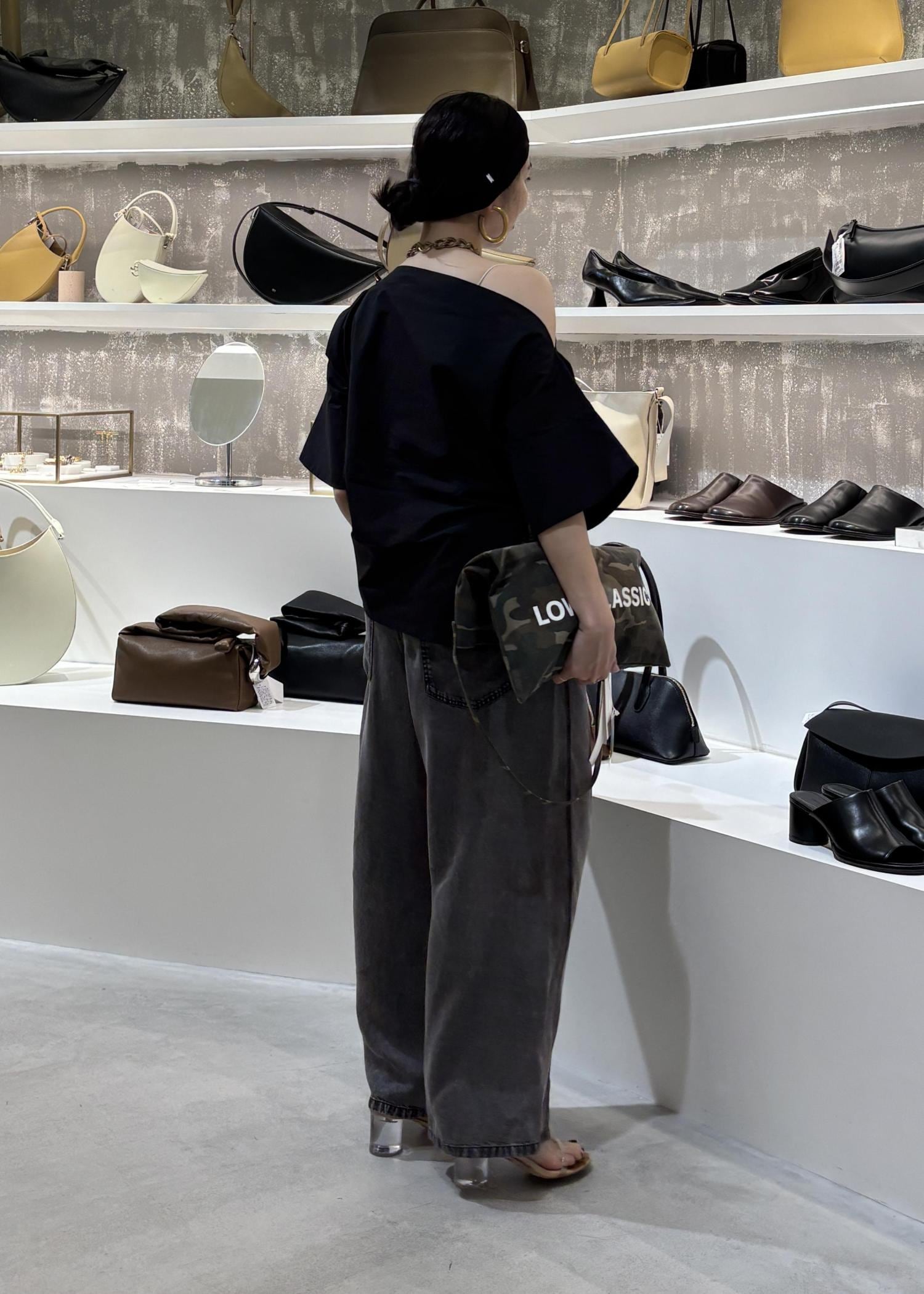 オフショルになるブラウスをさらっとした落ち感のあるデニムでカジュアルダウンして、リラックスカジュアルスタイルに。
