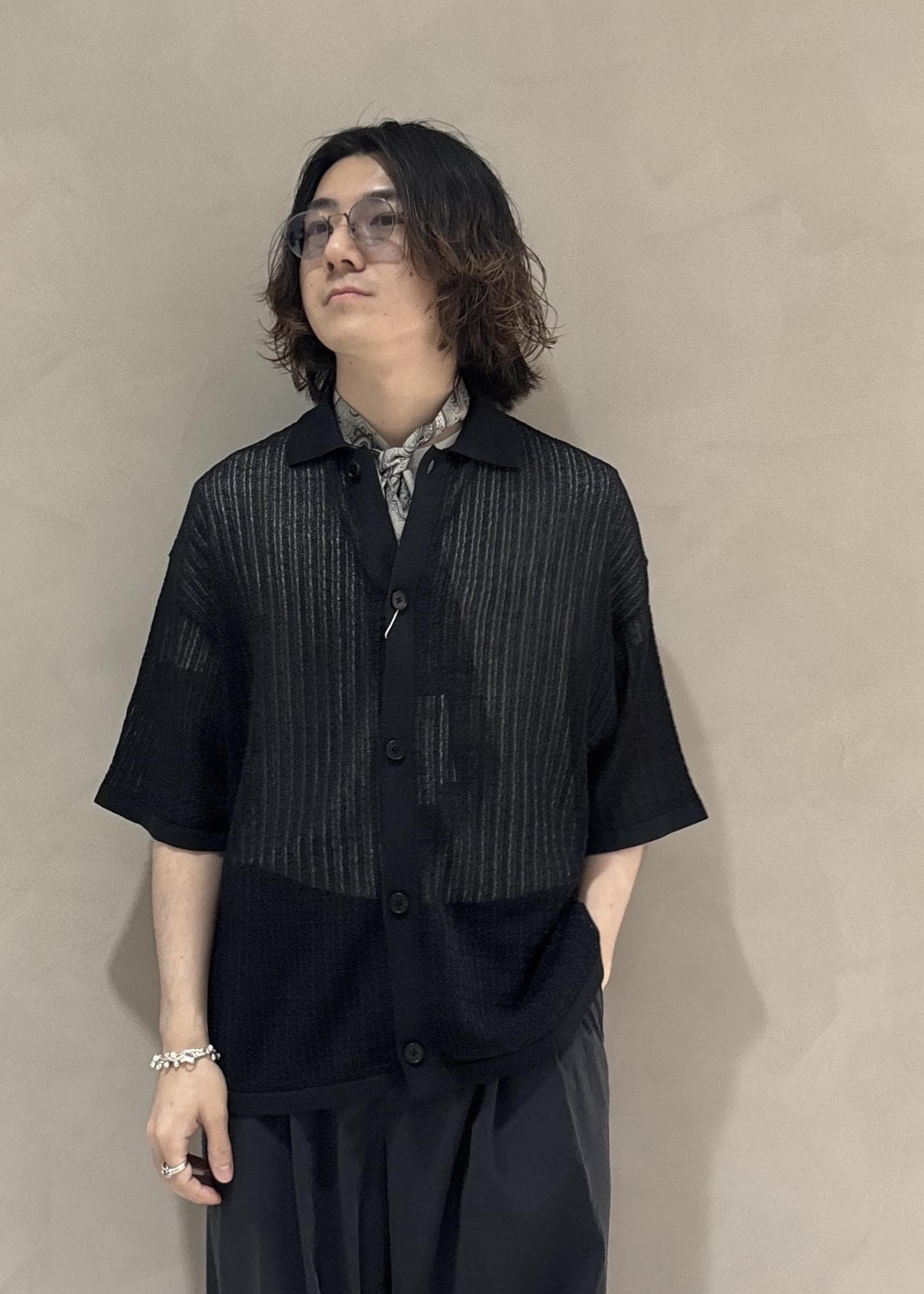 ADAM ET ROPÉ HOMMEシアーニットシャツカーディガンブラック / M¥17,600レビューMサイズで程よく緩さのあるサイジングで着用可能。