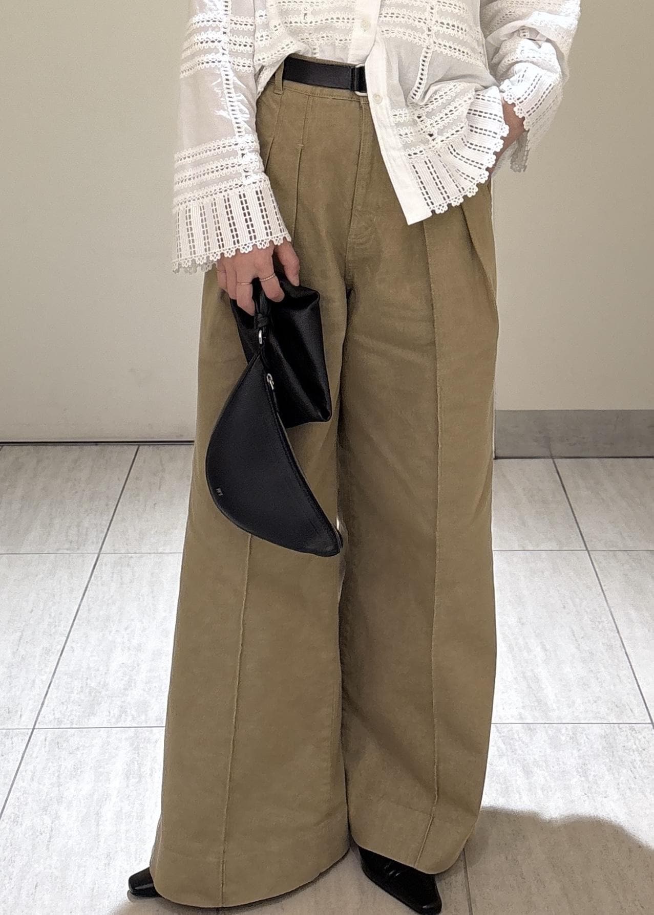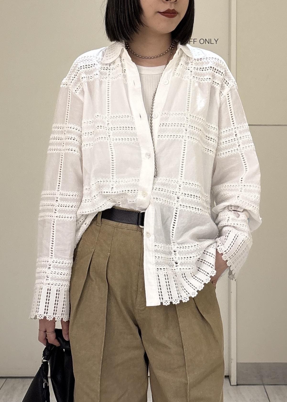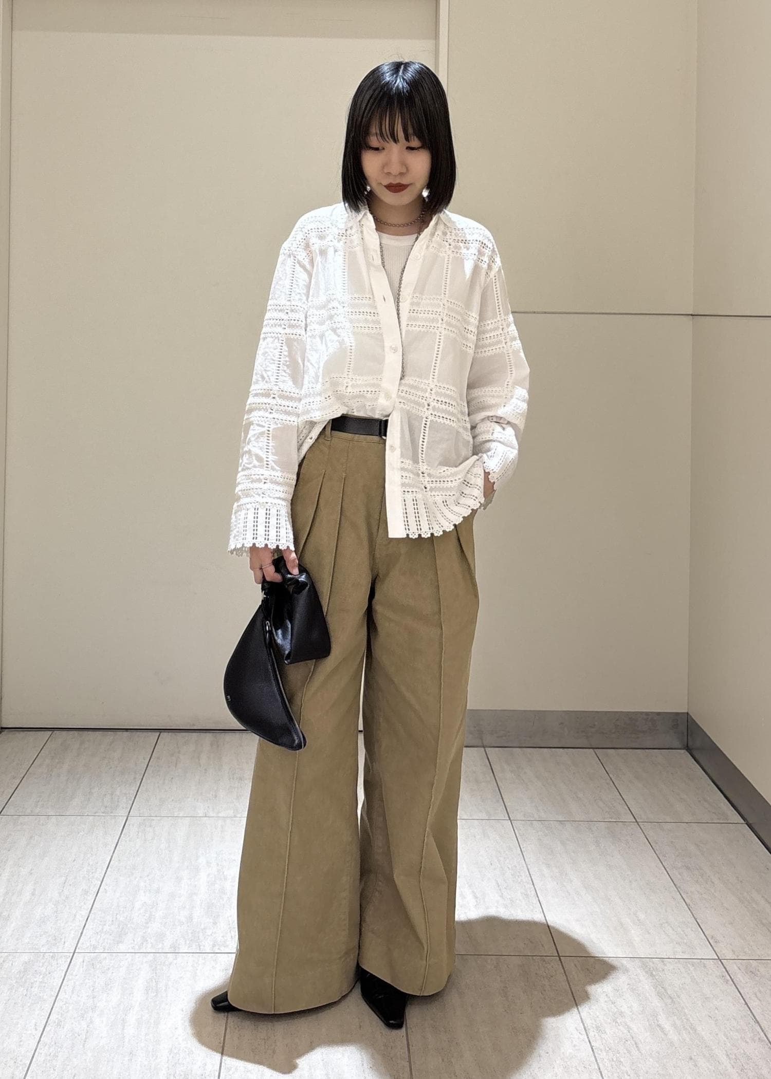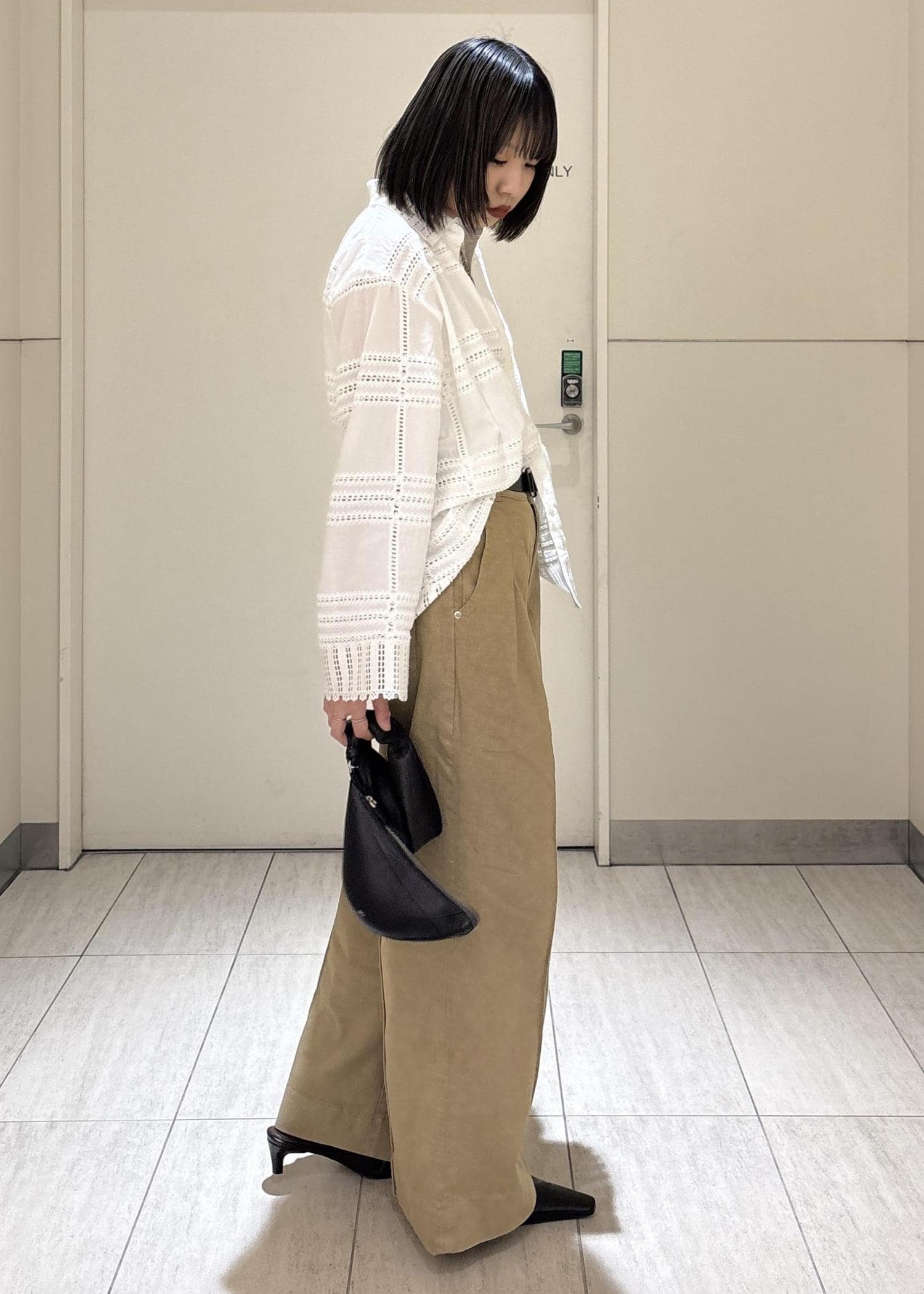 エンブロイダリーシャツを主役に、ワイドなベージュパンツでバランスを取った大人カジュアル。黒小物で全体を引き締めて、甘さを程よく抑えた上品なスタイリング。