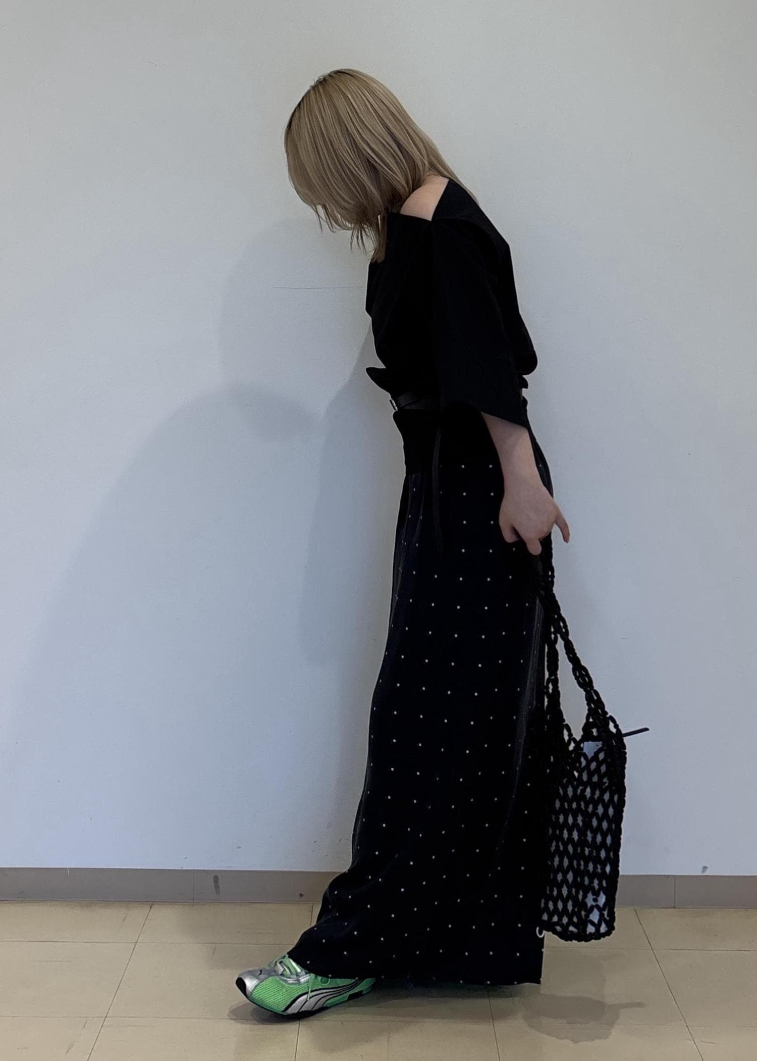 足元はあえてカジュアルなスニーカーにすることでよりモードな印象なコーディネートに見えます。