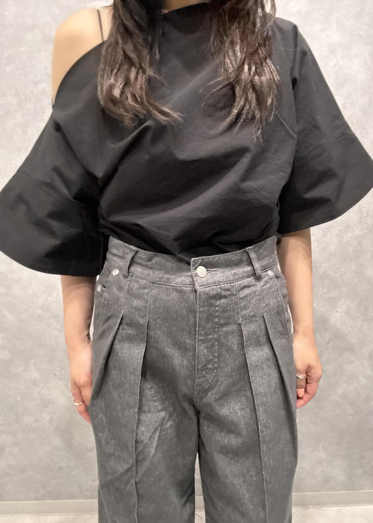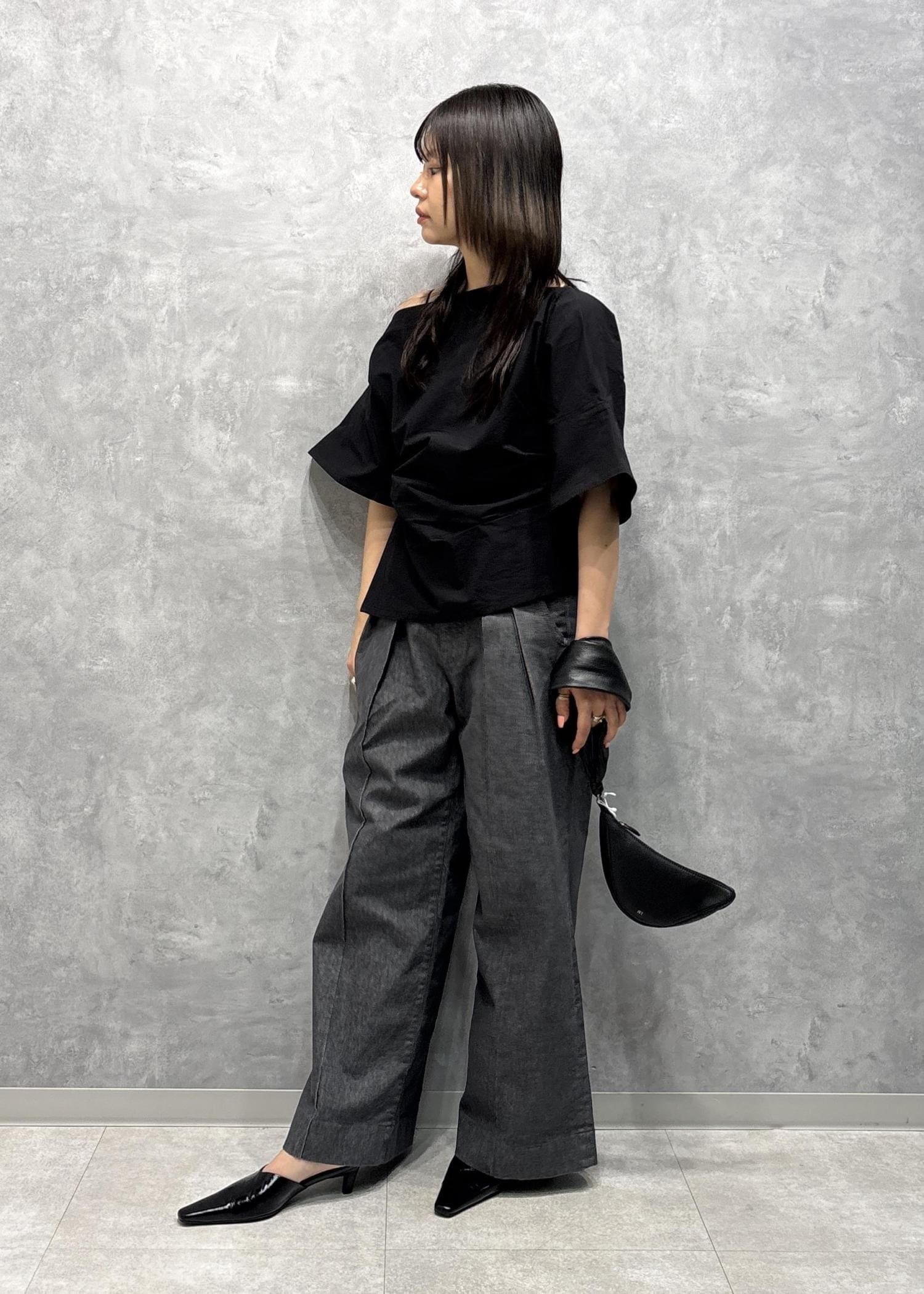 NEW!EMOELLE【EMOELLE】2タックデニムパンツチャコール / 36¥26,400レビュー163cm、36サイズ着用。