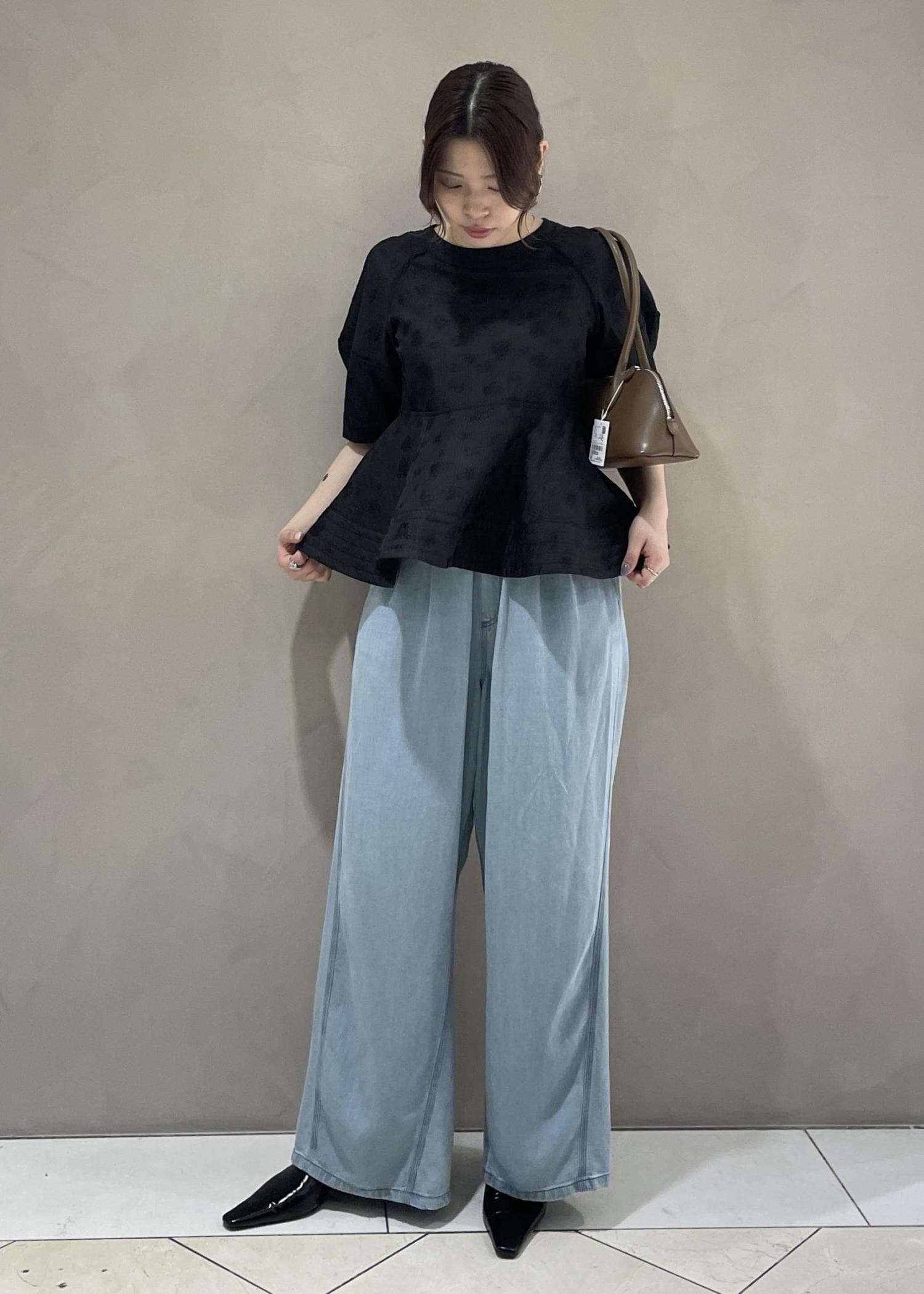 本日は華やかなペプラムトップスを使って綺麗めカジュアルコーデを組んでみました!!
