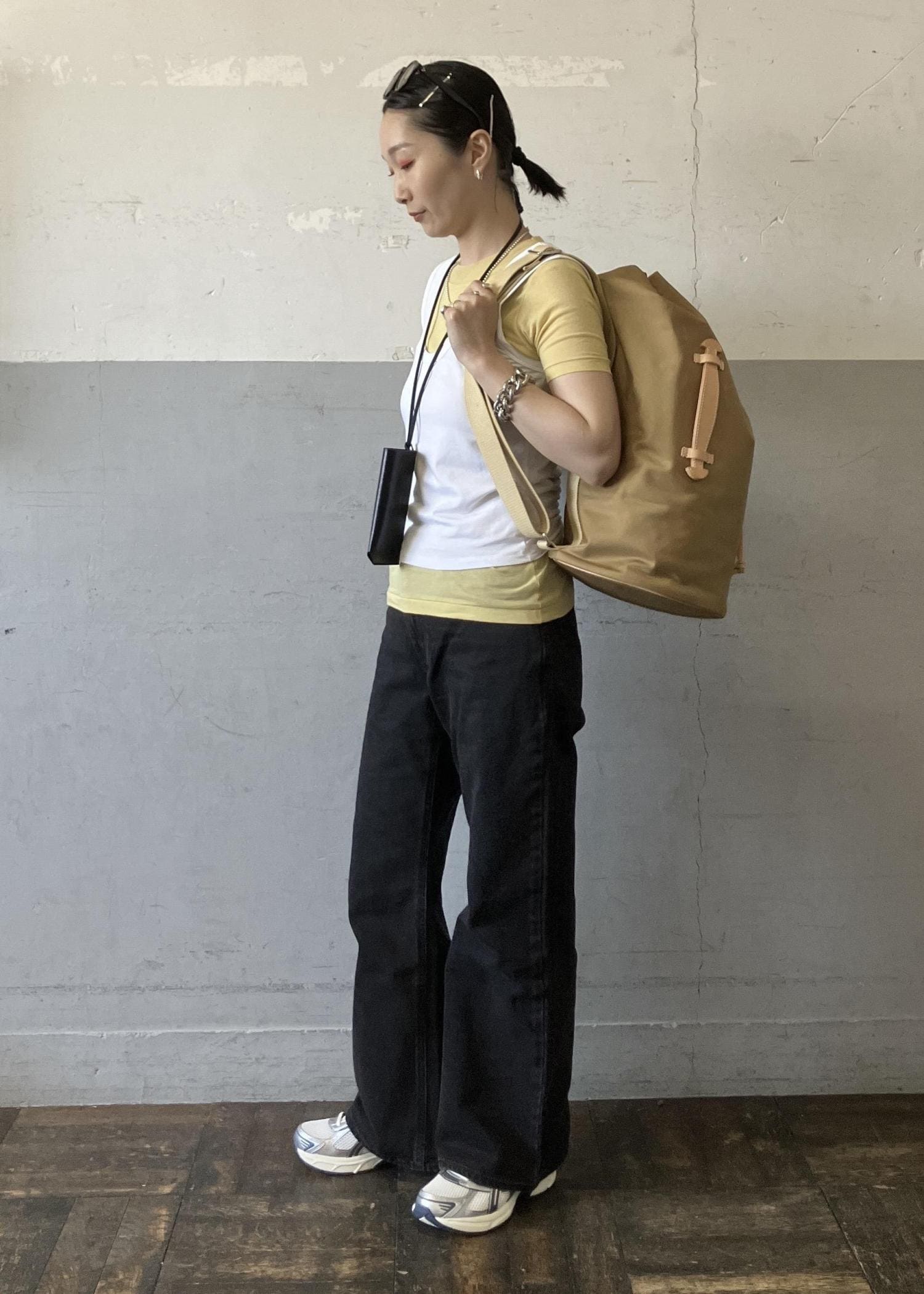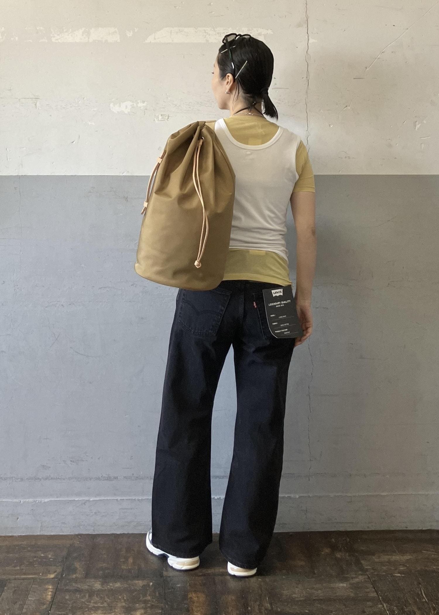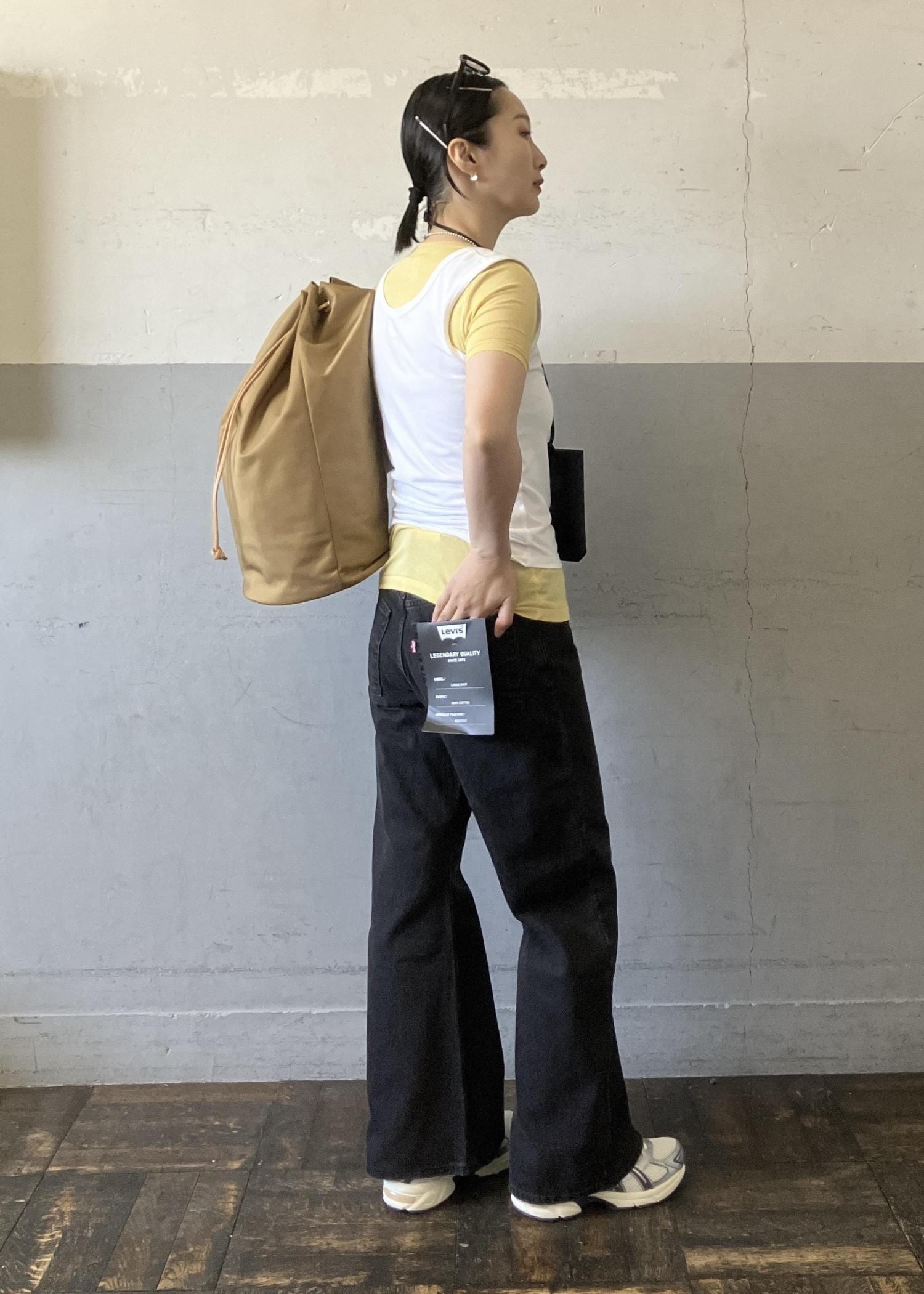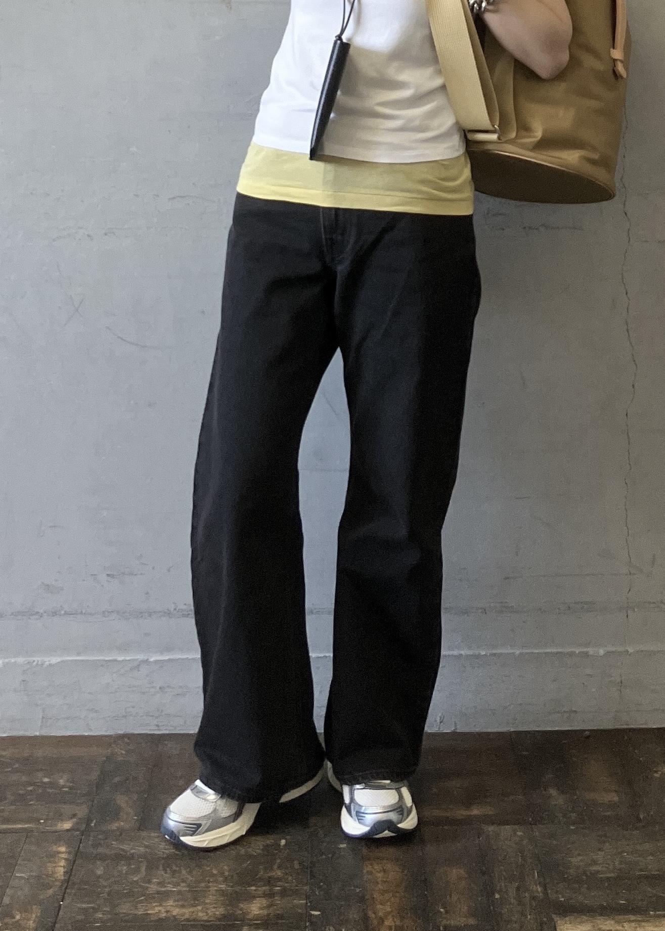 普段選ぶサイズよりもひとつ大きめを選んで、少しルーズにゆるめに穿いています。 -