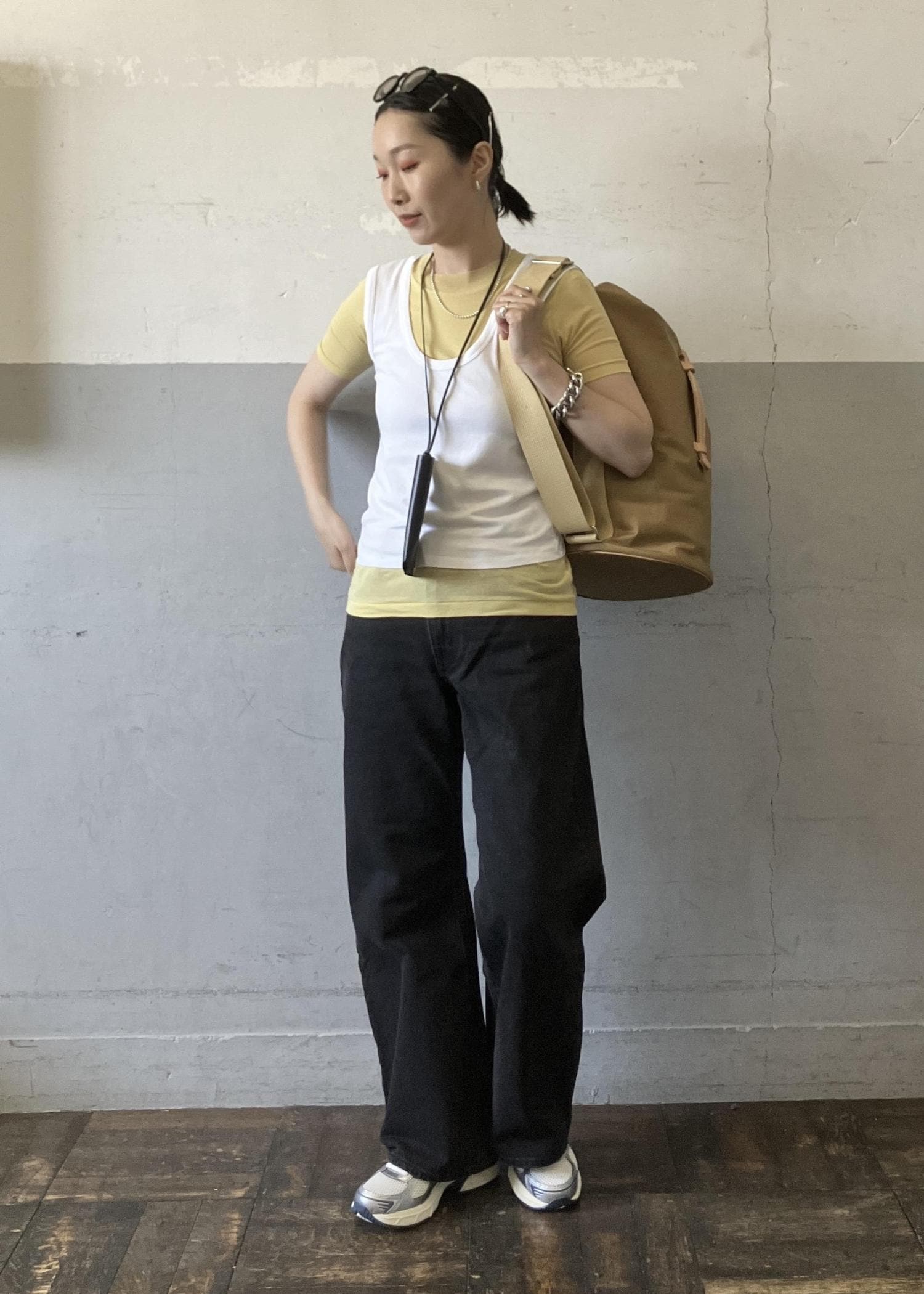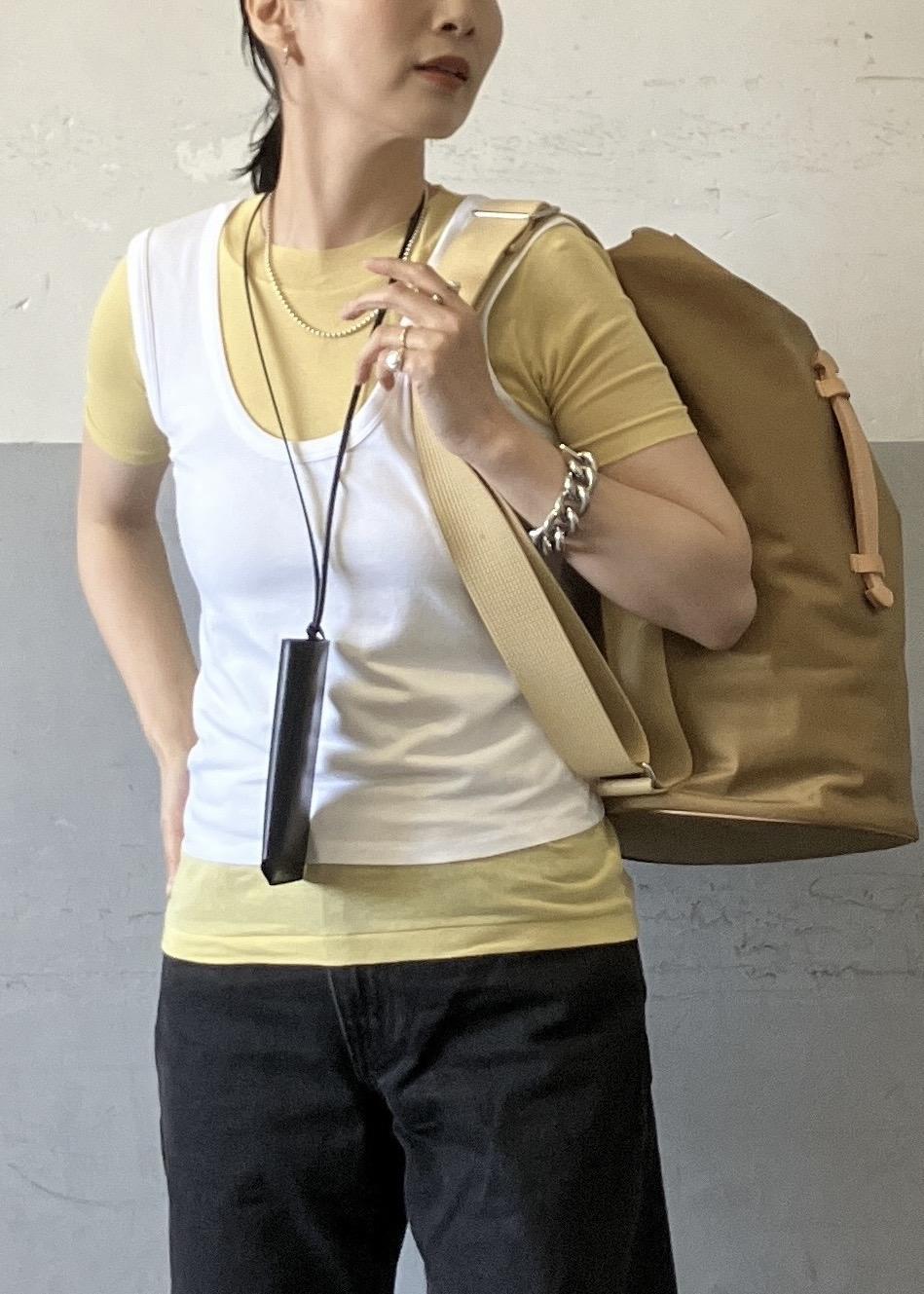 今季トレンドのTシャツとタンクトップのレイヤード。