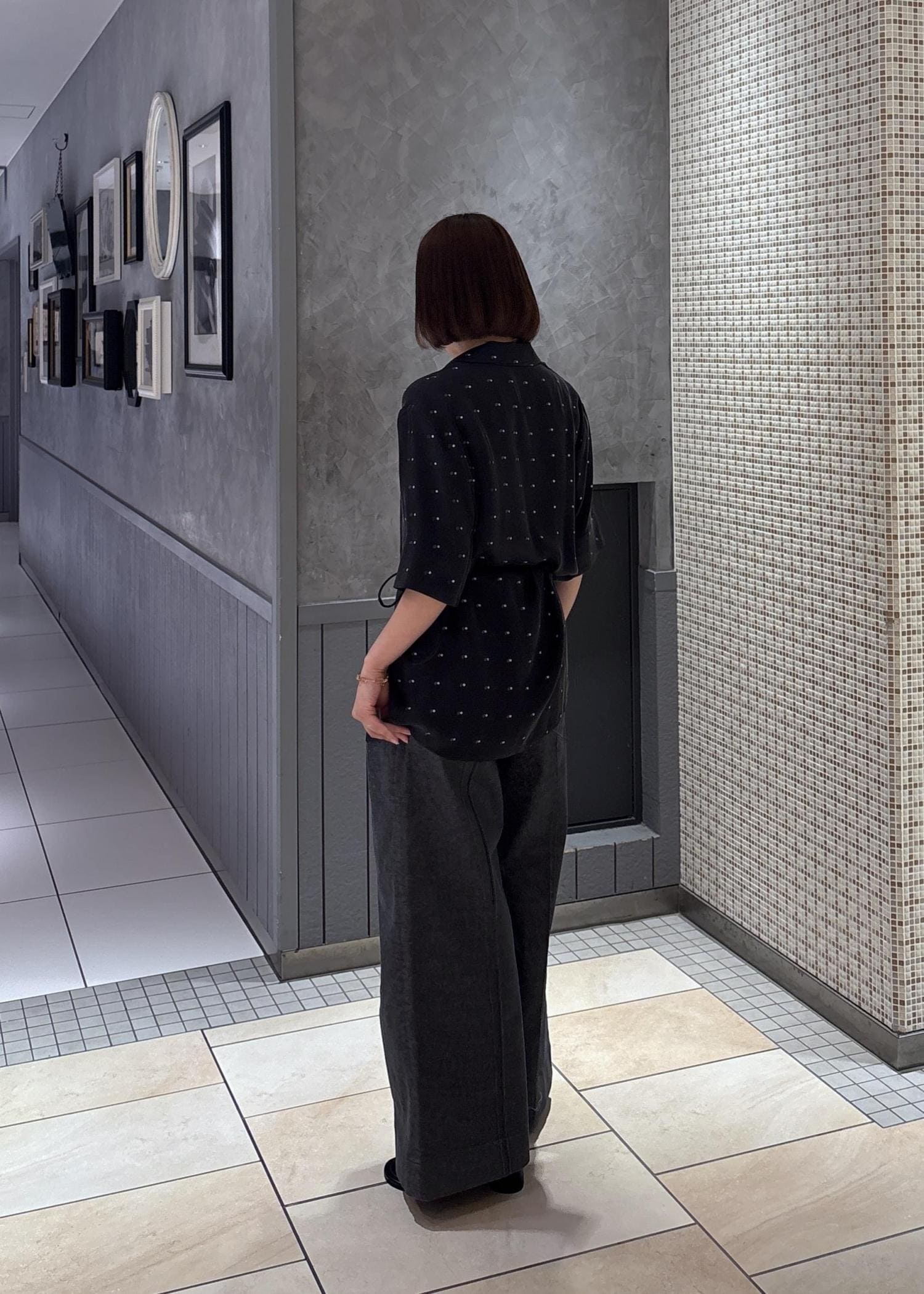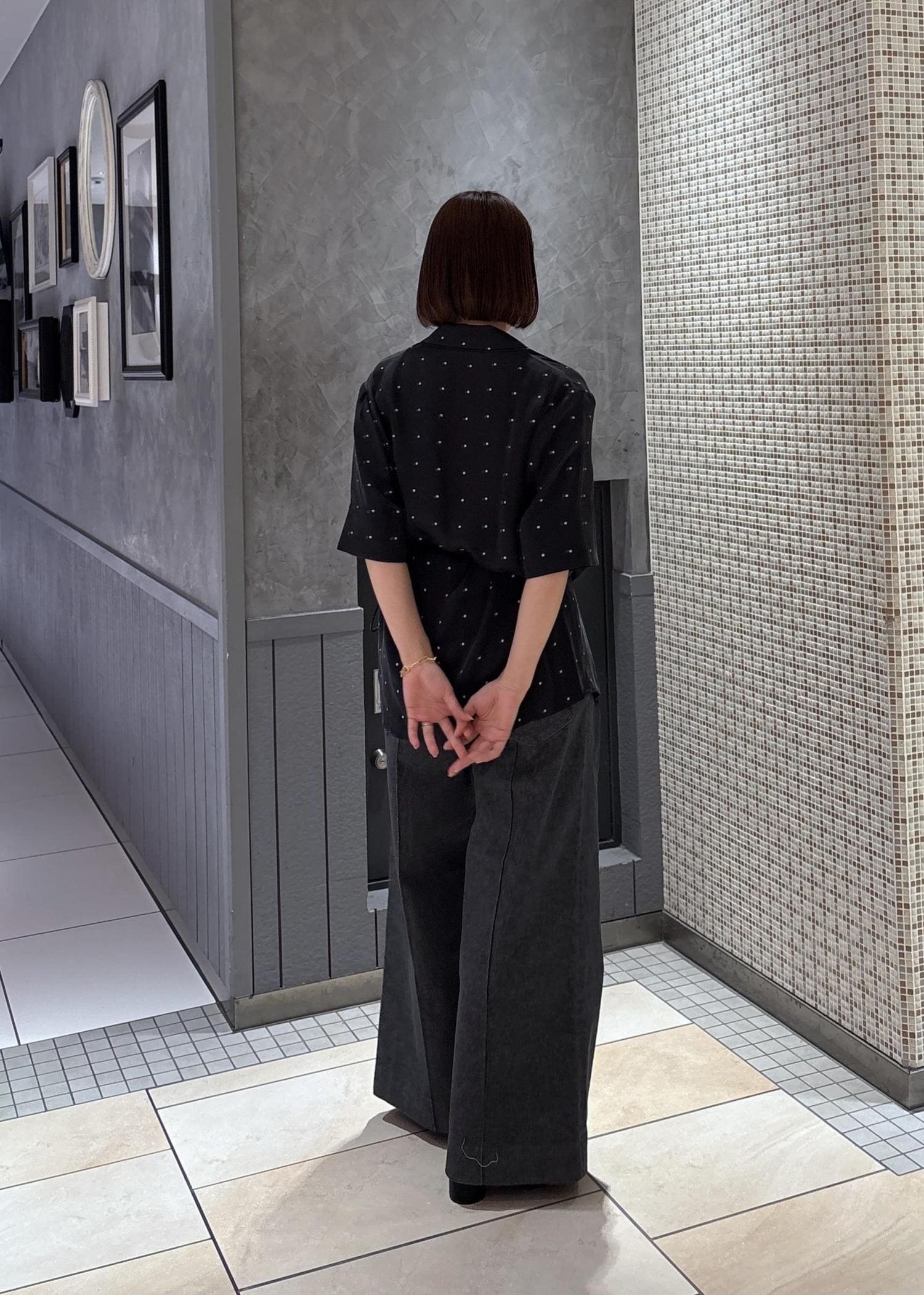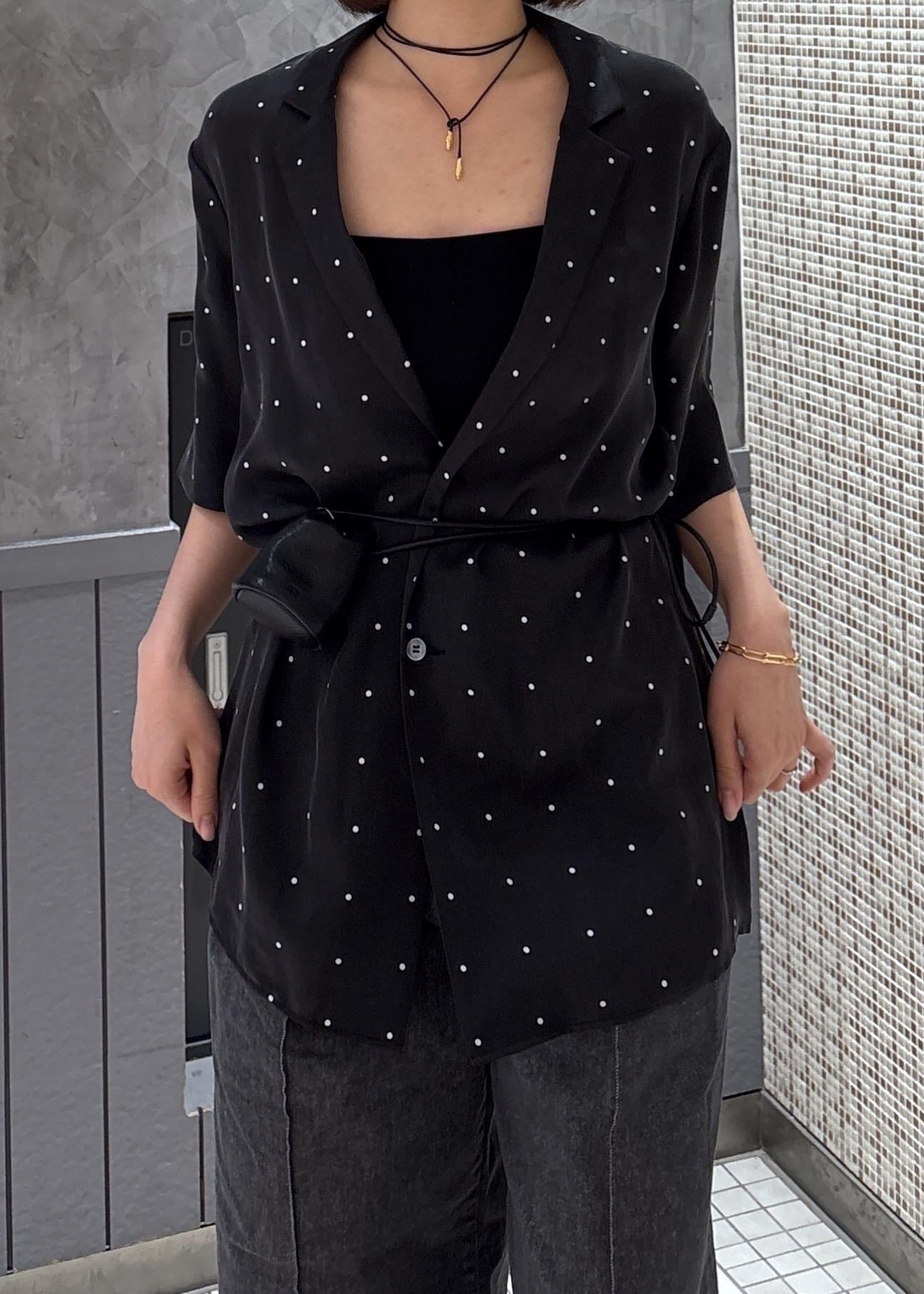 NEW!EMOELLE【EMOELLE】テーラーカラーシャツブラック系 / F¥26,950レビューとろみのある素材でとっても着心地が良く、体にそってシルエットを綺麗に見せてくれます!ドットが小ぶりなので、様々なスタイリングが楽しめておすすめです♡