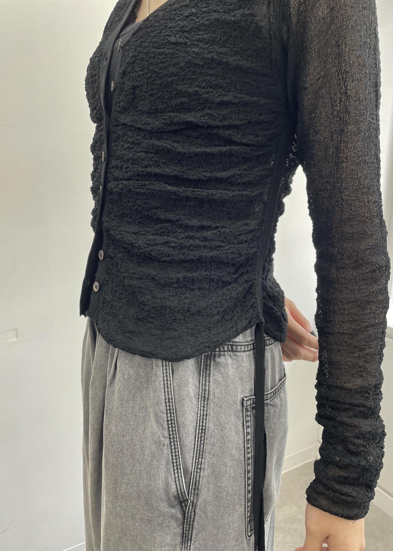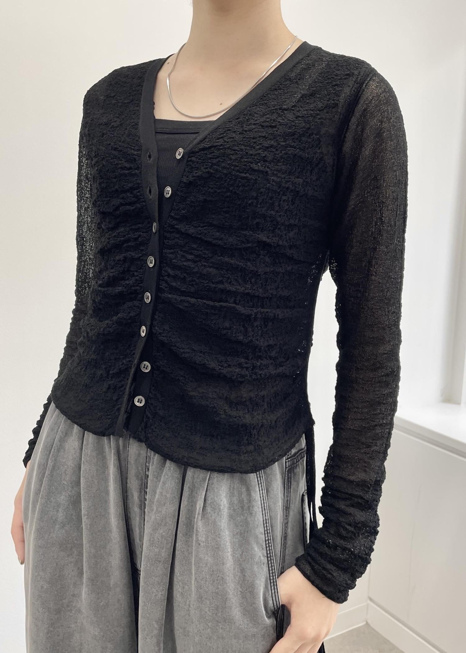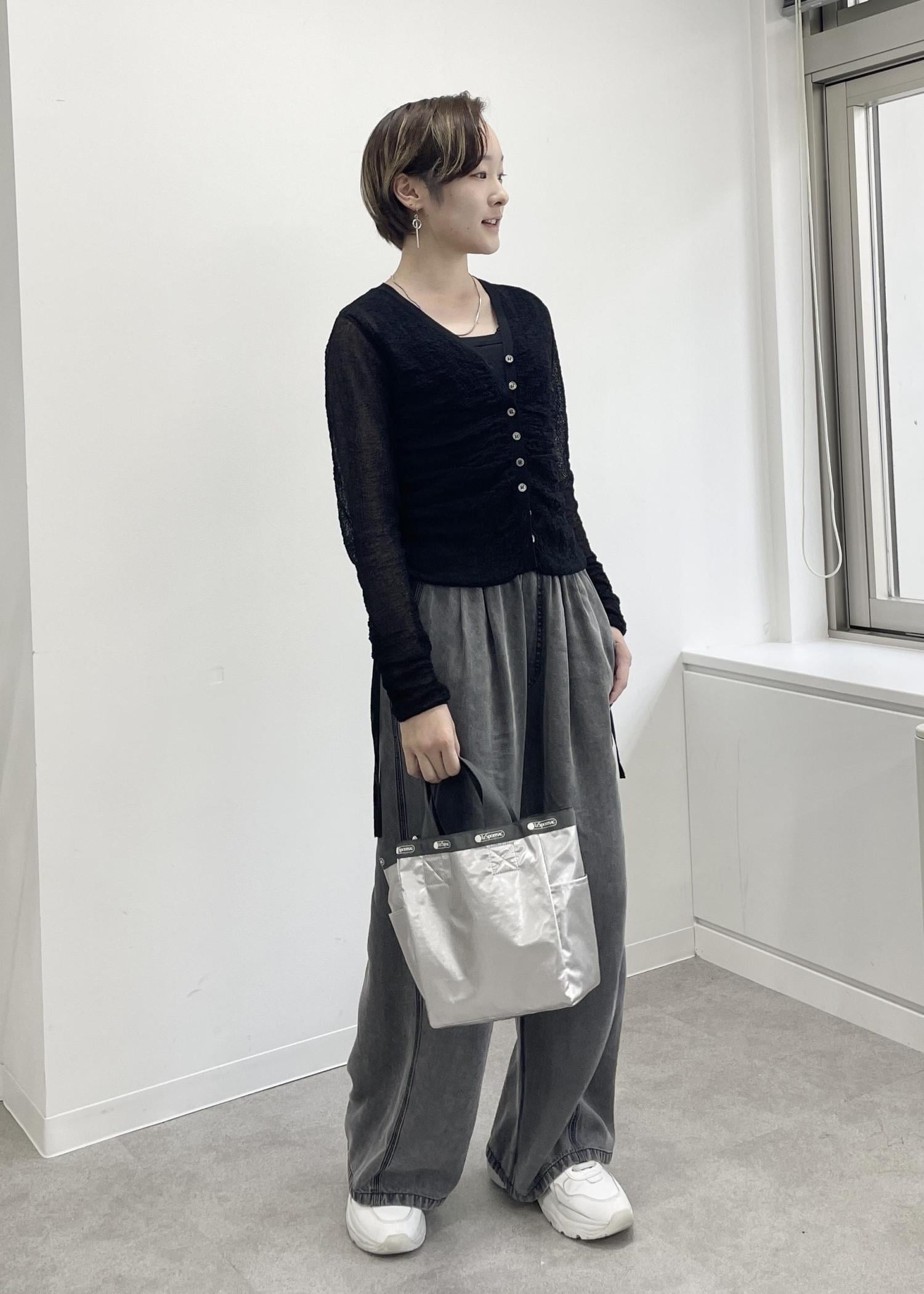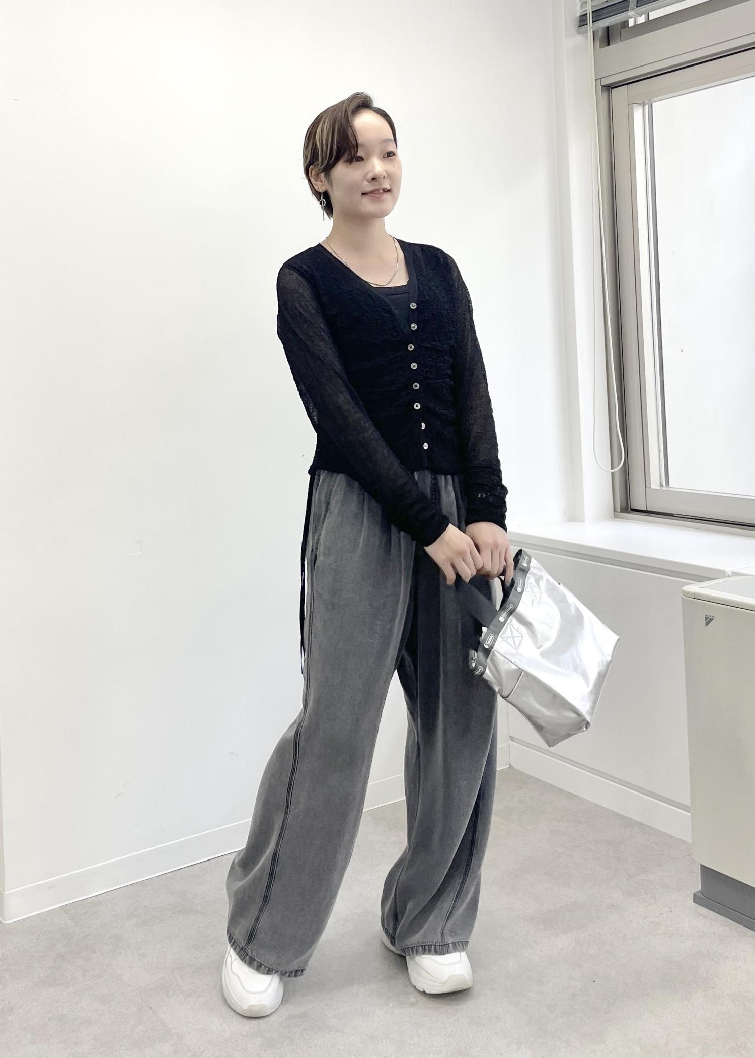 トップスのシアーカーディガンは骨格ストレートさんと相性抜群な、ぴったりめのサイズ感にVネックのデザインです!
