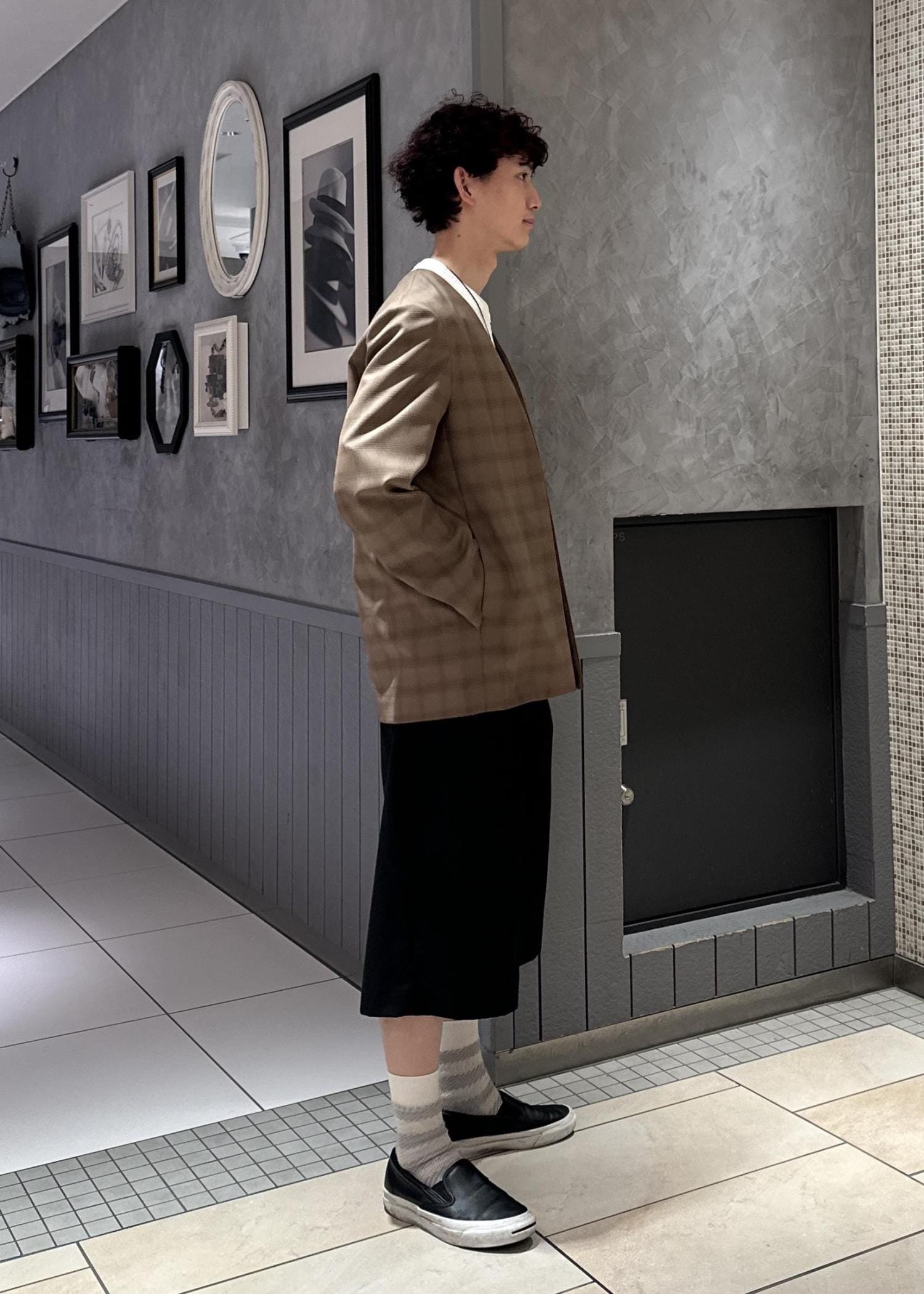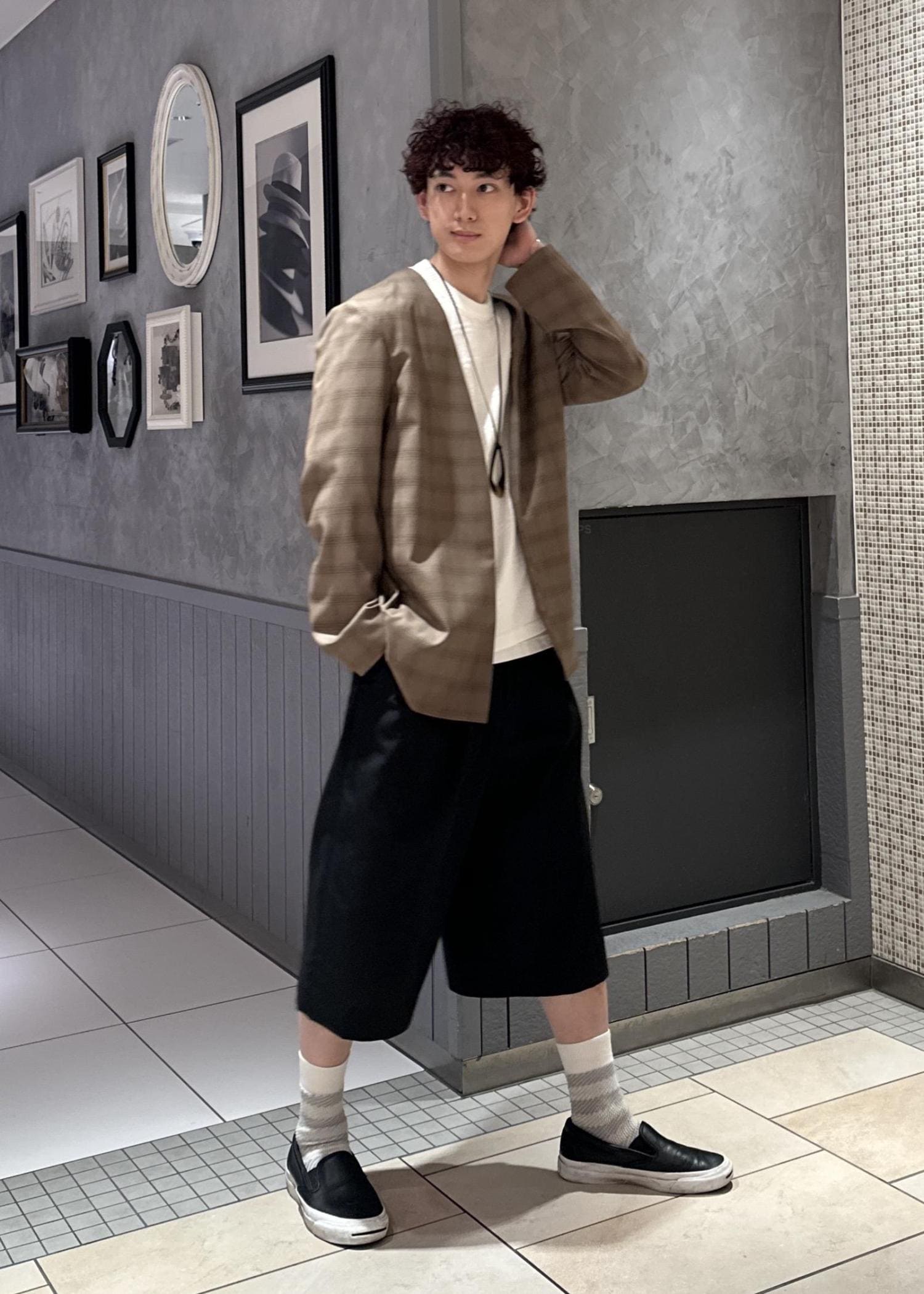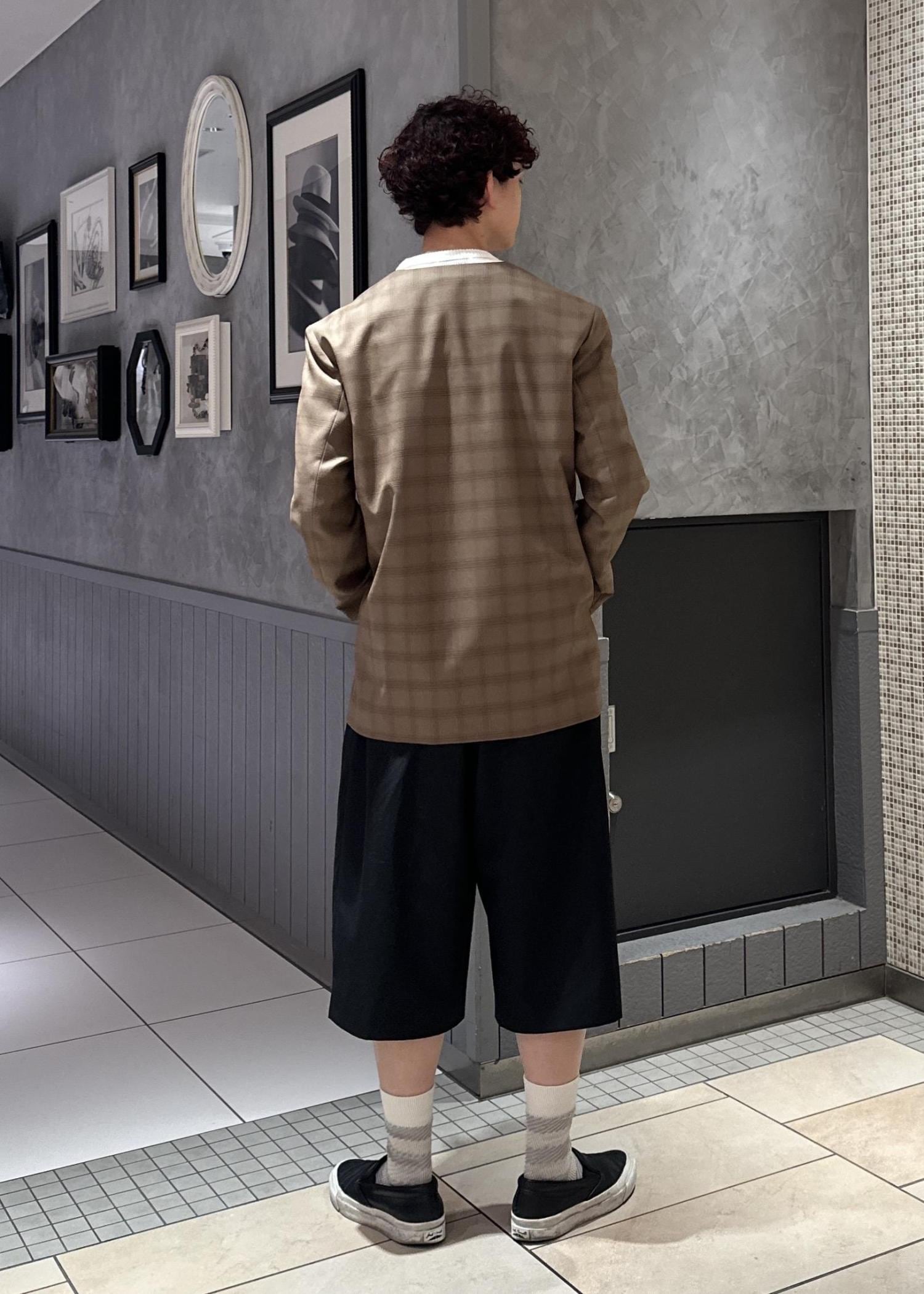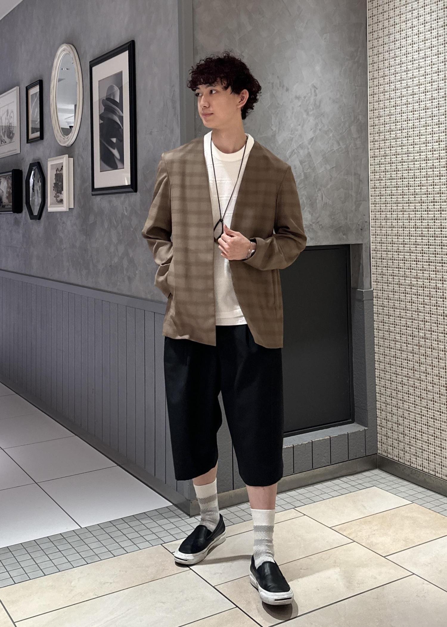 チェックのノーカラージャケットにキレイめなショーツを合わせた涼しげなコーデ。インナーには透け感のあるTシャツを着ることでより涼しげな印象に。長めのネックレスでスッキリシンプルすぎないようにしました。
