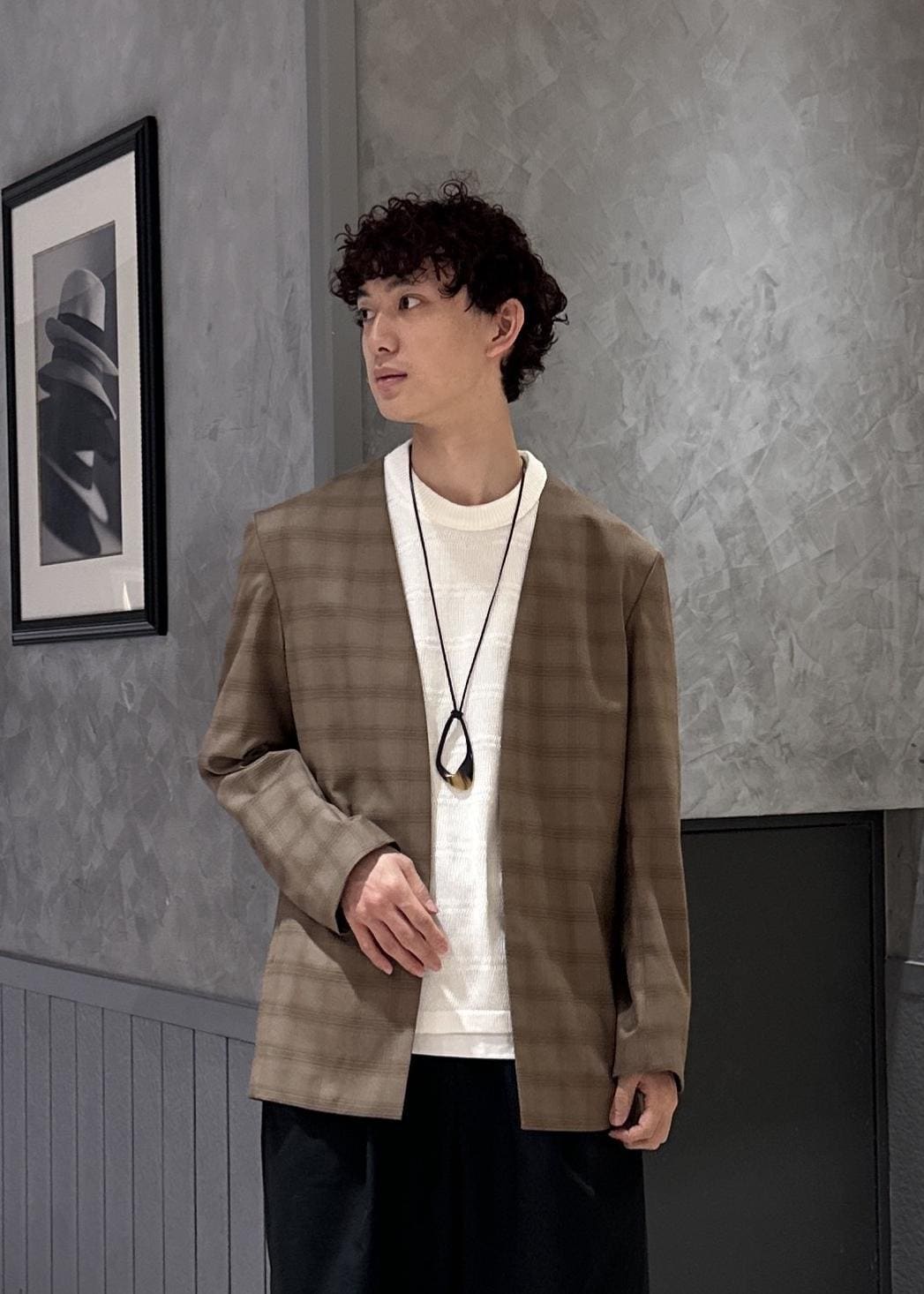 すっきりとした、綺麗なシルエットのノーカラージャケット。スタイリッシュな見た目ですが着心地はややルーズめ。オンオフ問わず着回ししやすいジャケットです。生地は春夏仕様の薄めのもの。サラッとしていて肌触りも良いです。 -