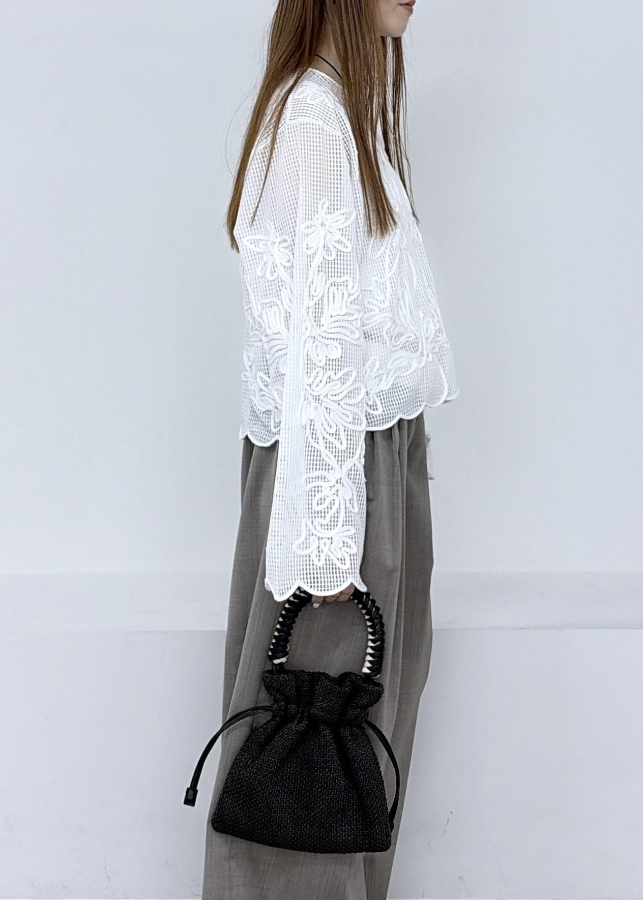 ADAM ET ROPÉ FEMMEブレイドハンドル巾着バッグブラック / F¥9,900レビュー素材感が可愛い巾着バッグ。二つ折り財布・スマホ・ハンカチ・リップなど見た目以上にきちんと入ります◎