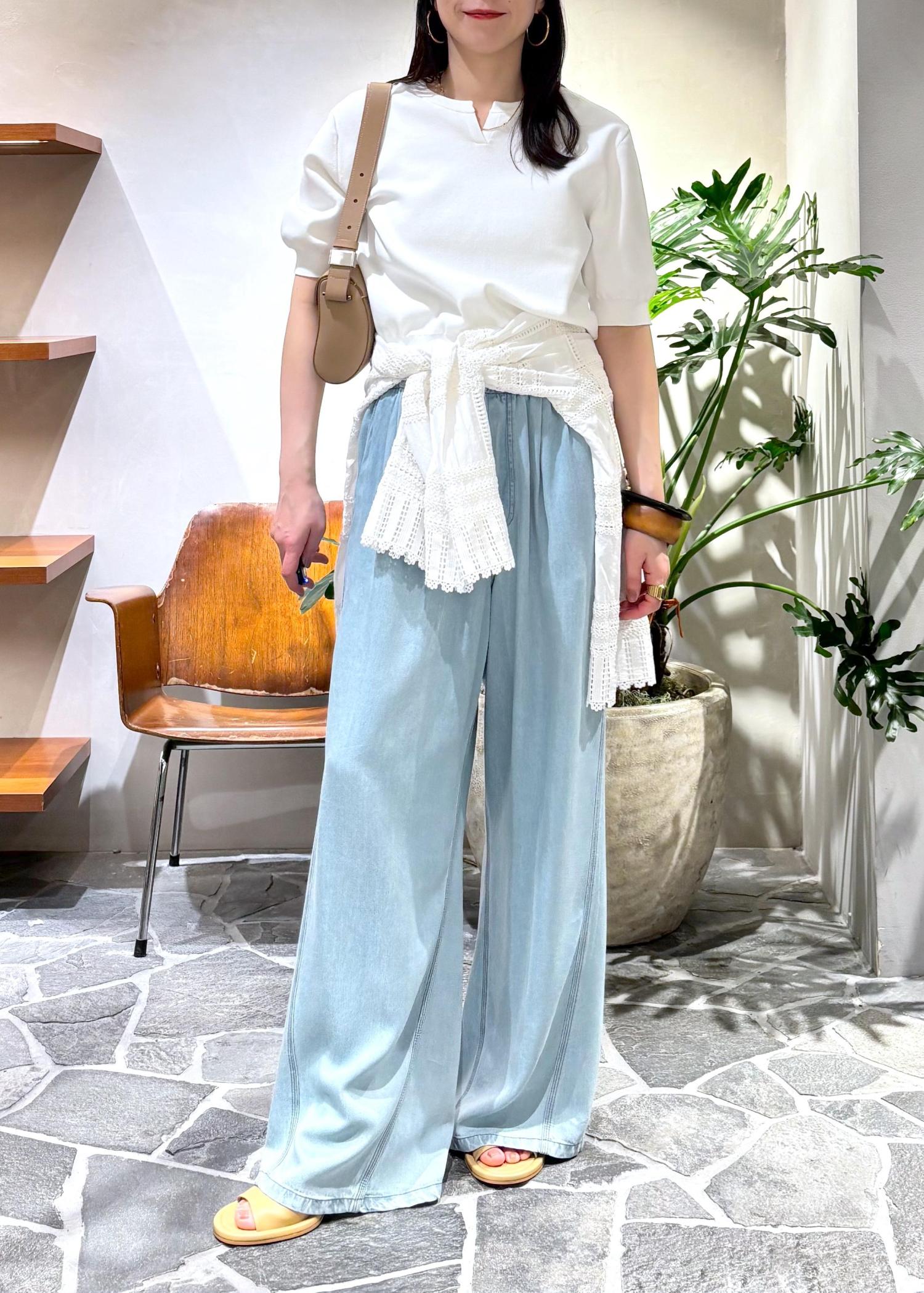 リアルバイで大活躍中のライトデニムイージーパンツをサマーニットで夏をイメージしてスタイリングしました!
