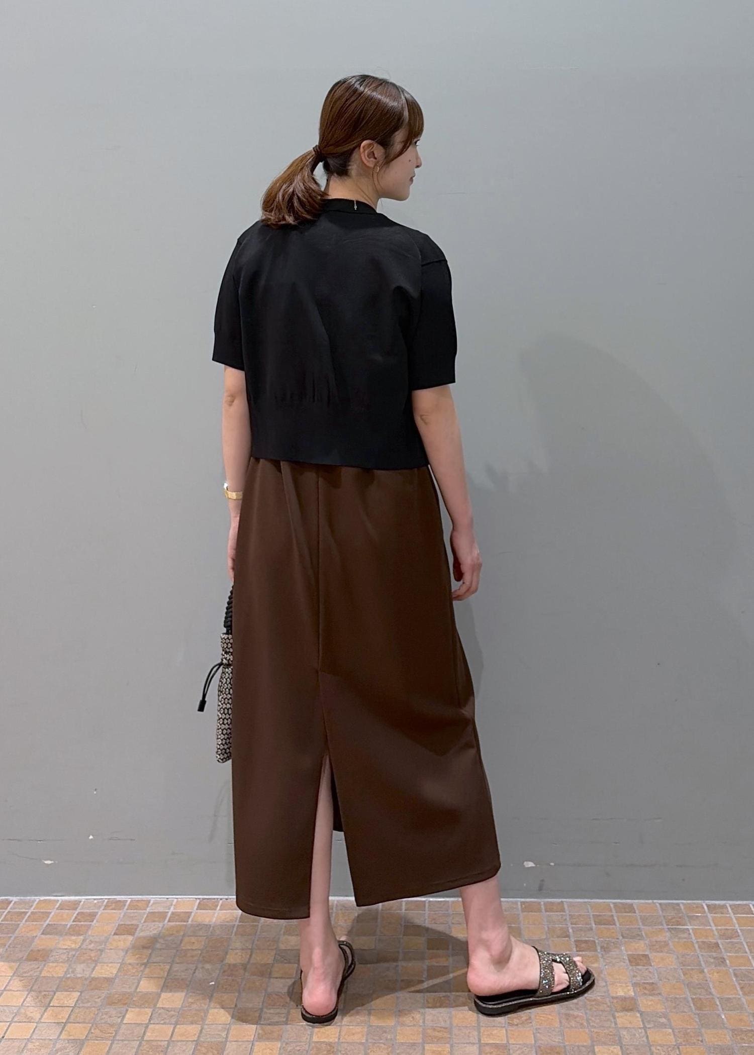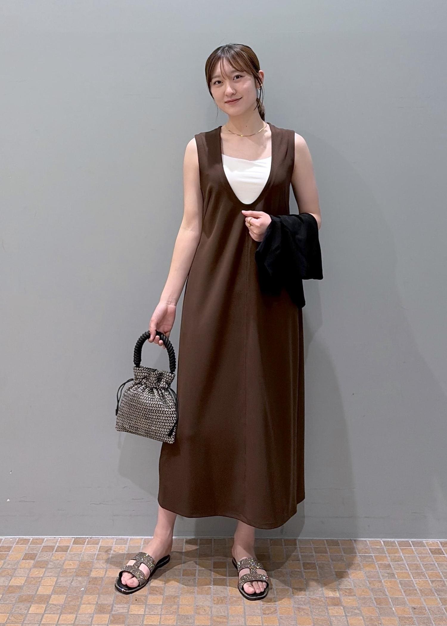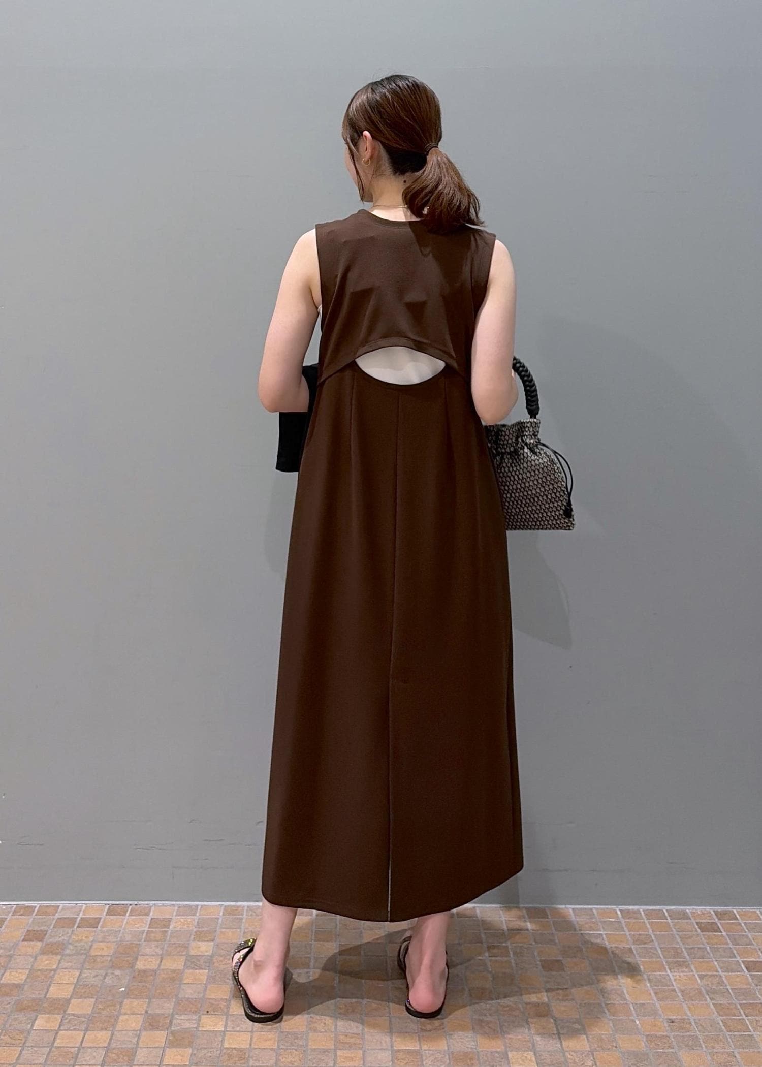 ADAM ET ROPÉ FEMMEディープネックカットソーワンピースブラウン / F¥20,900レビュー175cmでの長さです。深めのUネックと後ろのデザインが派手すぎず、女性らしい抜け感です!