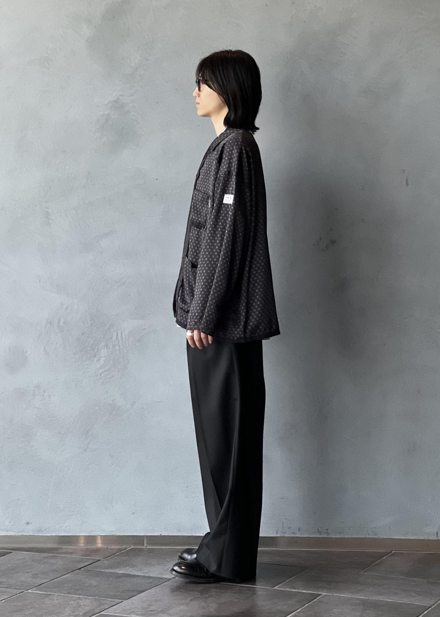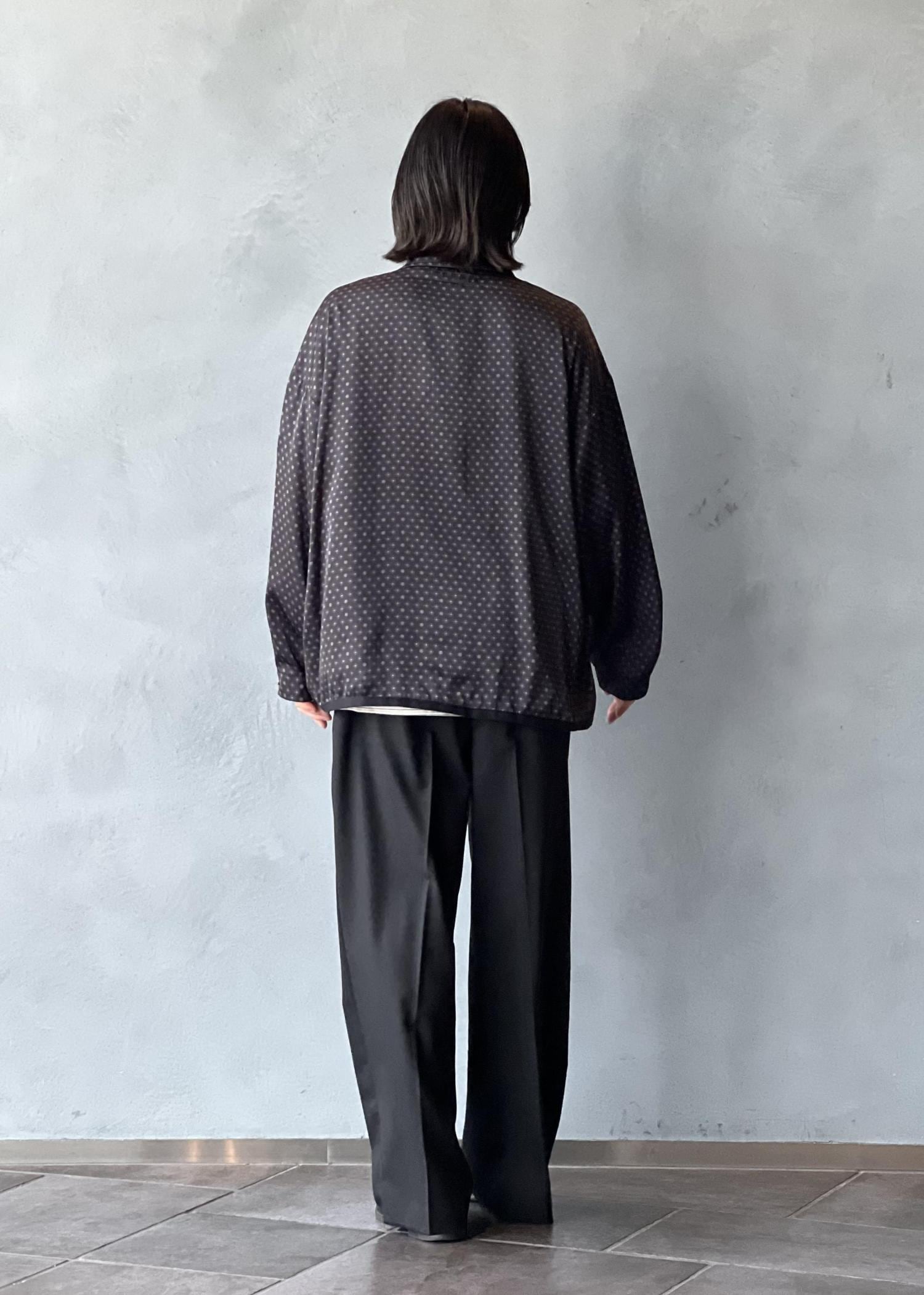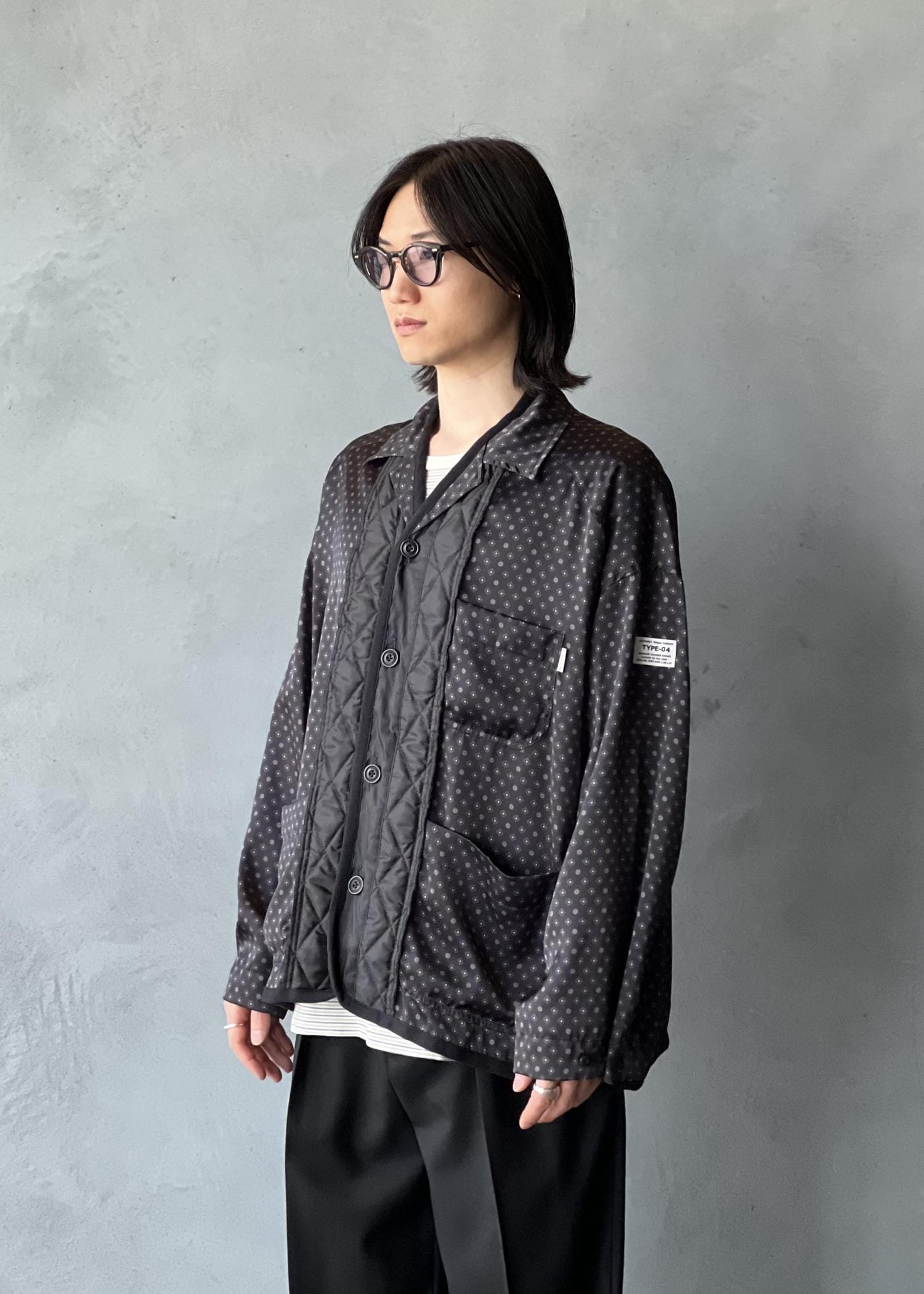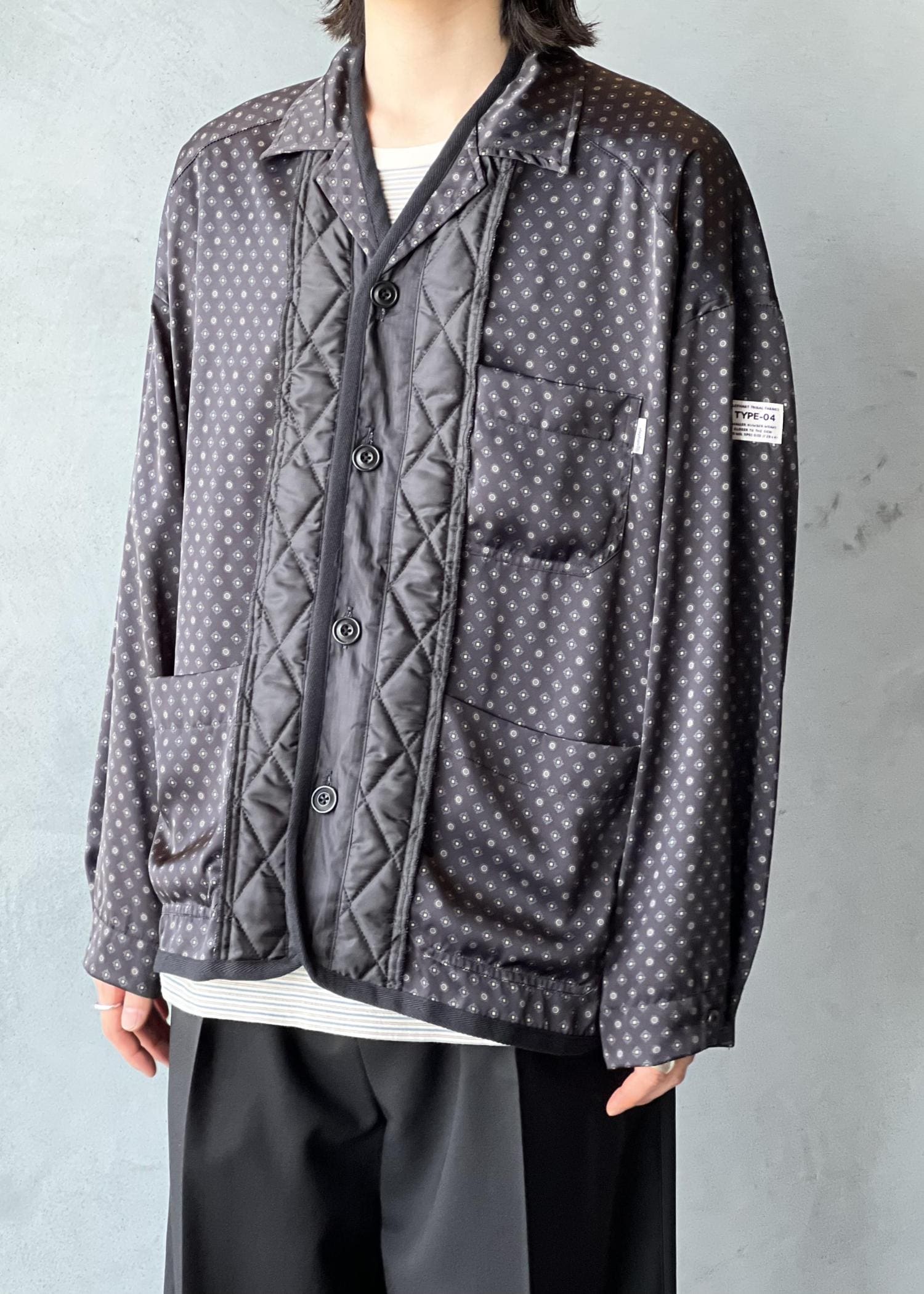 パジャマシャツとキルティングライナーをドッキングしたアイテム。柔らかくドレープ感のあるサテン生地に昇華転写プリントを施したオリジナルファブリックを使用。