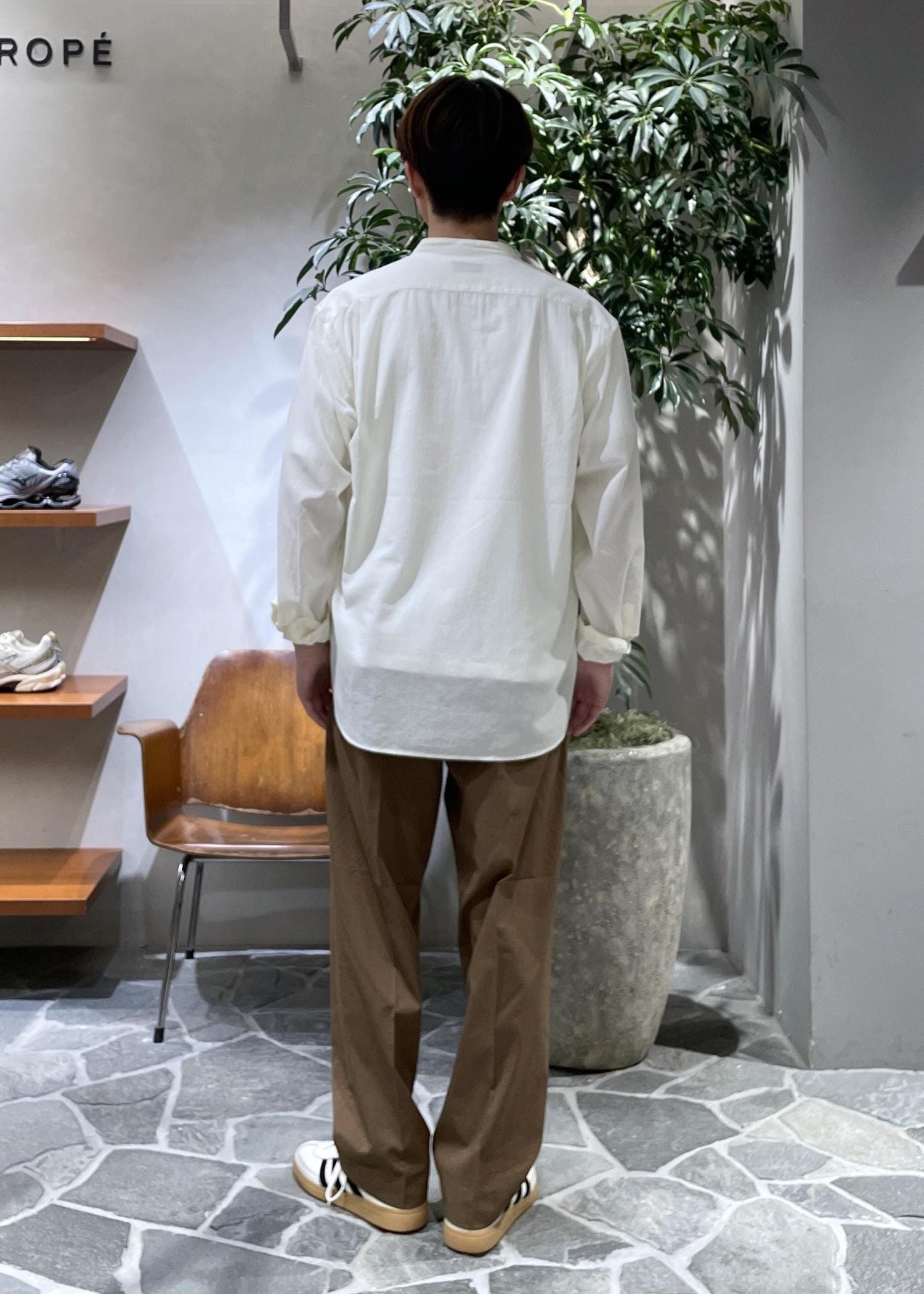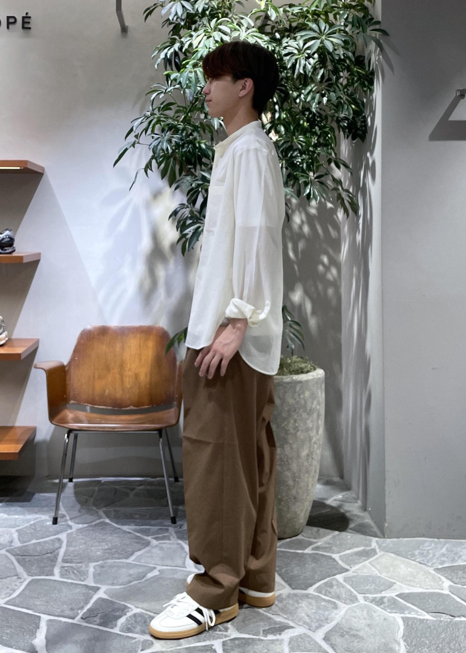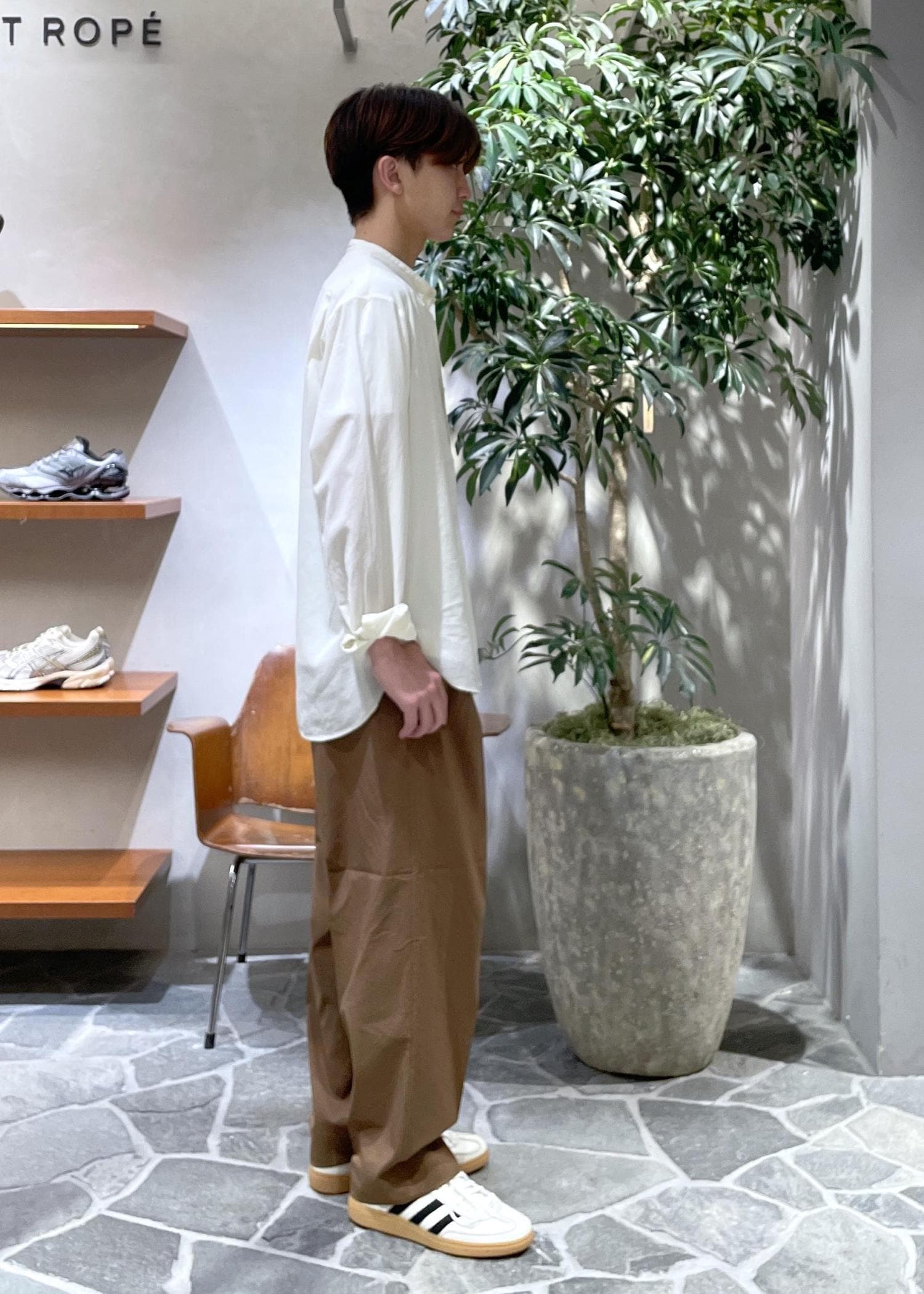トップスもパンツと軽量で清涼感のあるアイテムです。シューズはADAM ET ROPÉ別注スニーカーになります。柔らかいクリーム色が、どんなコーデとも合わせやすいと思います。