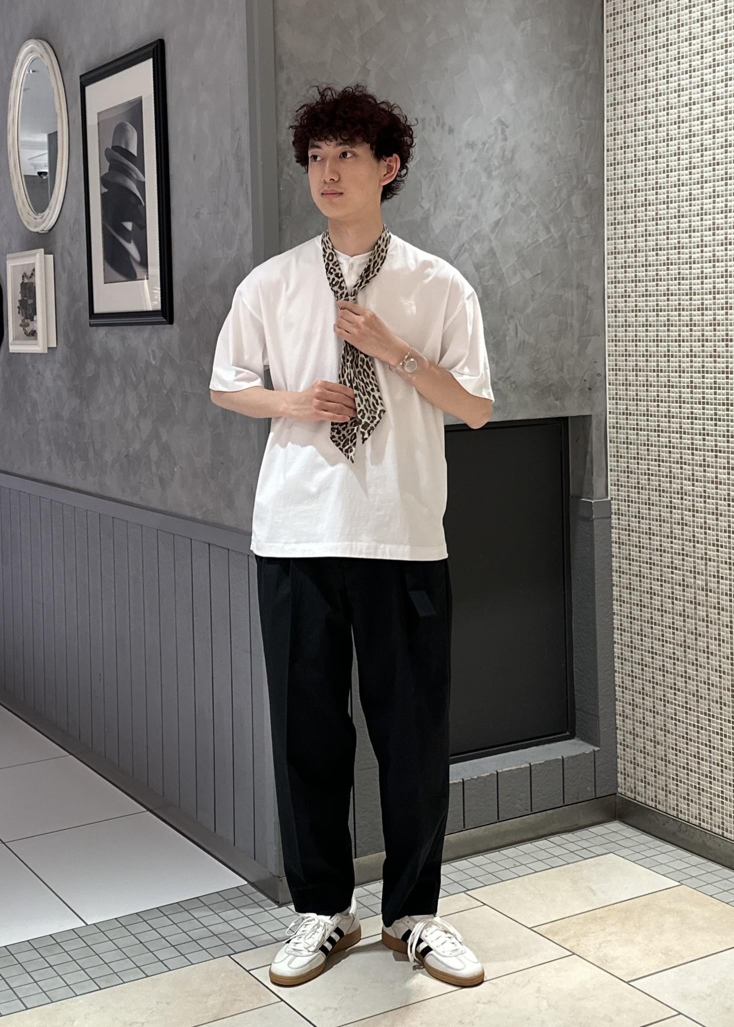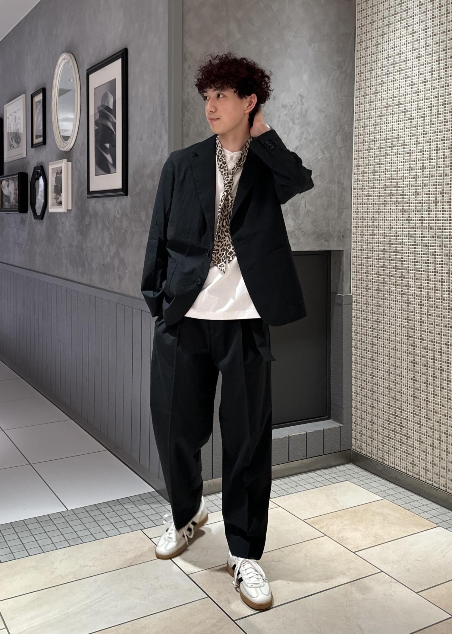シアサッカー素材の軽やかで涼しいセットアップにスカーフ、スニーカーで抜け感を出してみました。スニーカーはスポーティすぎず、キレイめやセットアップ、ドレススタイルにも馴染むものです。スカーフと合わせてカッチリしすぎない塩梅で上品さと遊び心を出してみました。