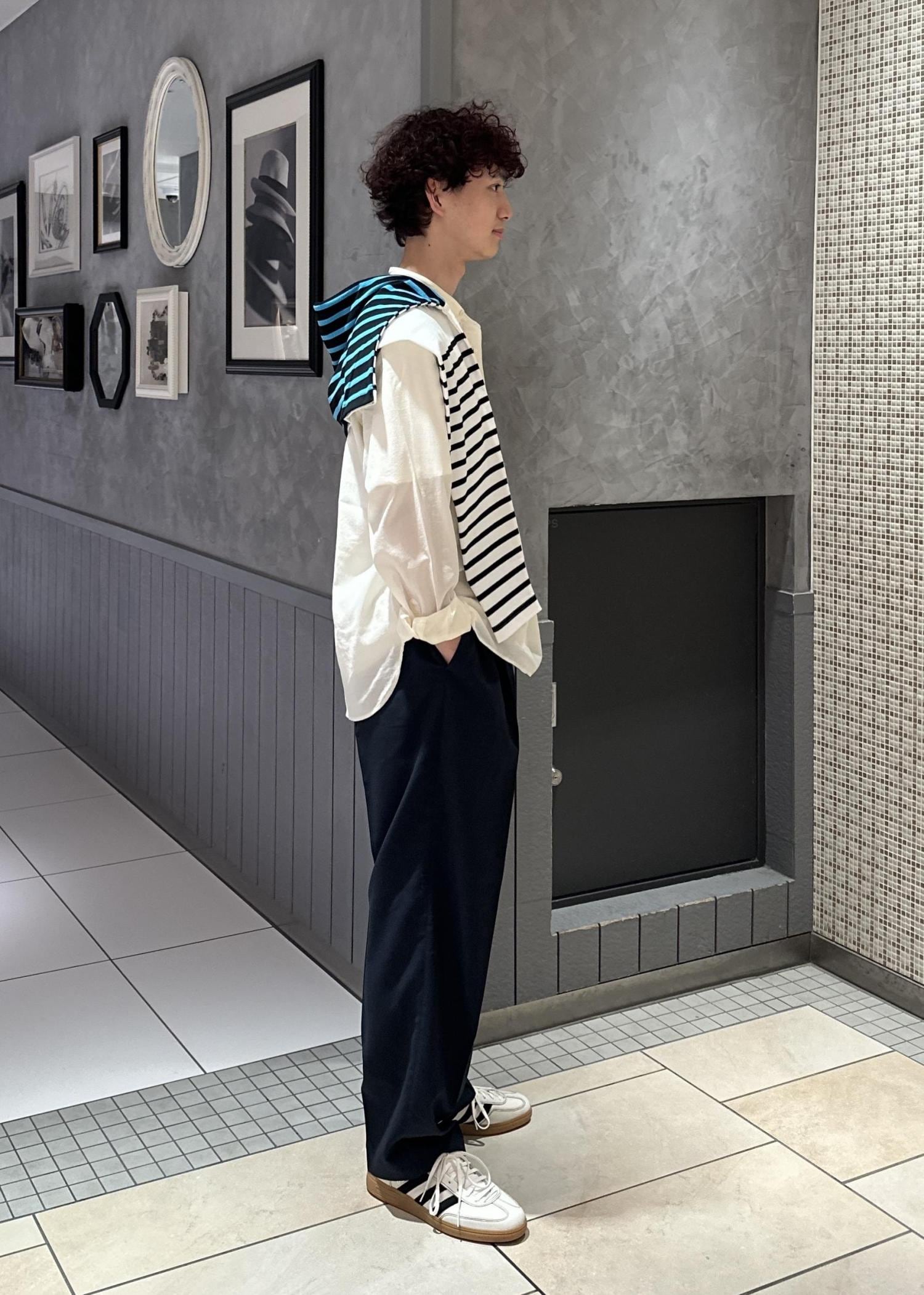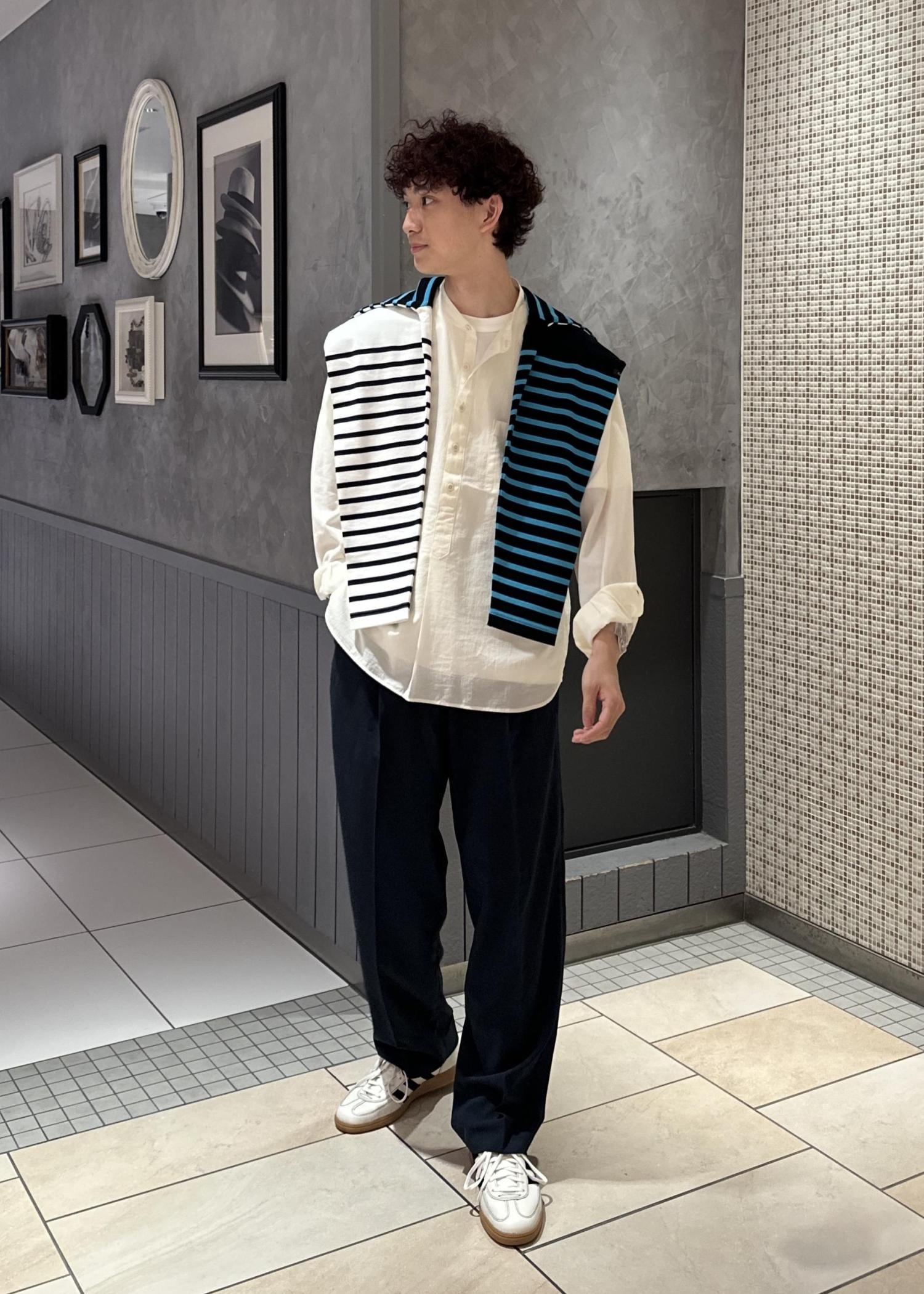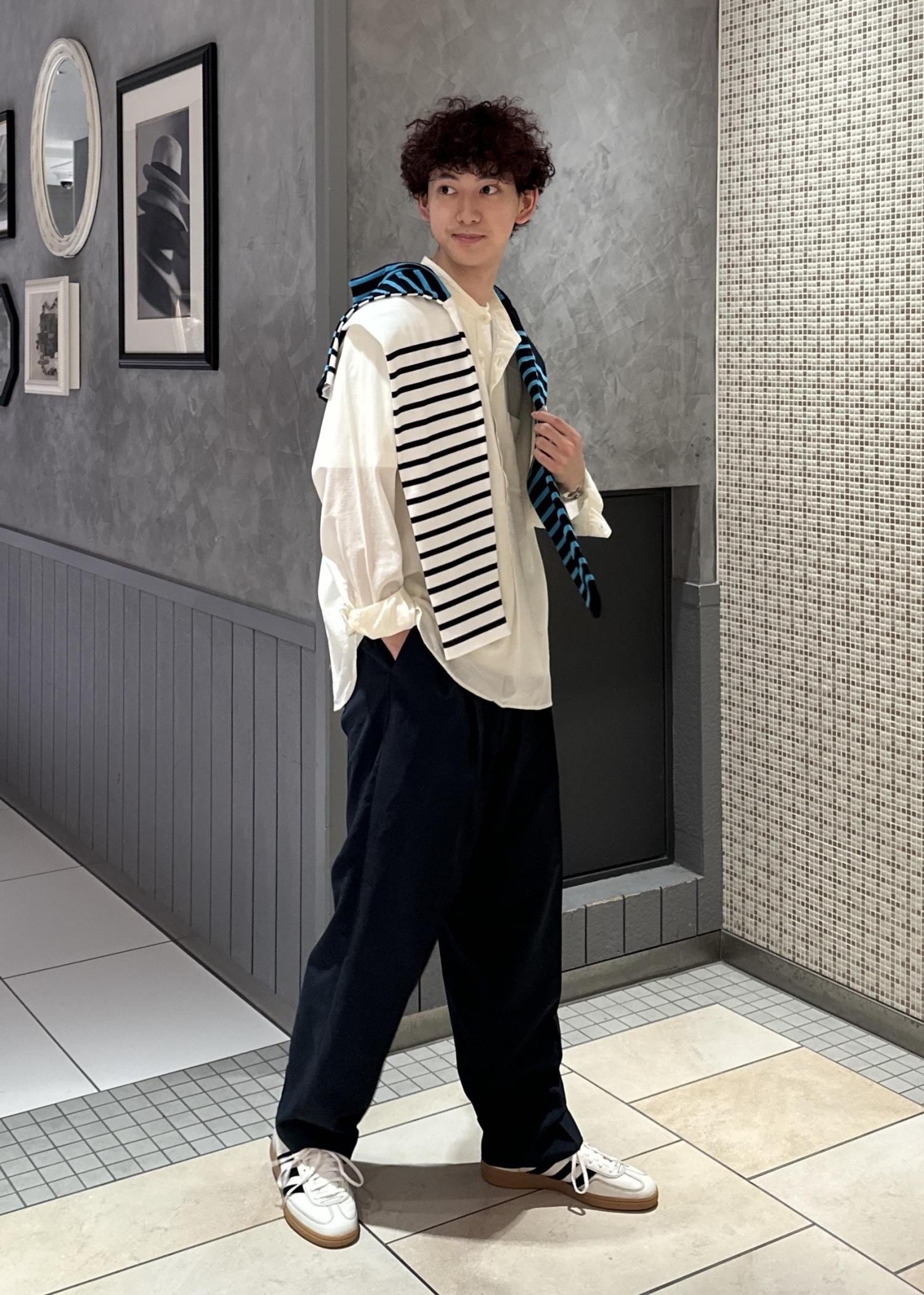ボーダーのロンTを差し色にした肩掛けコーデ。シンプルにネイビースラックス、白シャツと合わせ、寒色でリンクさせました。足元には上品な白スニーカーを。大人なレイヤードスタイルを意識しました。