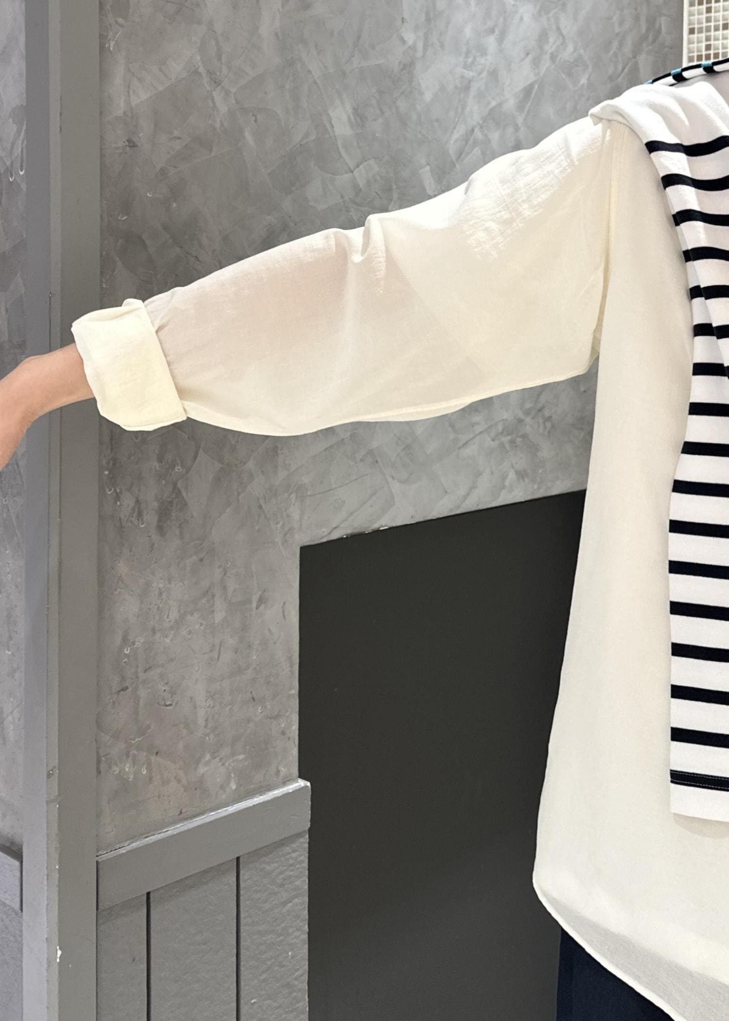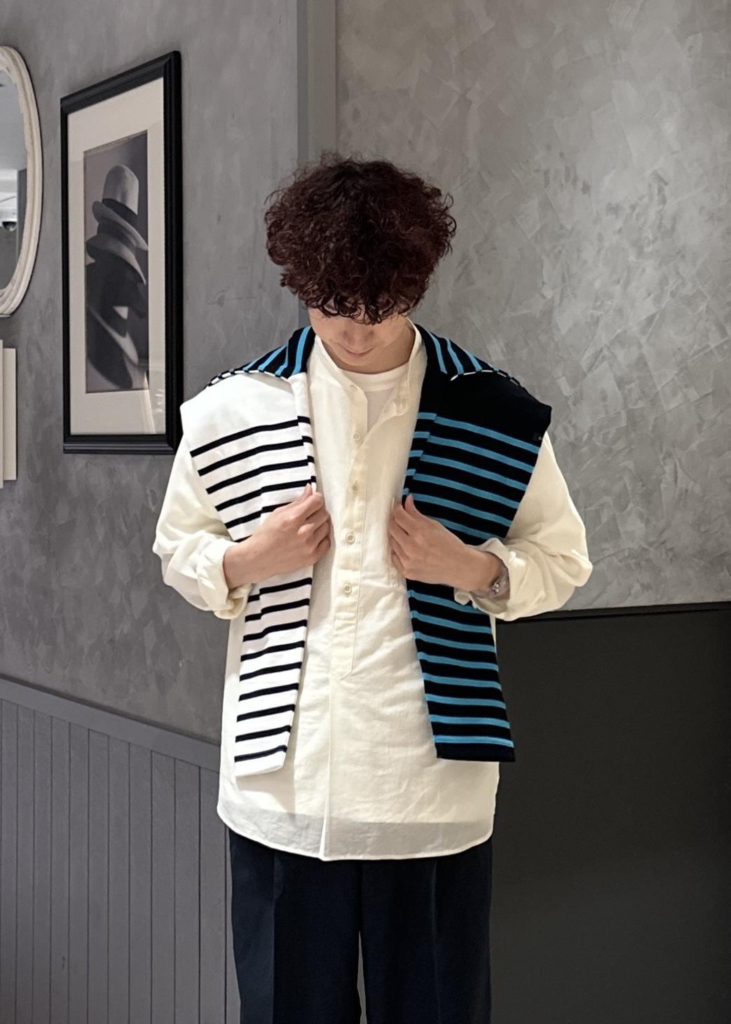プルオーバー仕様のバンドカラーシャツ。シアーの素材なので涼しく着用できます。ややルーズなサイズ感で、リラックス感があります。