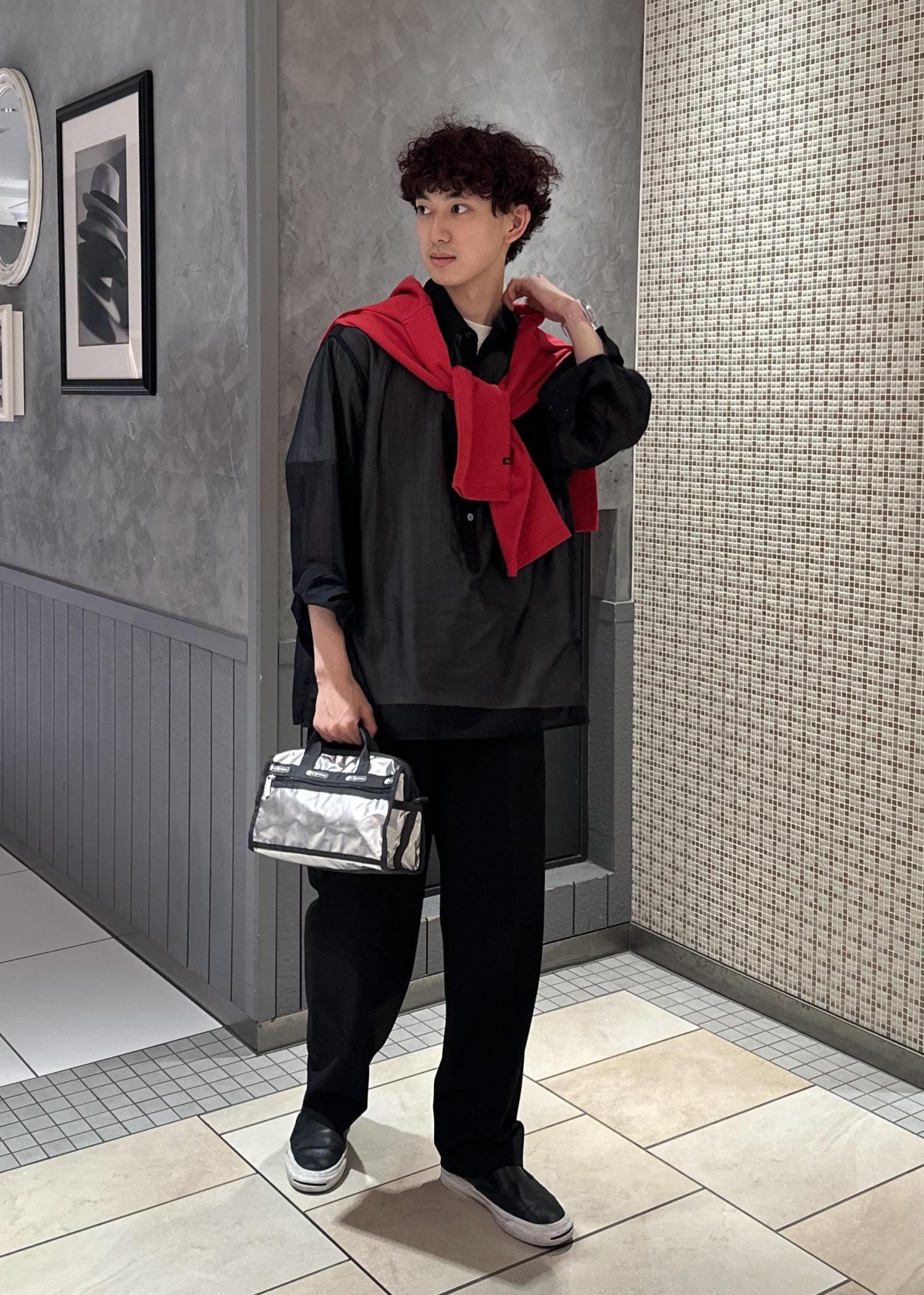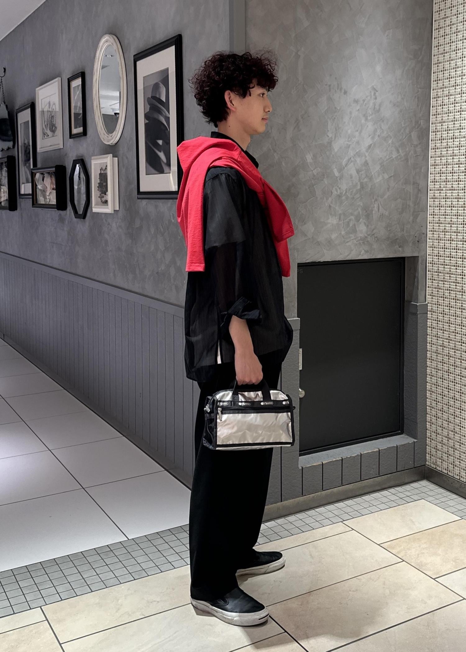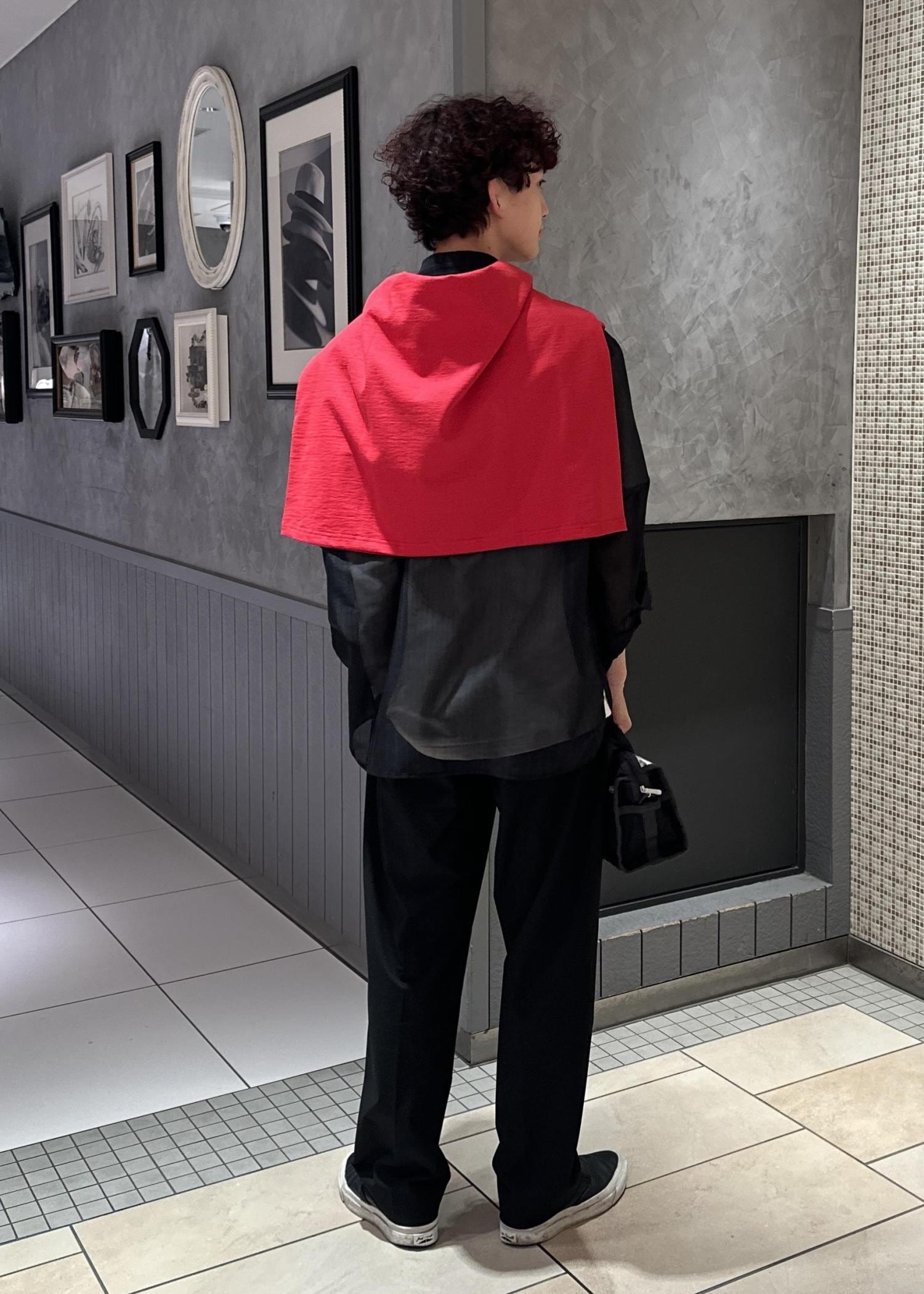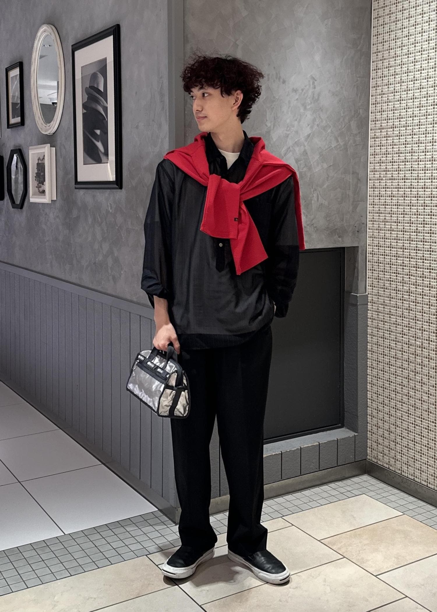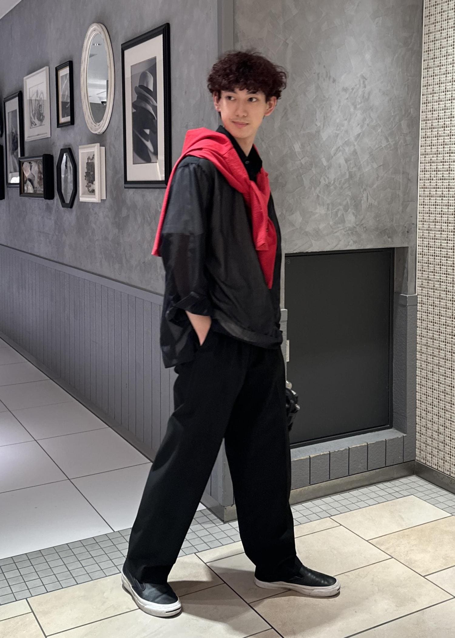 赤の差し色が映えるモードなコーデ。オールブラックの上から赤を差すことで差し色を際立たせました。バッグにシルバーがアクセントです。