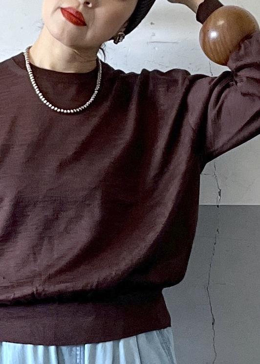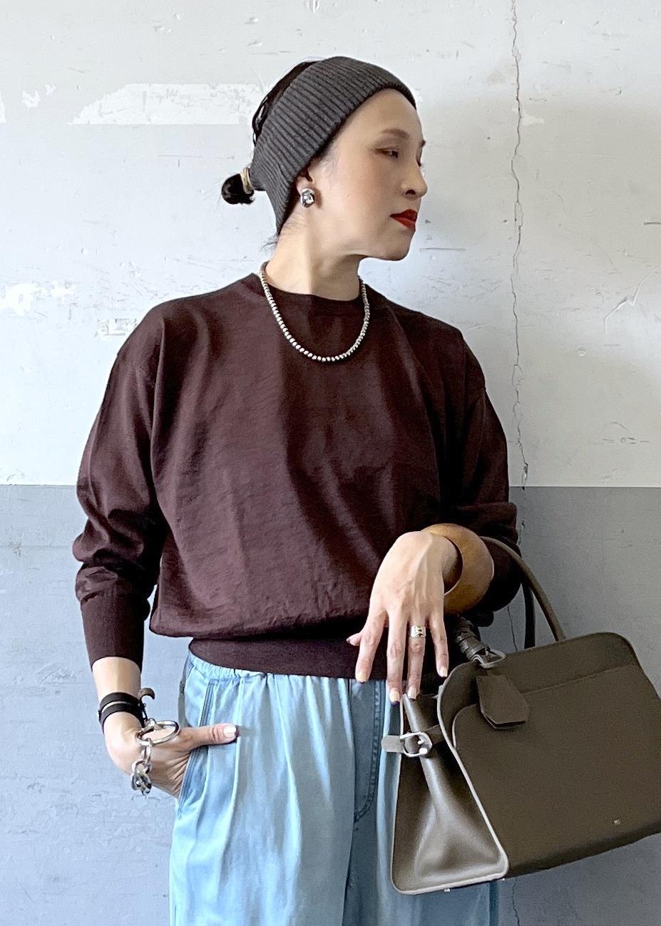ラミー100%の上品な艶と張り感のあるシンプルニットです。サイズはジャスト。インナーにTシャツやタンクトップ、オーバーサイズではないシャツのレイヤードは可能です。