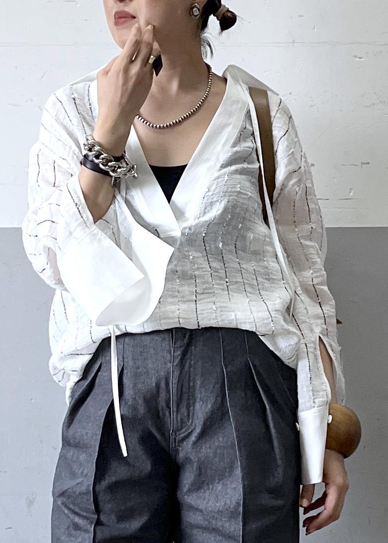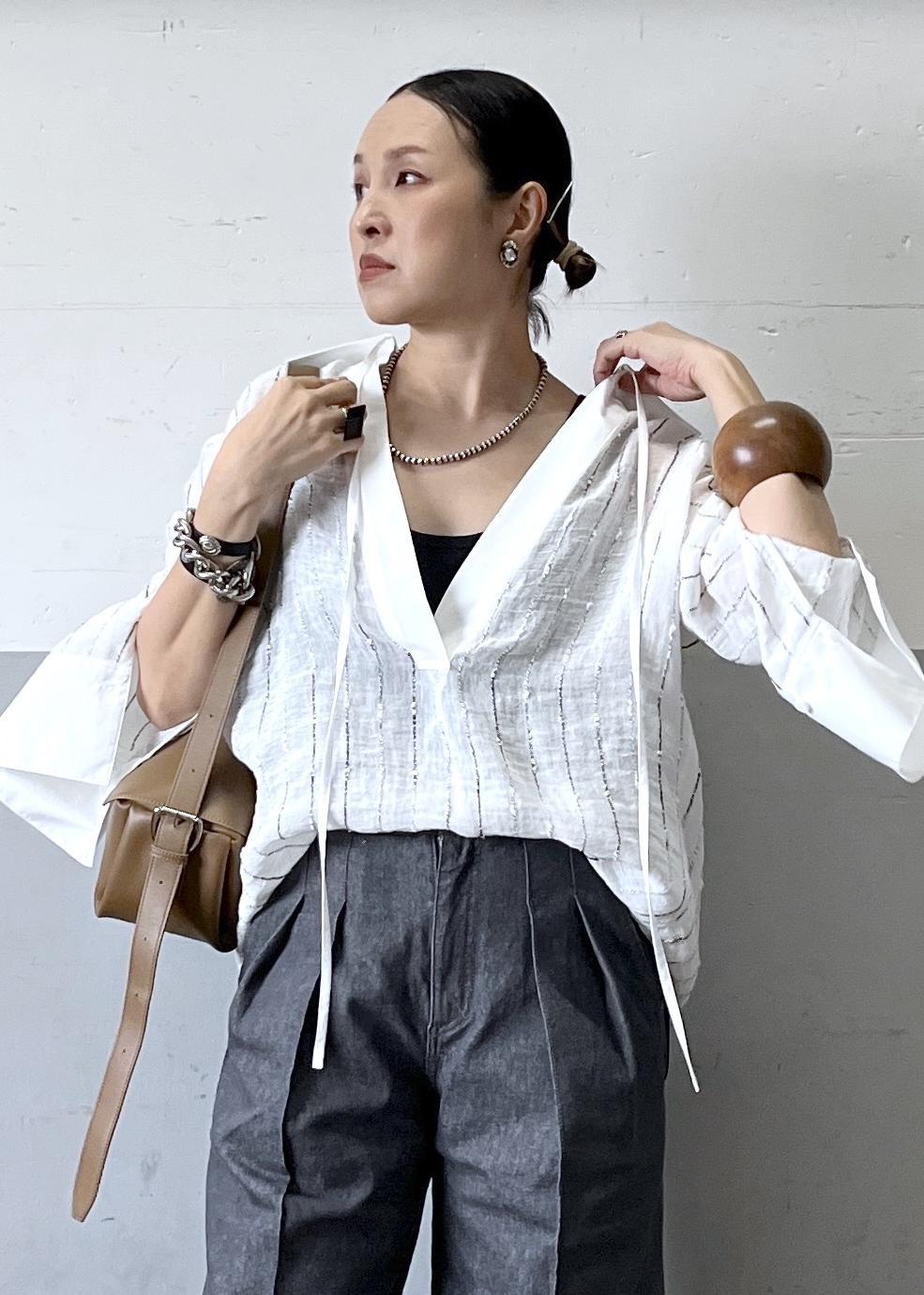 EMOELLE【EMOELLE】リラクシーシャツホワイト系 / F¥39,600レビューリネン混のスキッパーブラウス。ストライプの織りが入って抜け感があり、大人のニュアンスが感じられる1枚。夏場でも涼しく着ていただけそうです。