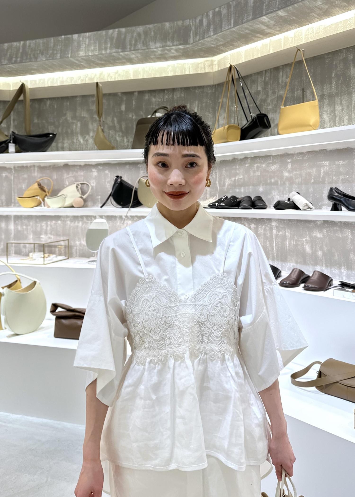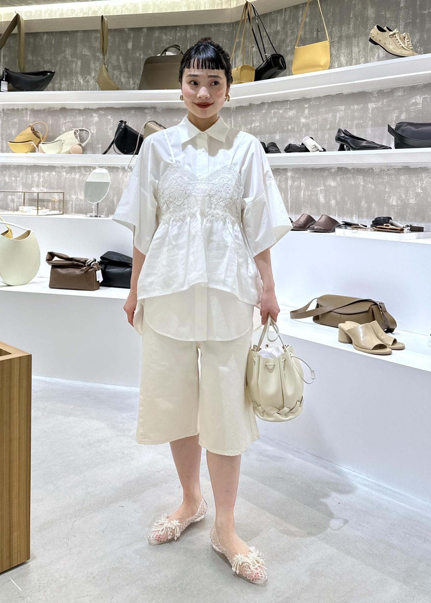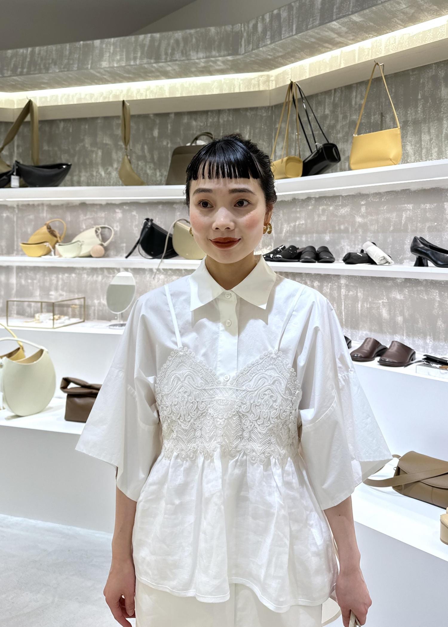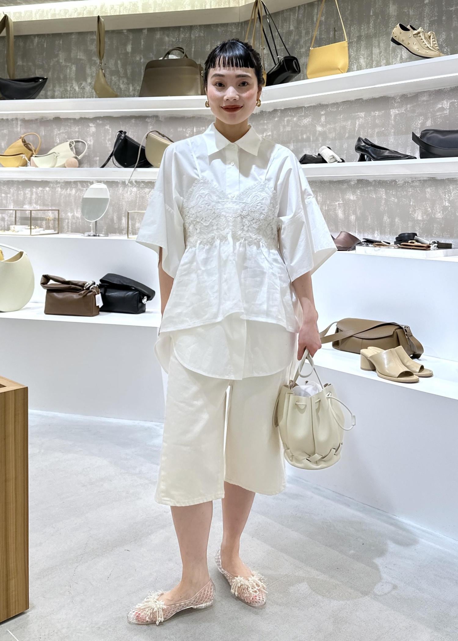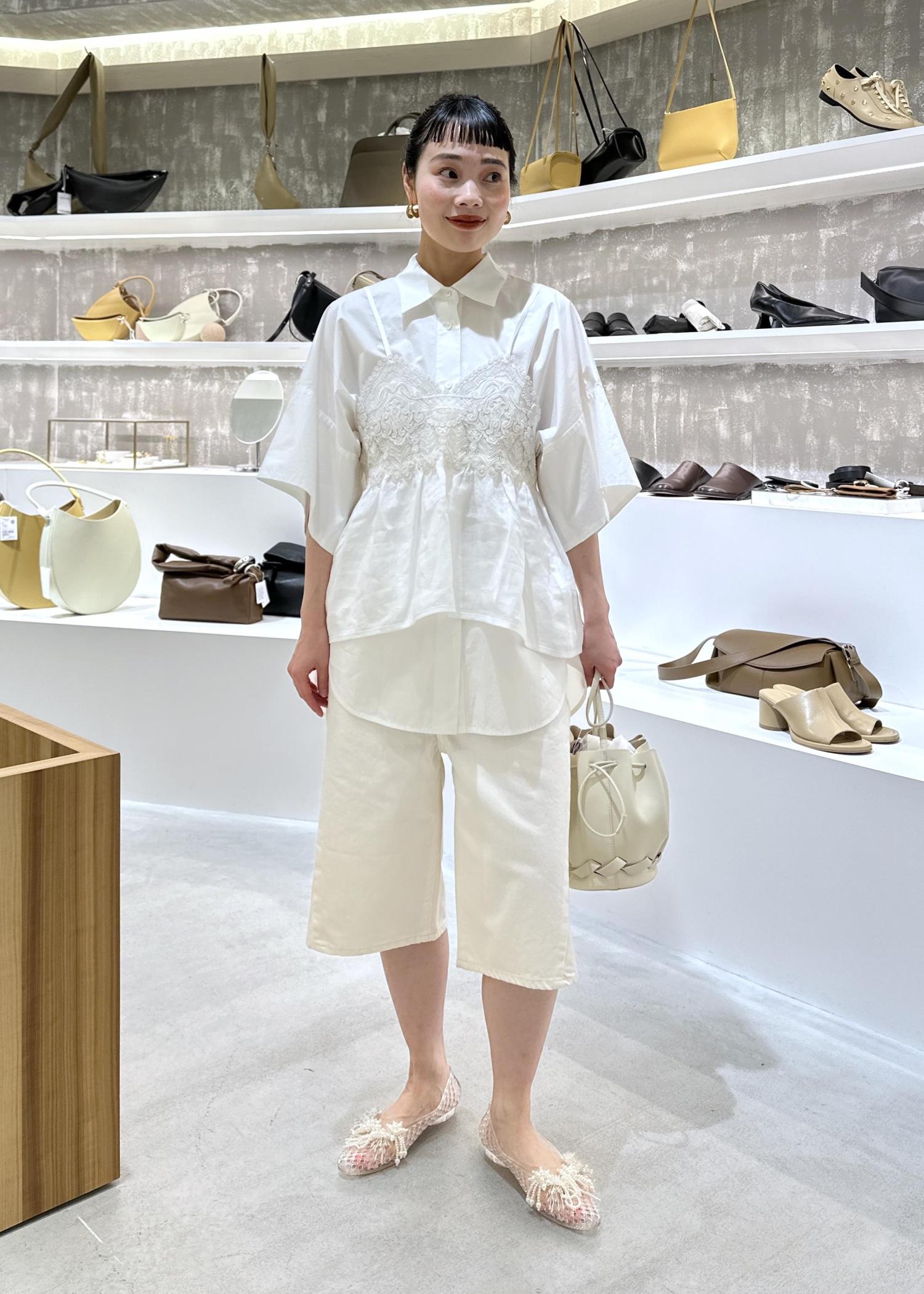シャツとレースキャミのレイヤードスタイル