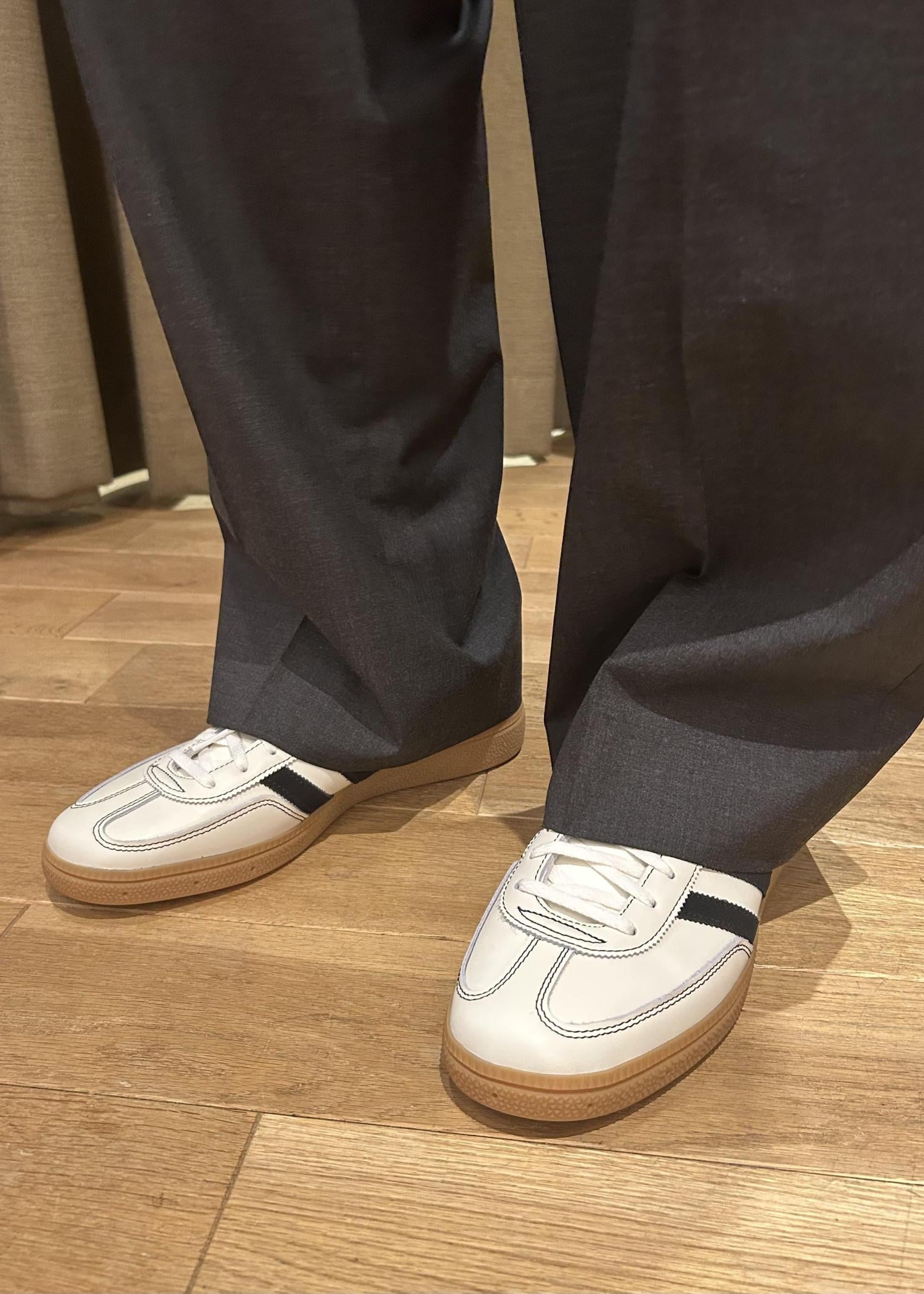 個人的に真っ白のスニーカーは苦手意識があるんですがこのシューズは少しクリームっぽい白に黒のスリーストライプ、ガムソールの配色で足元が馴染みやすいので、これなら自分でも気にせず履けそうです。