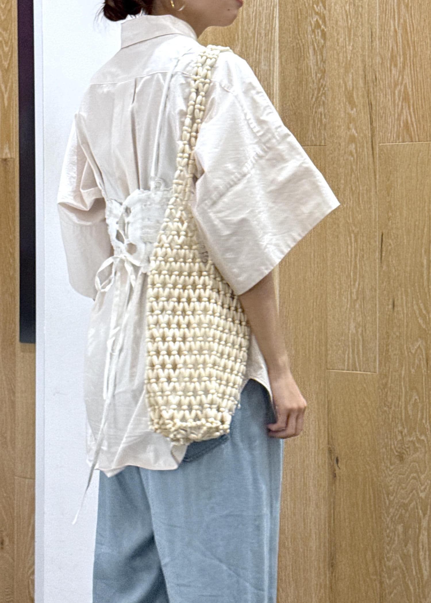 ADAM ET ROPÉ FEMMEウッドビーズバッグオフホワイト / F¥15,400レビュー縦長デザインで長財布が入ります。ビーズの隙間から中が見えるので、小物を巾着やポーチにいれてもいいと思います。