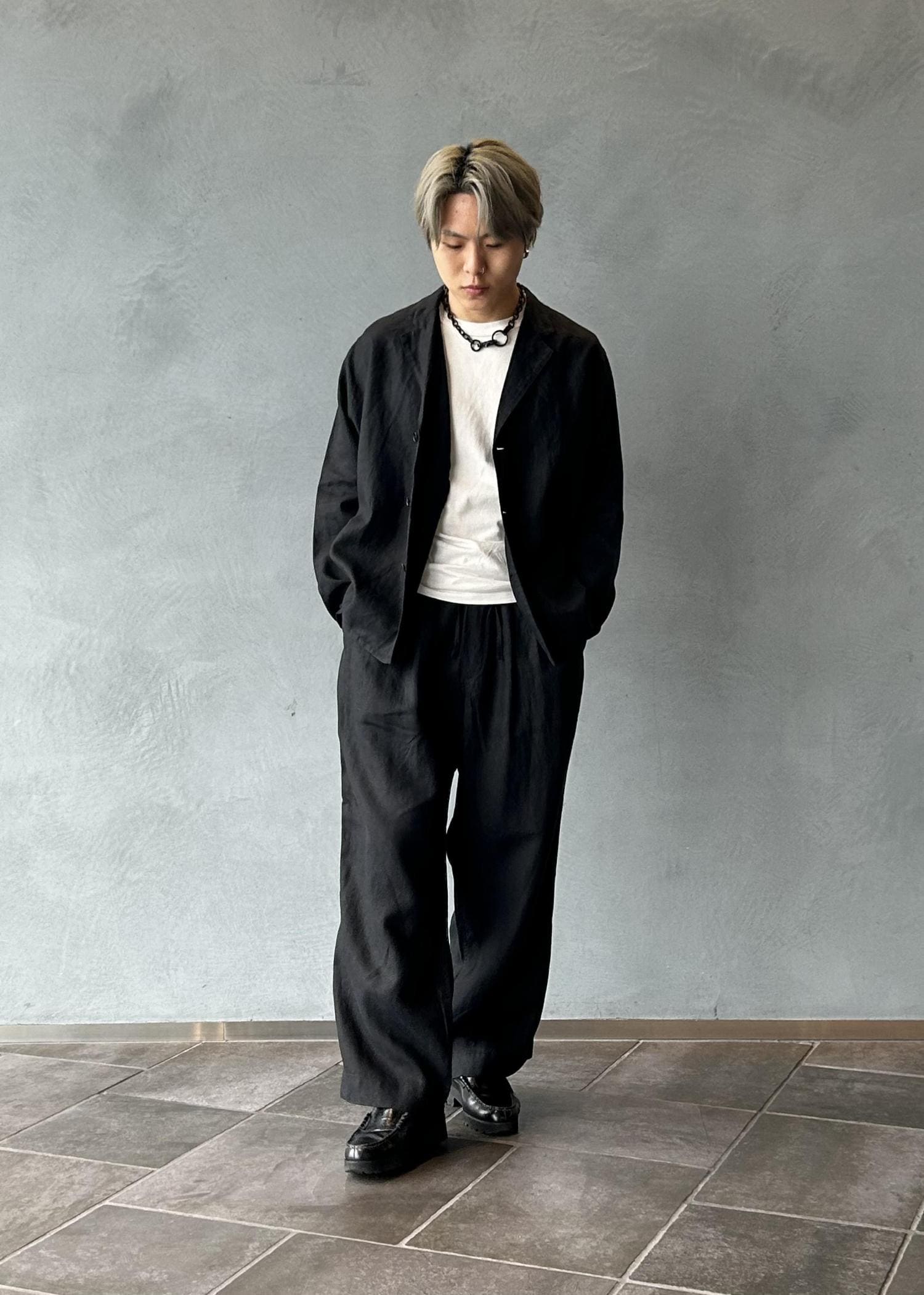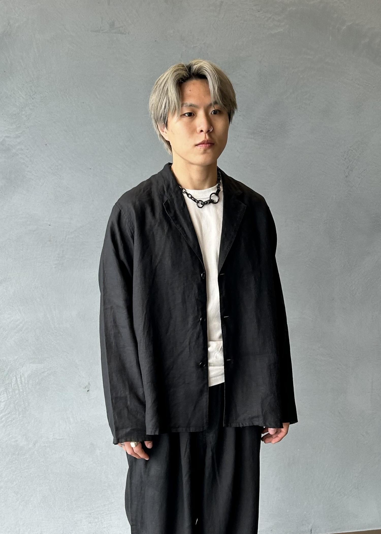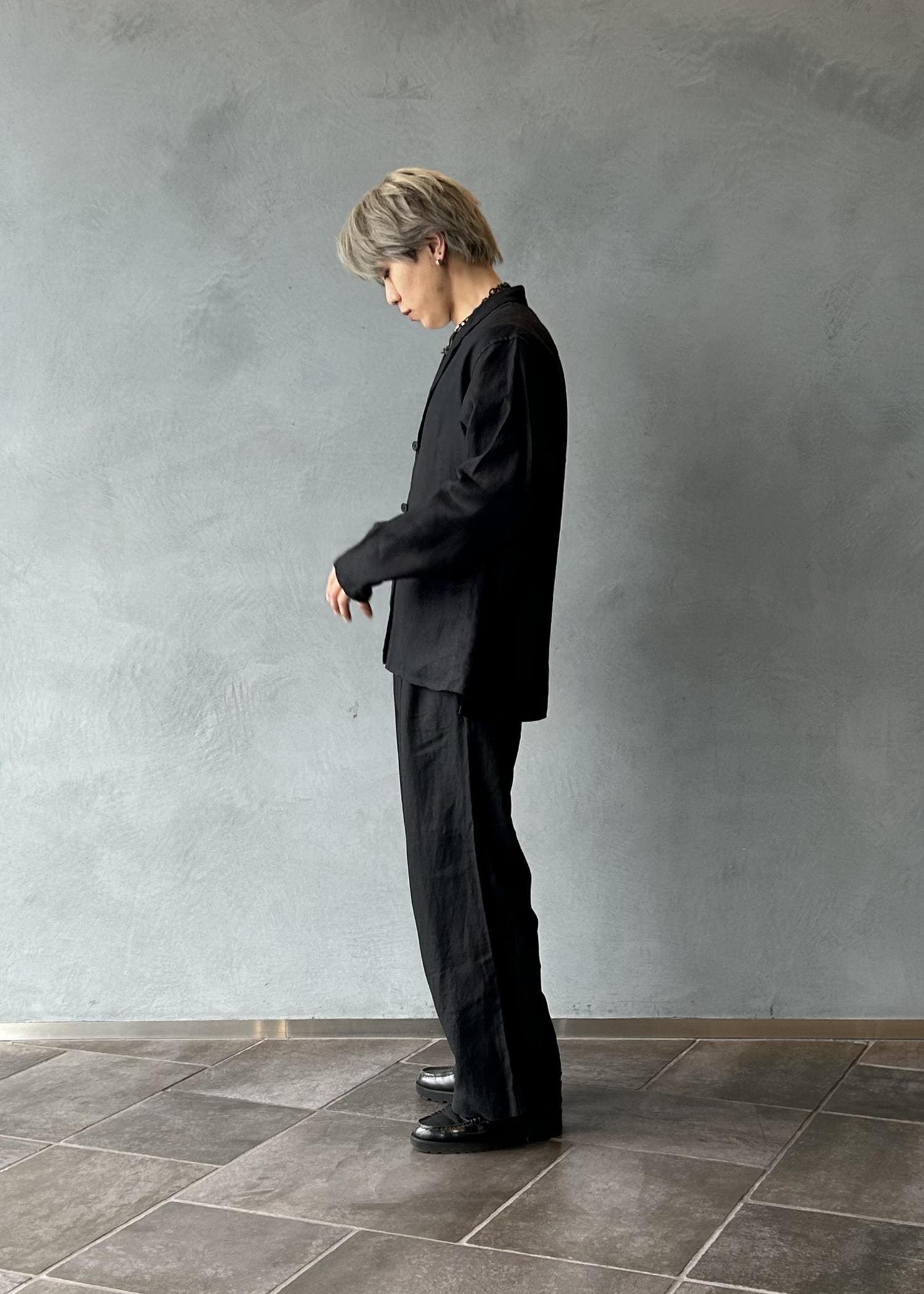 リネン素材のジャケットとパンツを使用したセットアップスタイリングです。