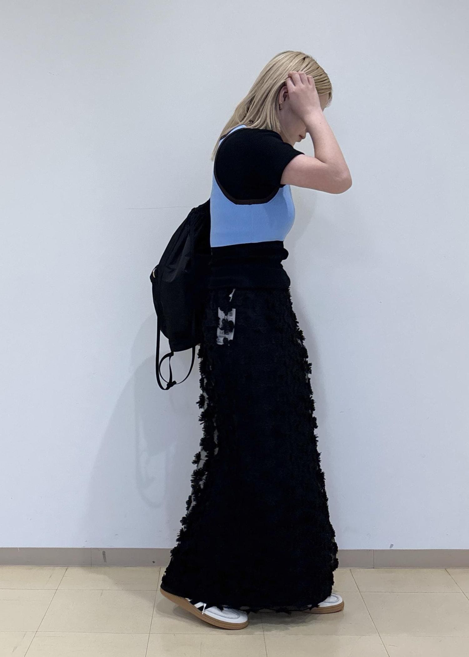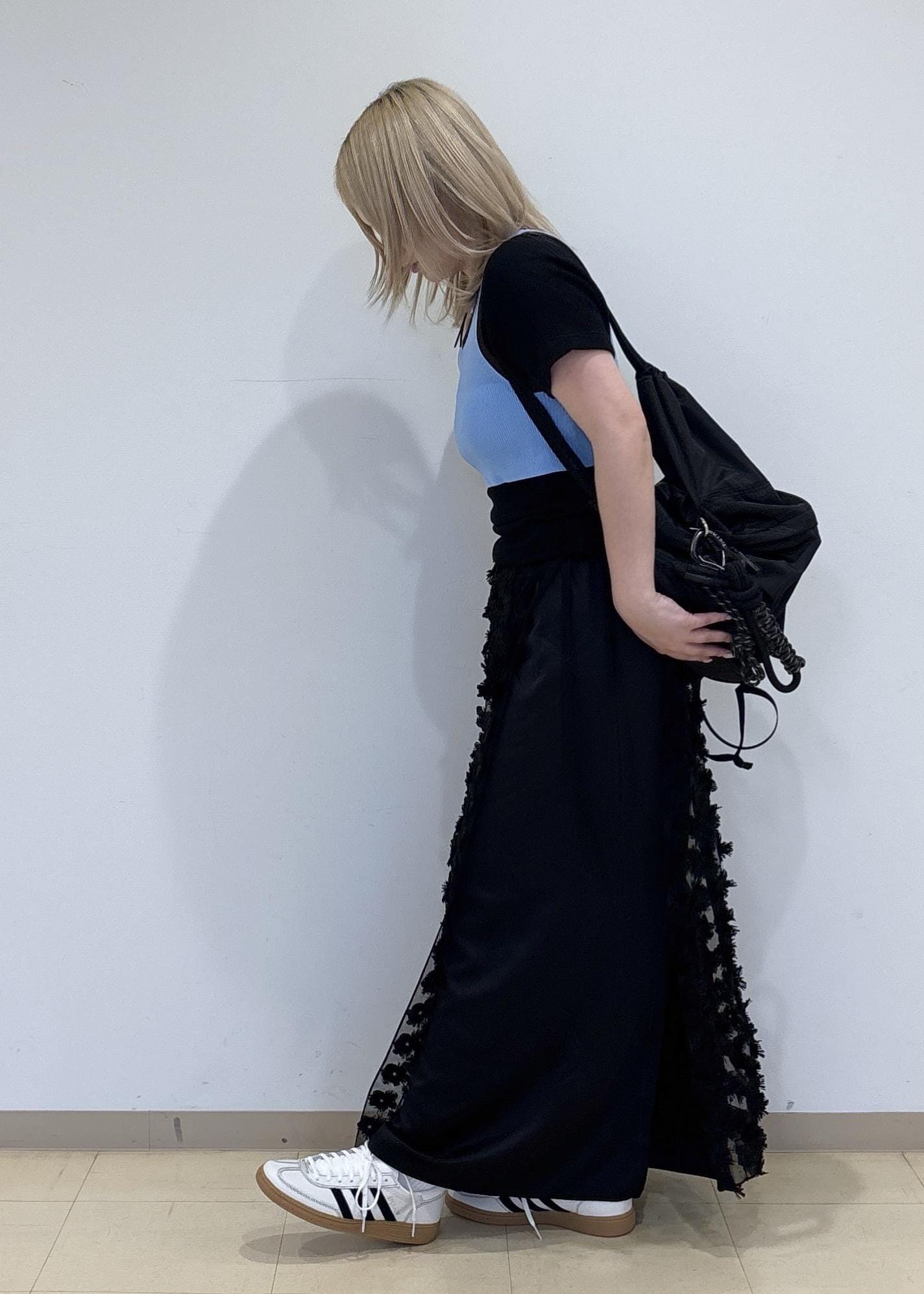 ADAM ET ROPÉ FEMMEフラワーチュールラップスカートブラック / F¥18,150レビュースカートとしてもインナーを外してパンツとのレイヤードスタイルでも着ていただけるので雰囲気を変えて、着回しの効くアイテムです。