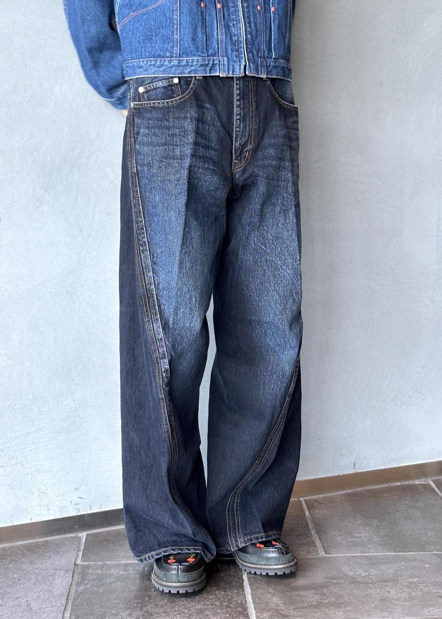 パンツはNVRFRGTのインディゴデニムで、フェード感のある色味がいいバランスに。