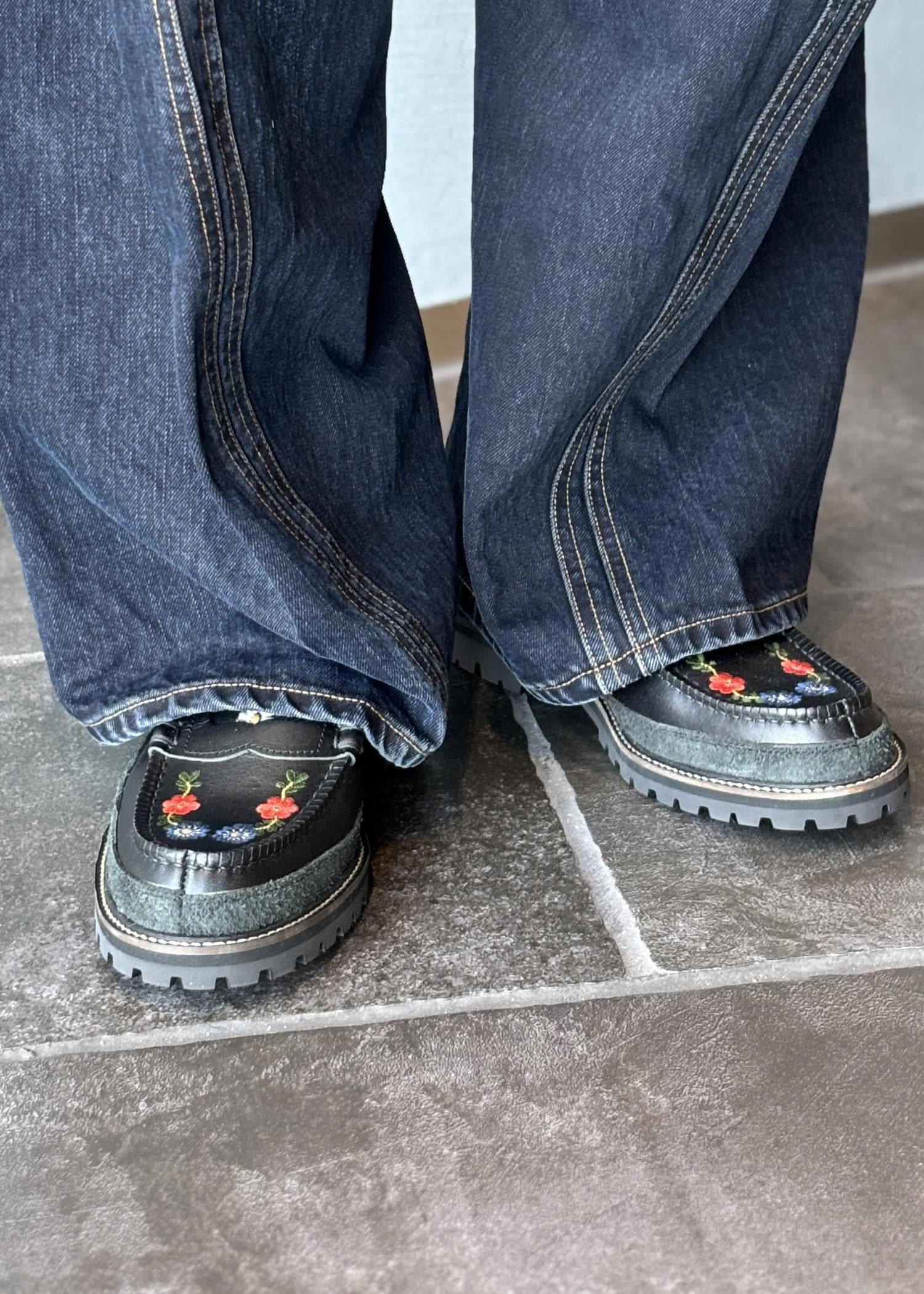 足元はKYOU × HARUTAのローファー(ADAM ET ROPE別注)。