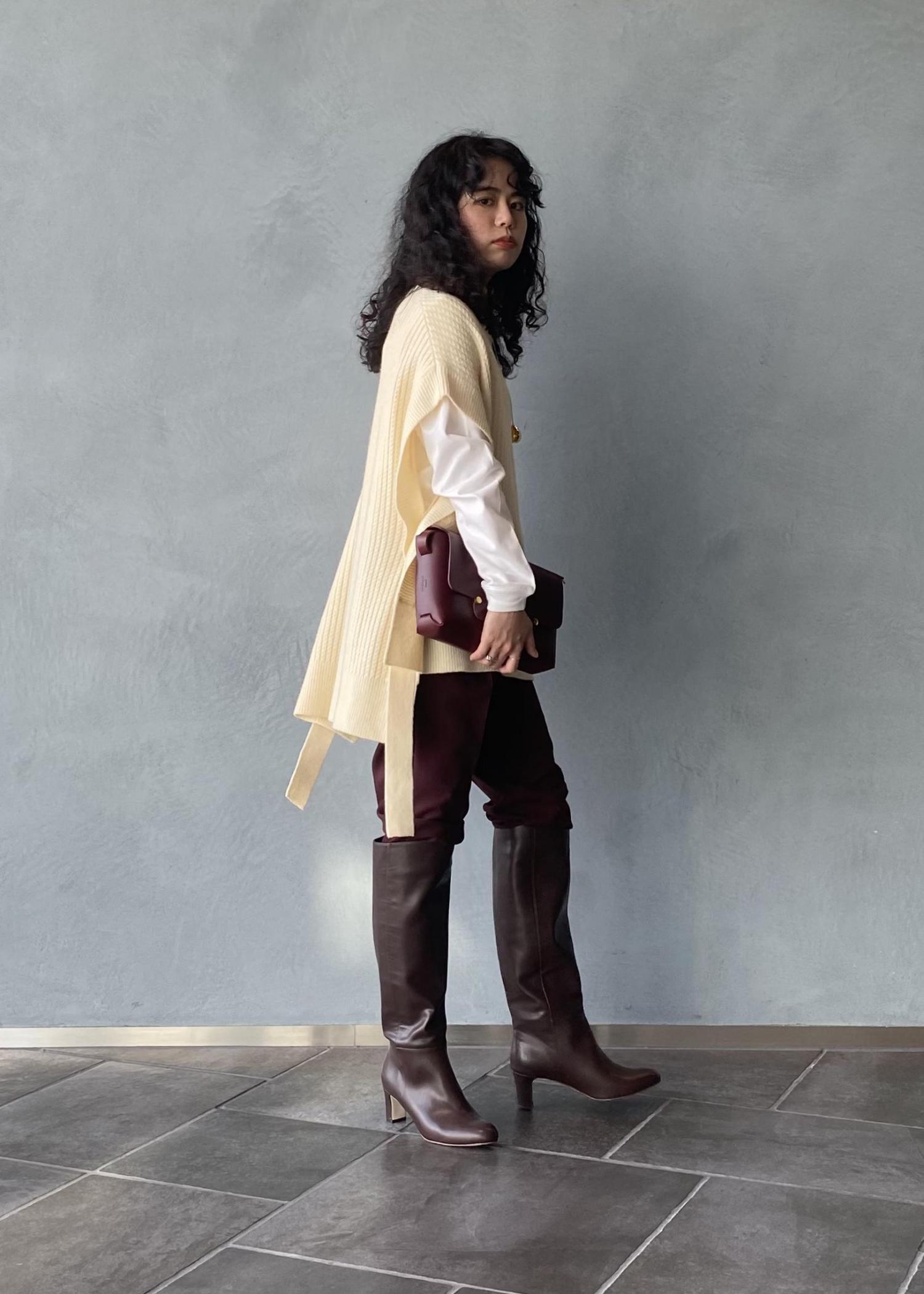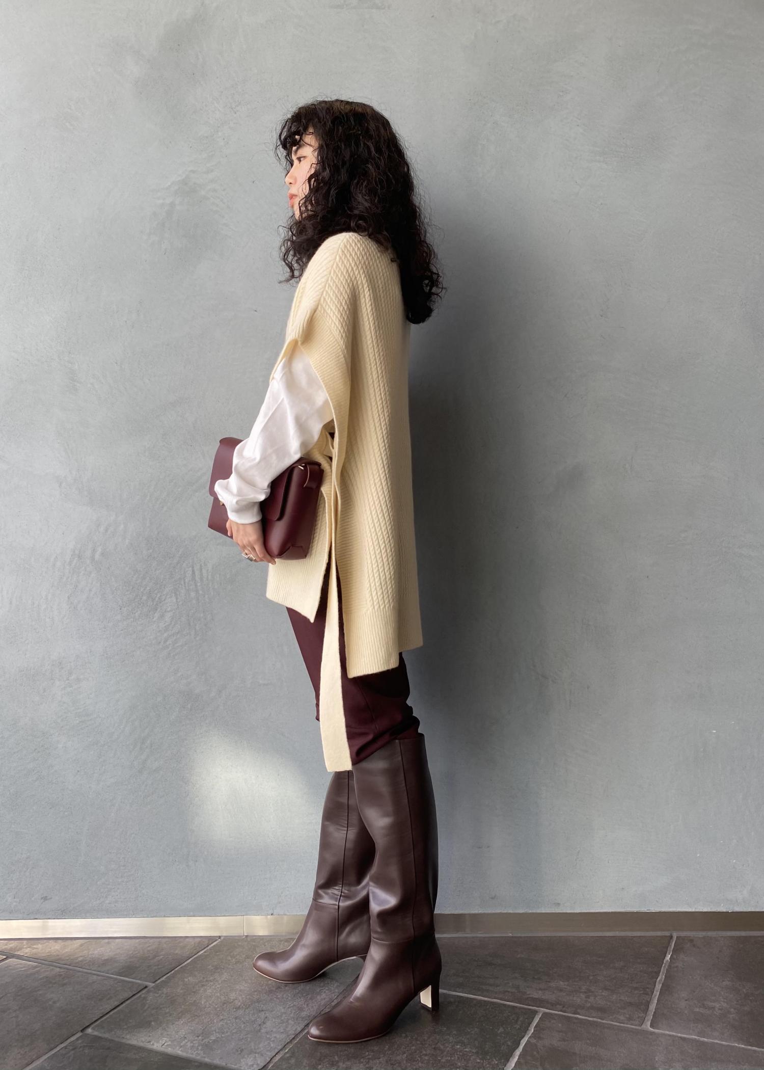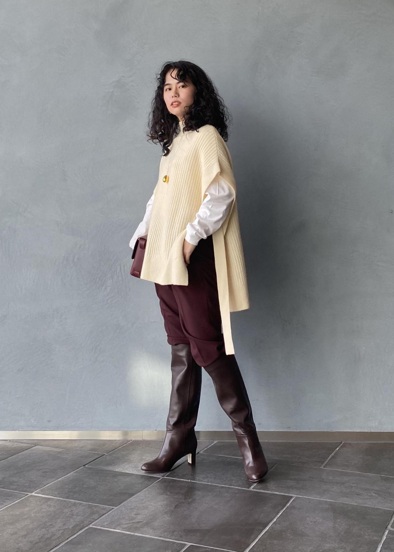 思い切ってパンツインしてブーツを主役にスタイリングしてみました。
