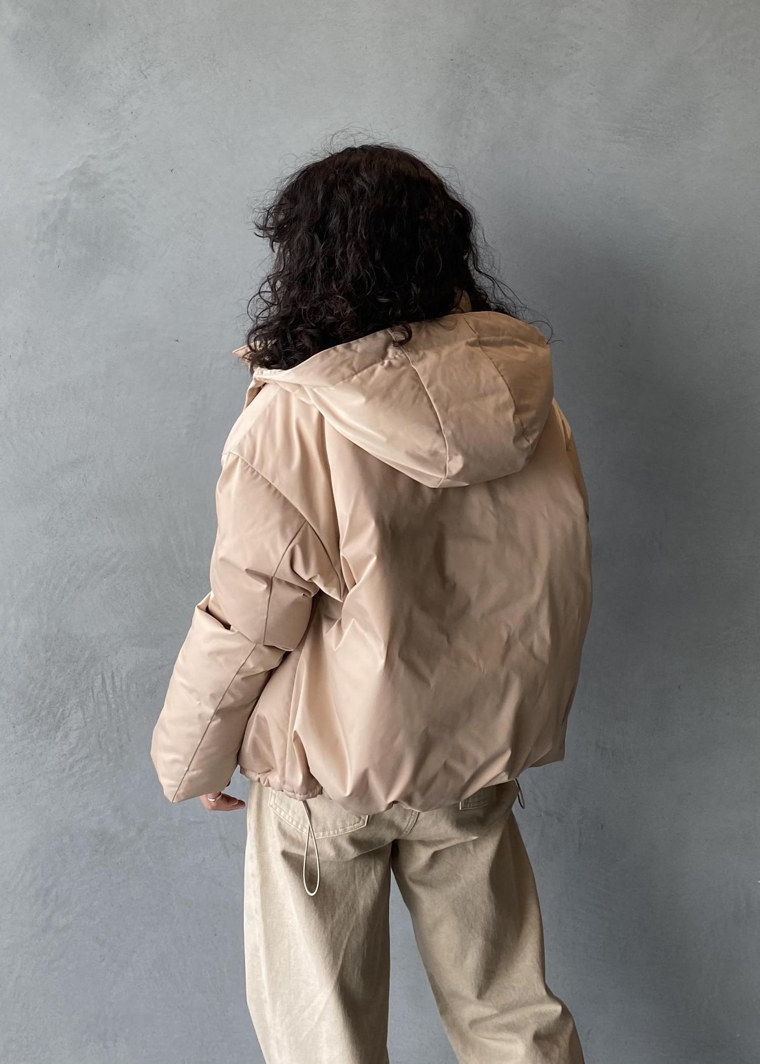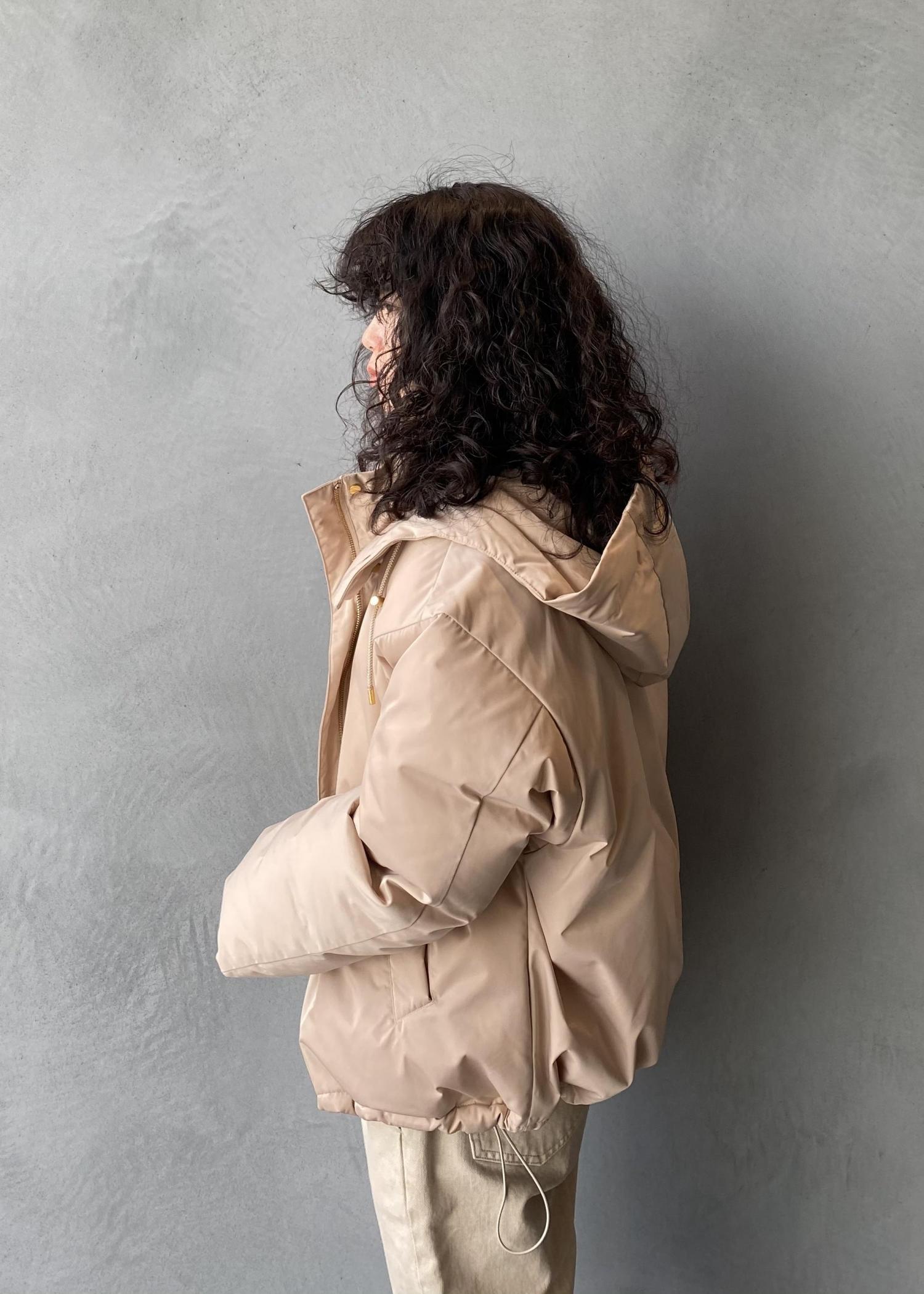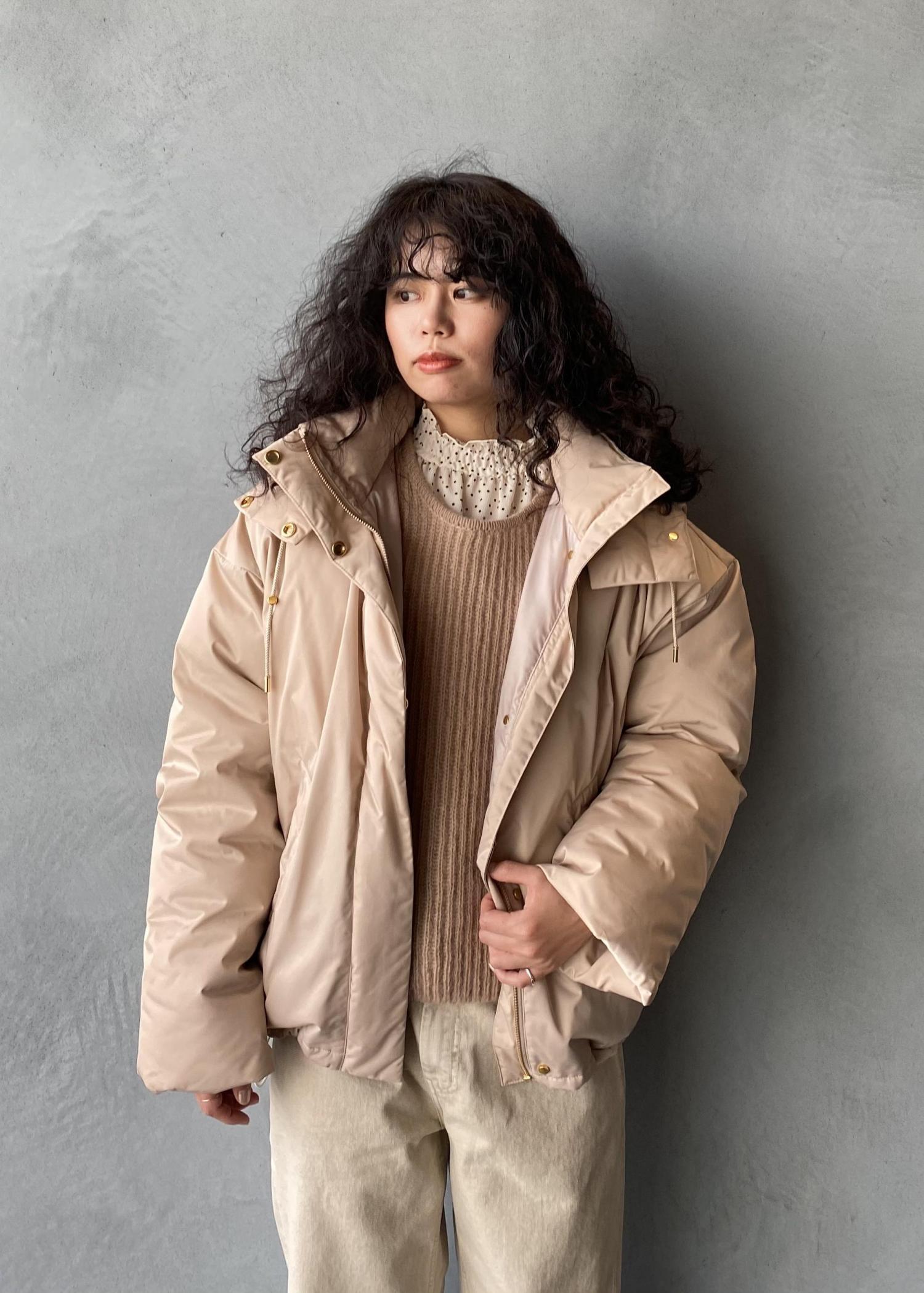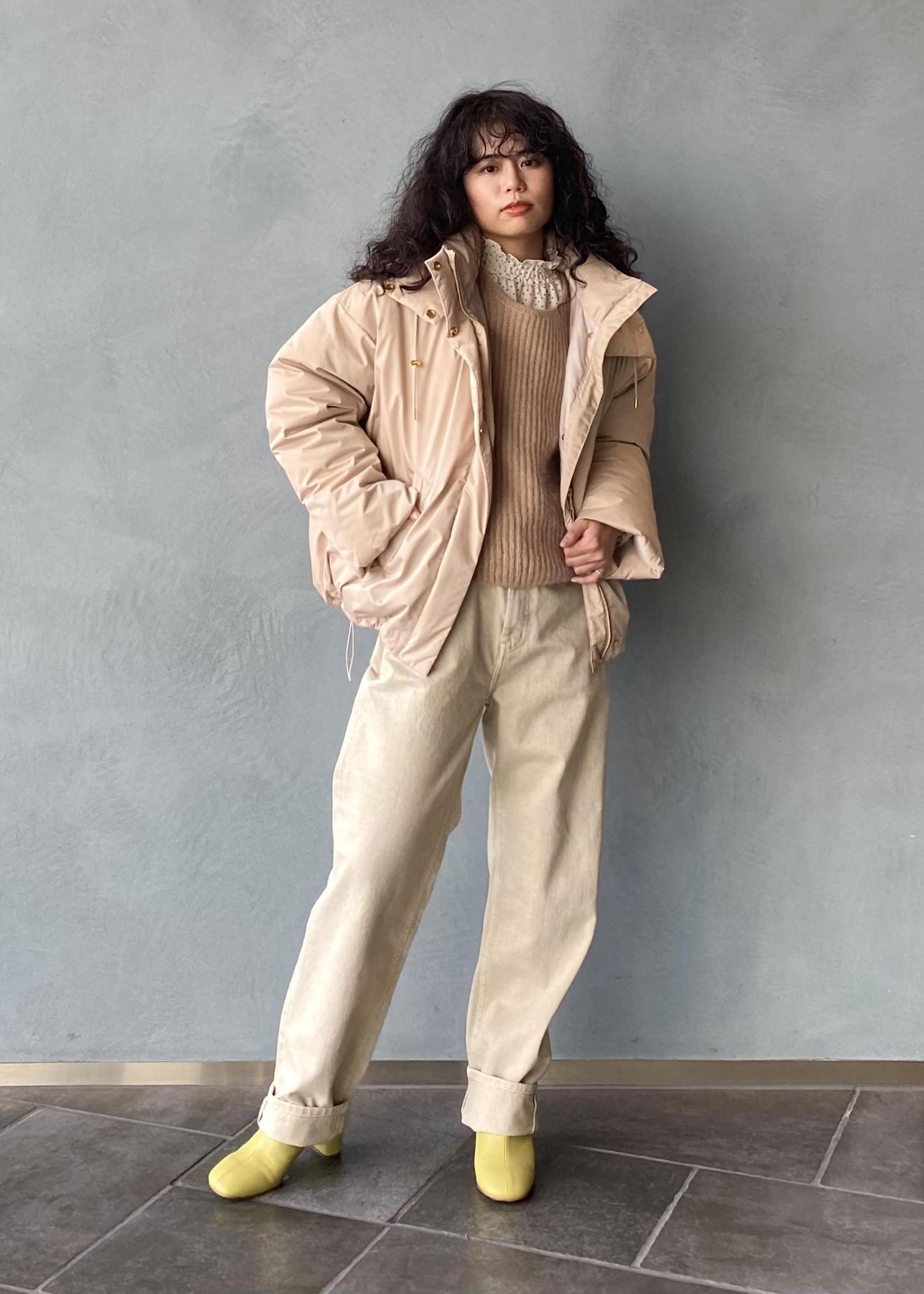 スポーティな印象があるダウンジャケットですが、クリーミーな色合いで揃えると柔らかい印象になります。