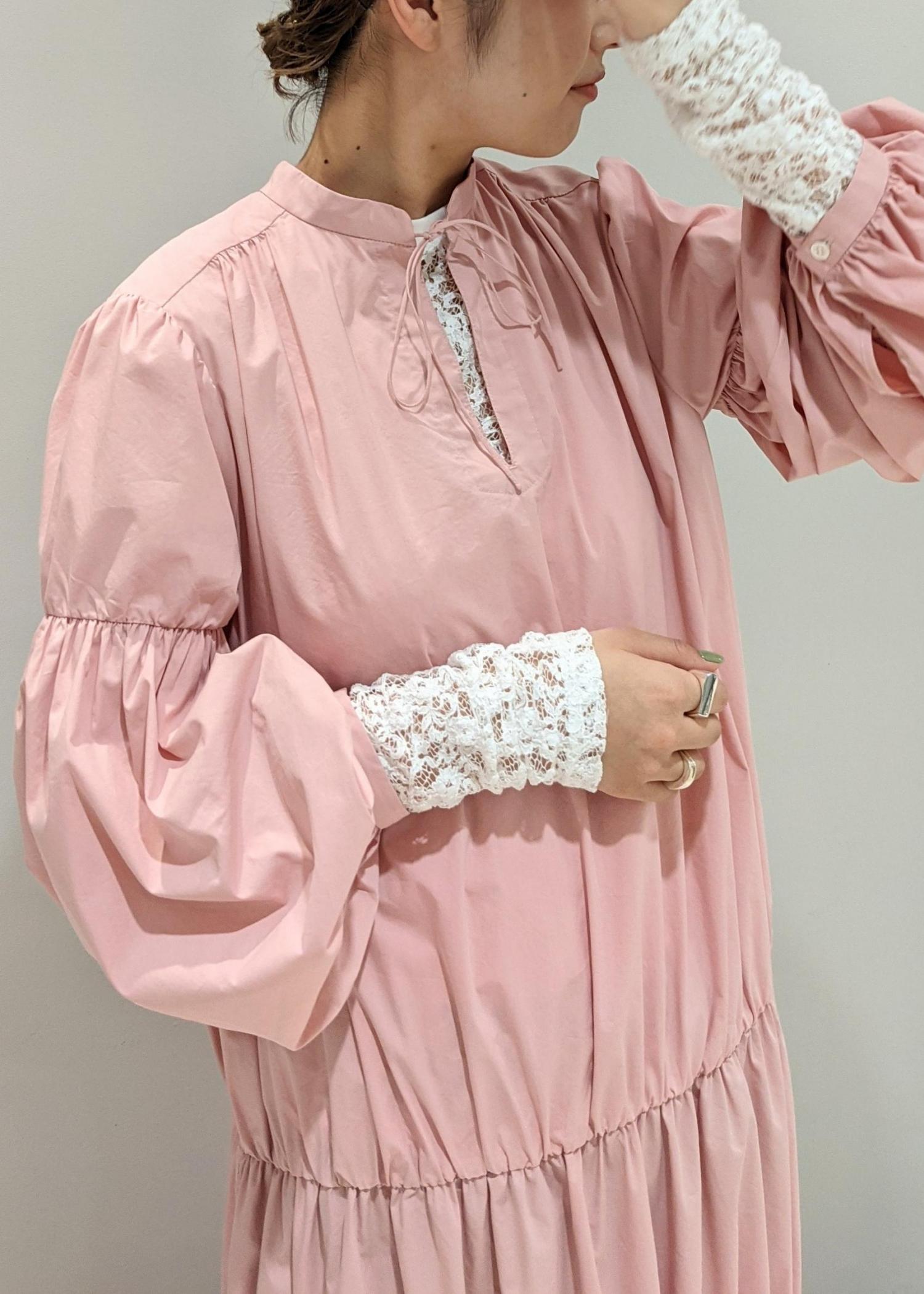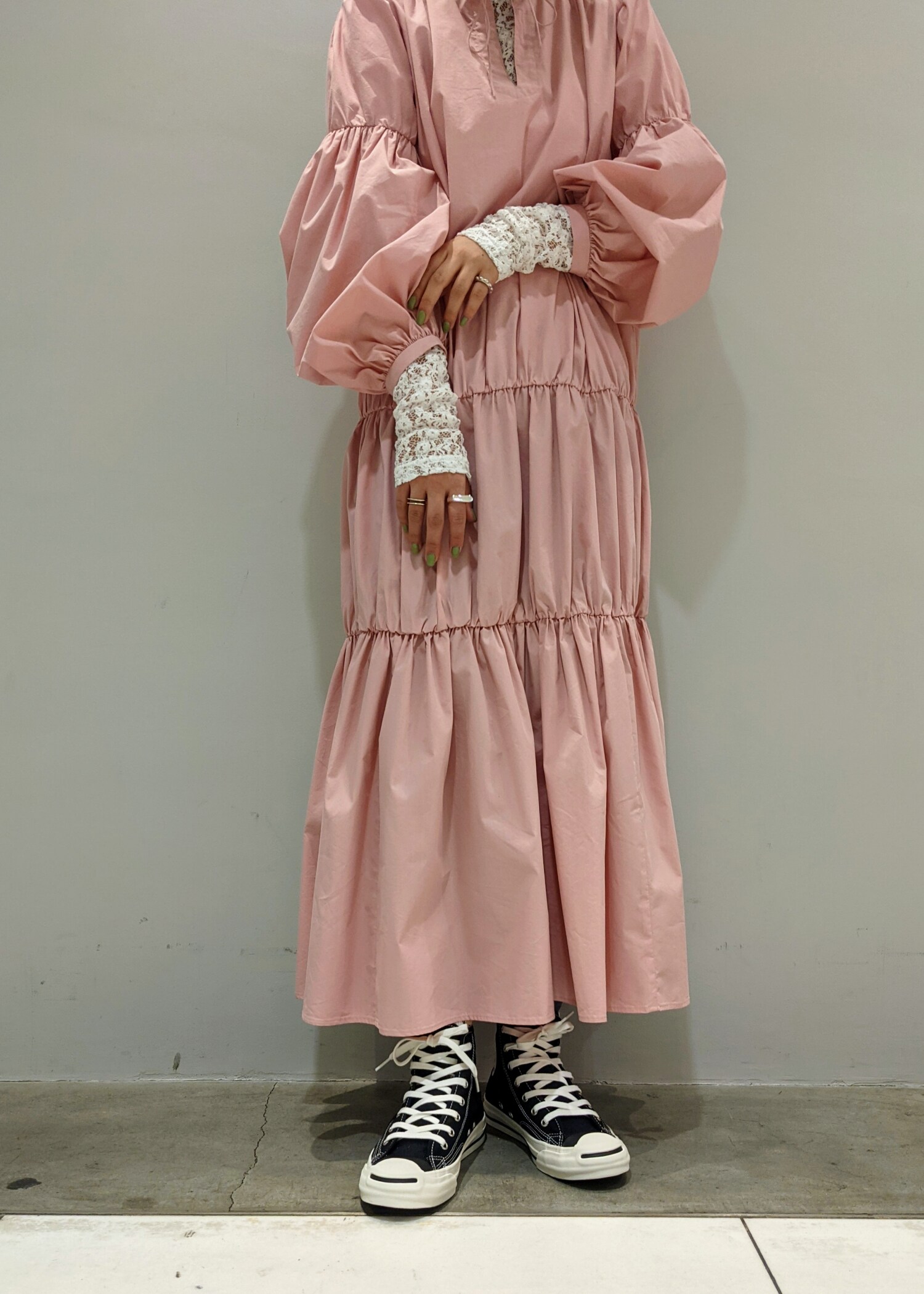 本日ご紹介するティアードワンピースはベージュ、ネイビー、ピンクの3色展開で春らしいカラー展開となっており1枚でとても華やかに着用できるワンピースでございます。