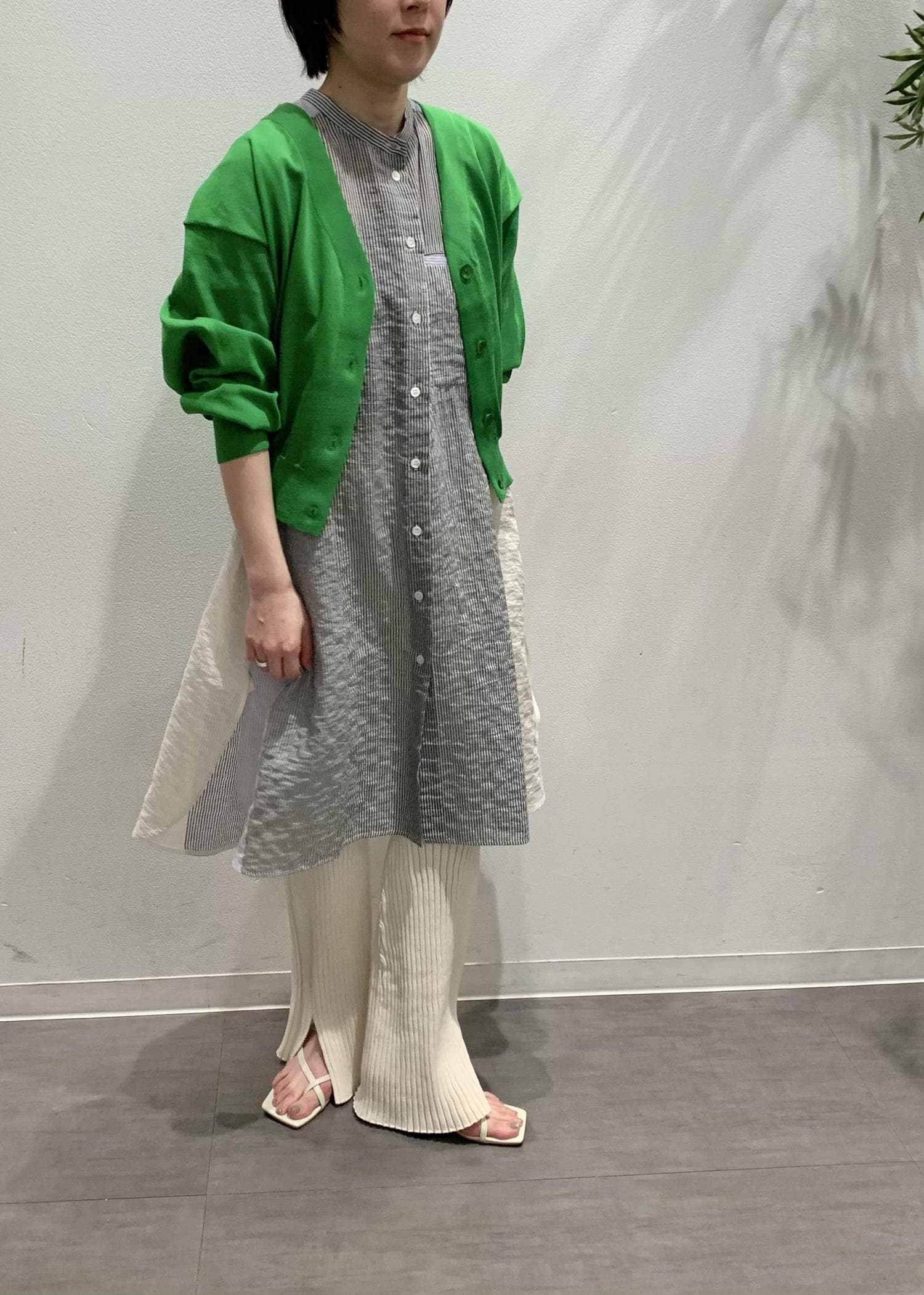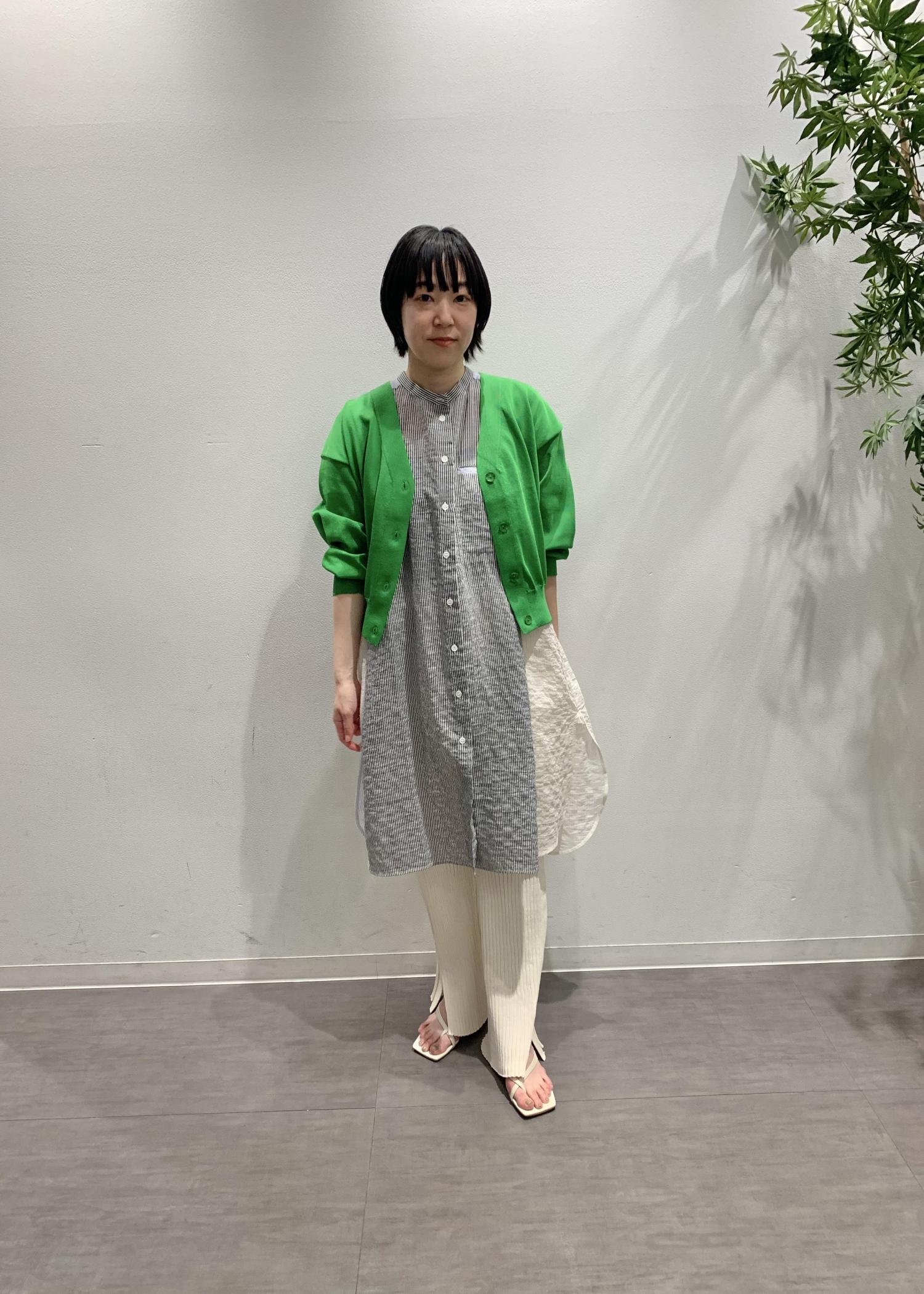 今回は、パッと気持ちを明るくするグリーンのカーディガンをポイントに夏に向けたスタイリングにしました。