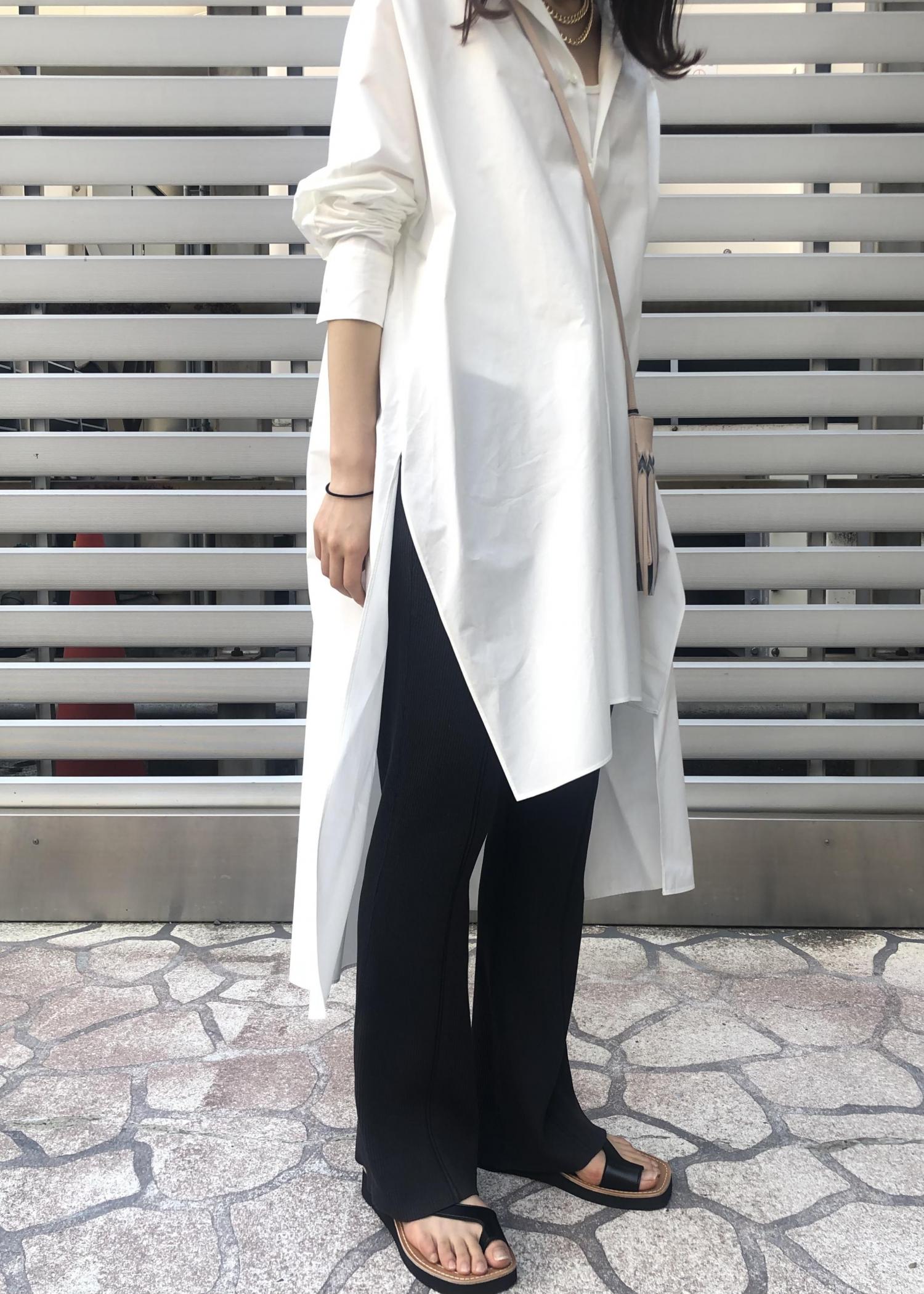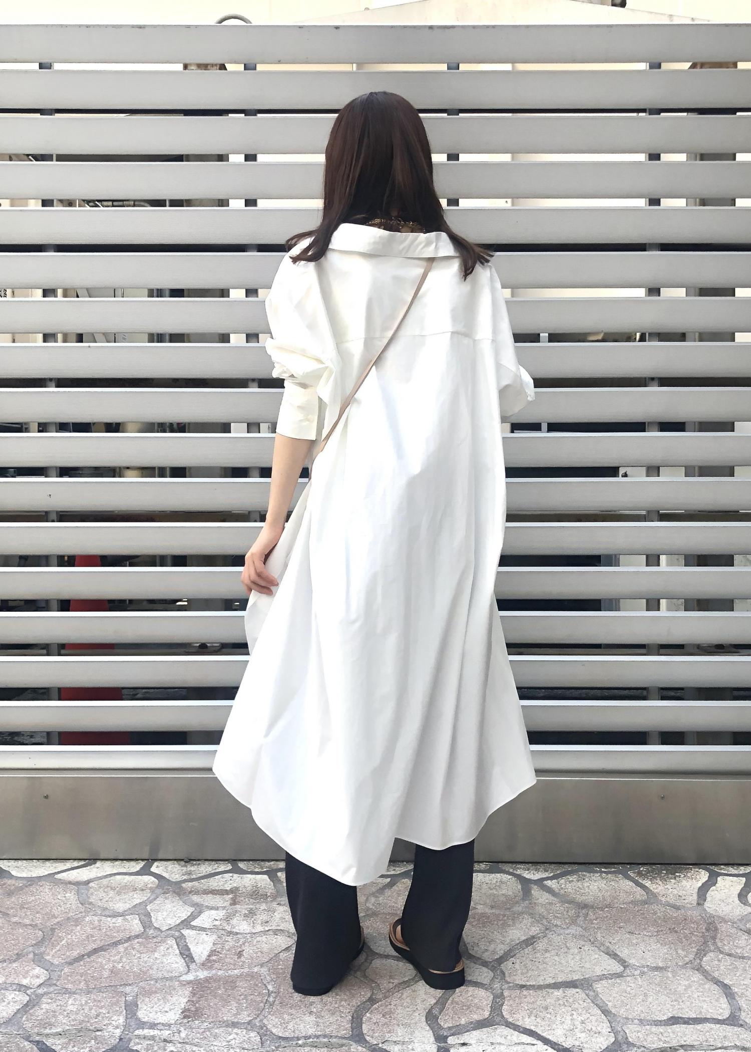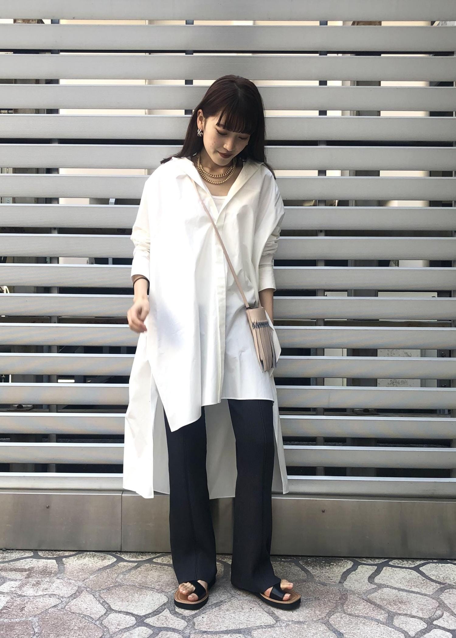 程よくハリのあるシャツワンピースは、インナーをキャミソールにし、ゆるっと着れるリブパンツと合わせる事で、ぬけ感のあるスタイリングに仕上がります◎