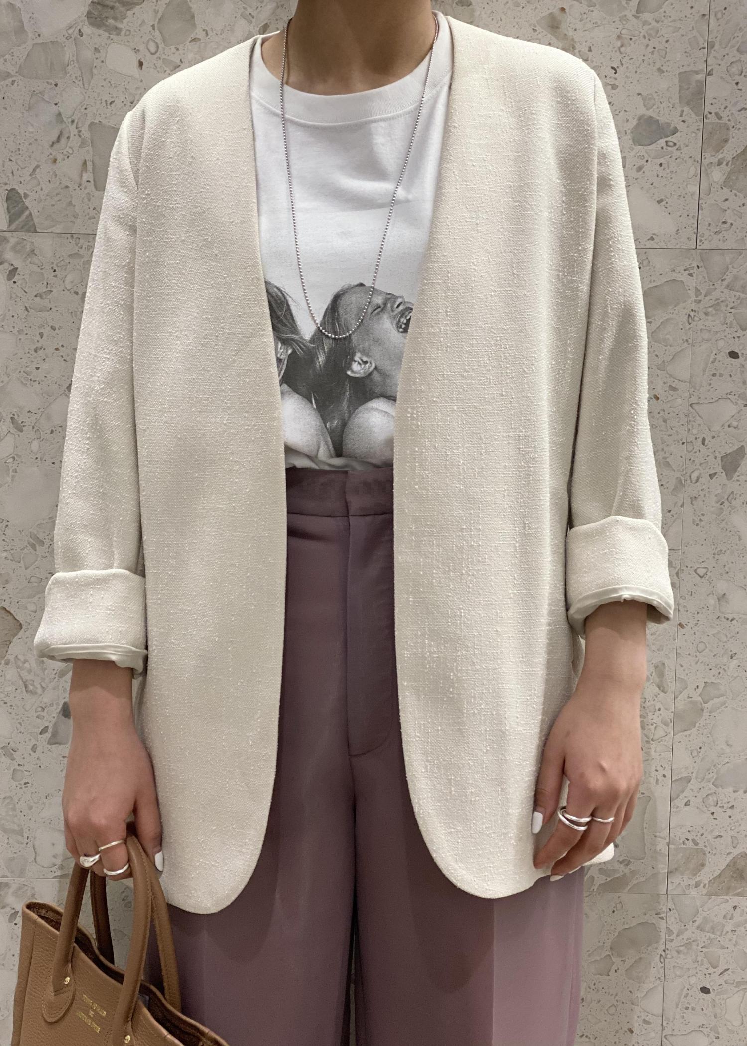 パンツ、スカートのセットアップで着て頂け、フォーマルな服装から普段着にも使える万能なジャケットです。