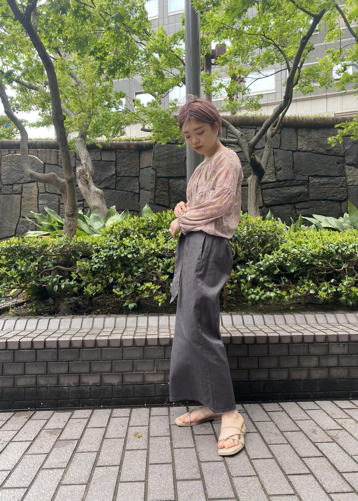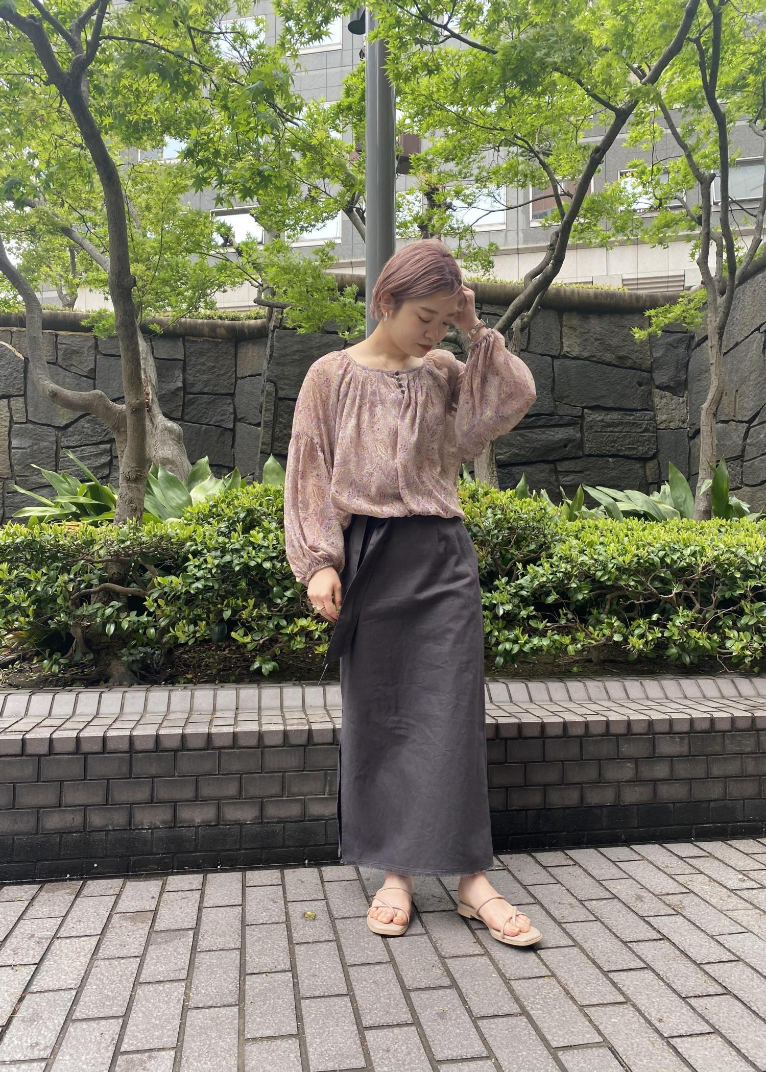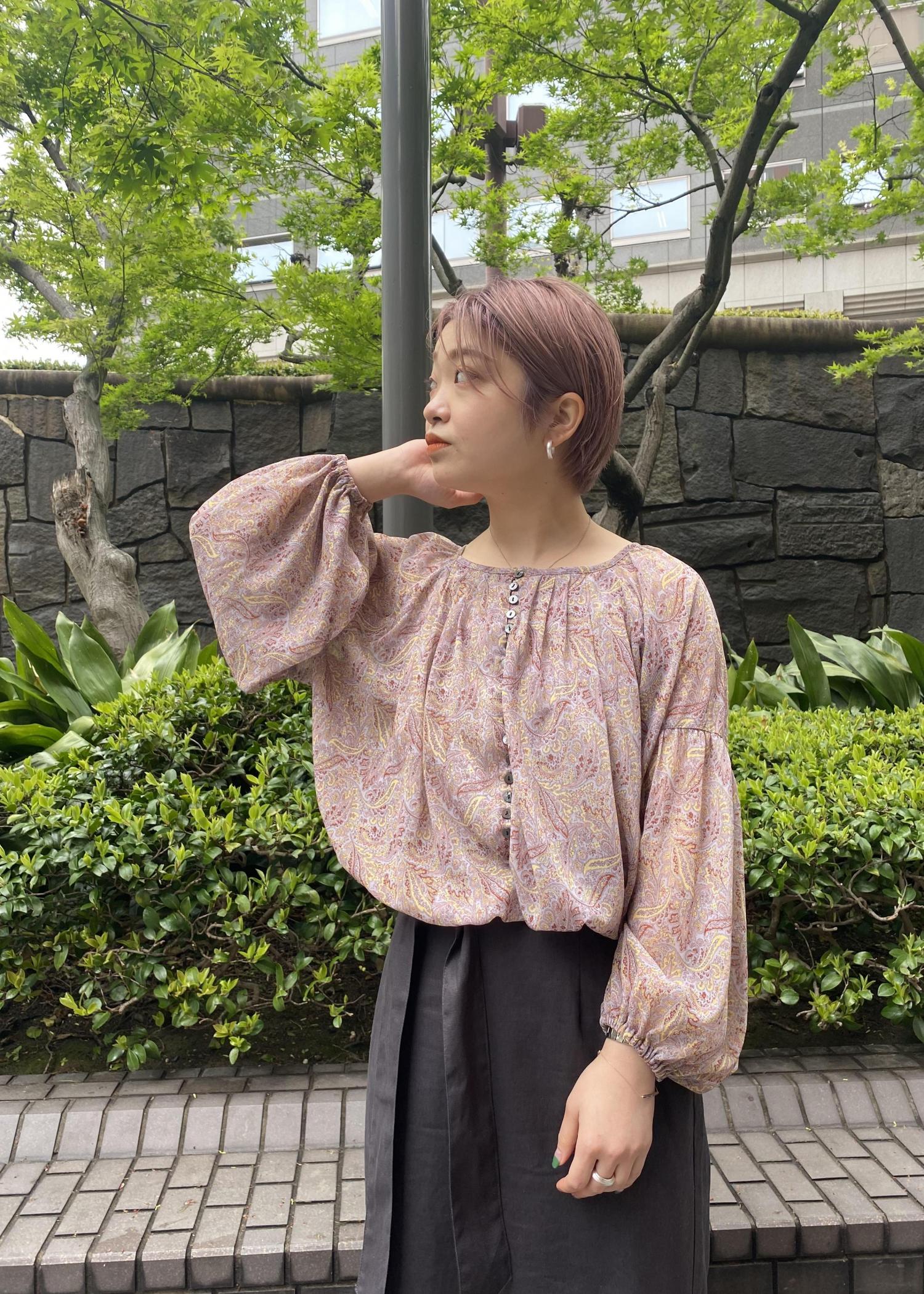 着丈が短く袖にふんわりボリュームのあるブラウスは